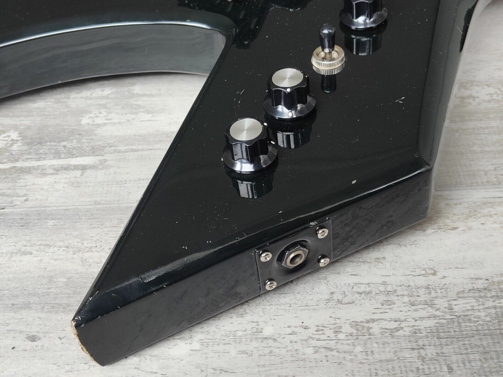Japanese made for the domestic market in the 1980's. Maple body with a gloss black finish bolted to a slim maple neck with a dark rosewood fingerboard (24 frets, 628mm scale length), it weighs 3.5kg's. Loaded with a Licensed Floyd Rose TRS-101 tremolo system, it looks to be all original with BC Rich humbuckers controlled by two volume knobs, a tone knob and a three-way pickup selector.