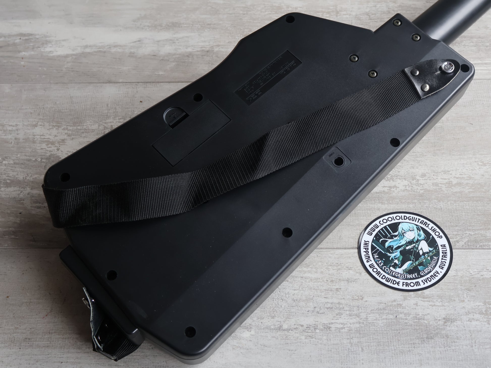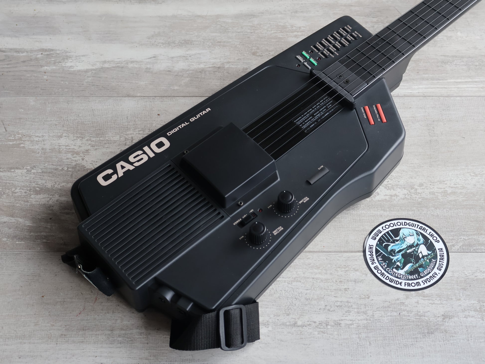 The Casio DG-1 was an "entirely new type of digital musical instrument which features the latest in state-of-the-art technology". Played with untuned nylon strings, the notes on the fretboard correspond to that of a guitar in standard tuning so it's a breeze to play.