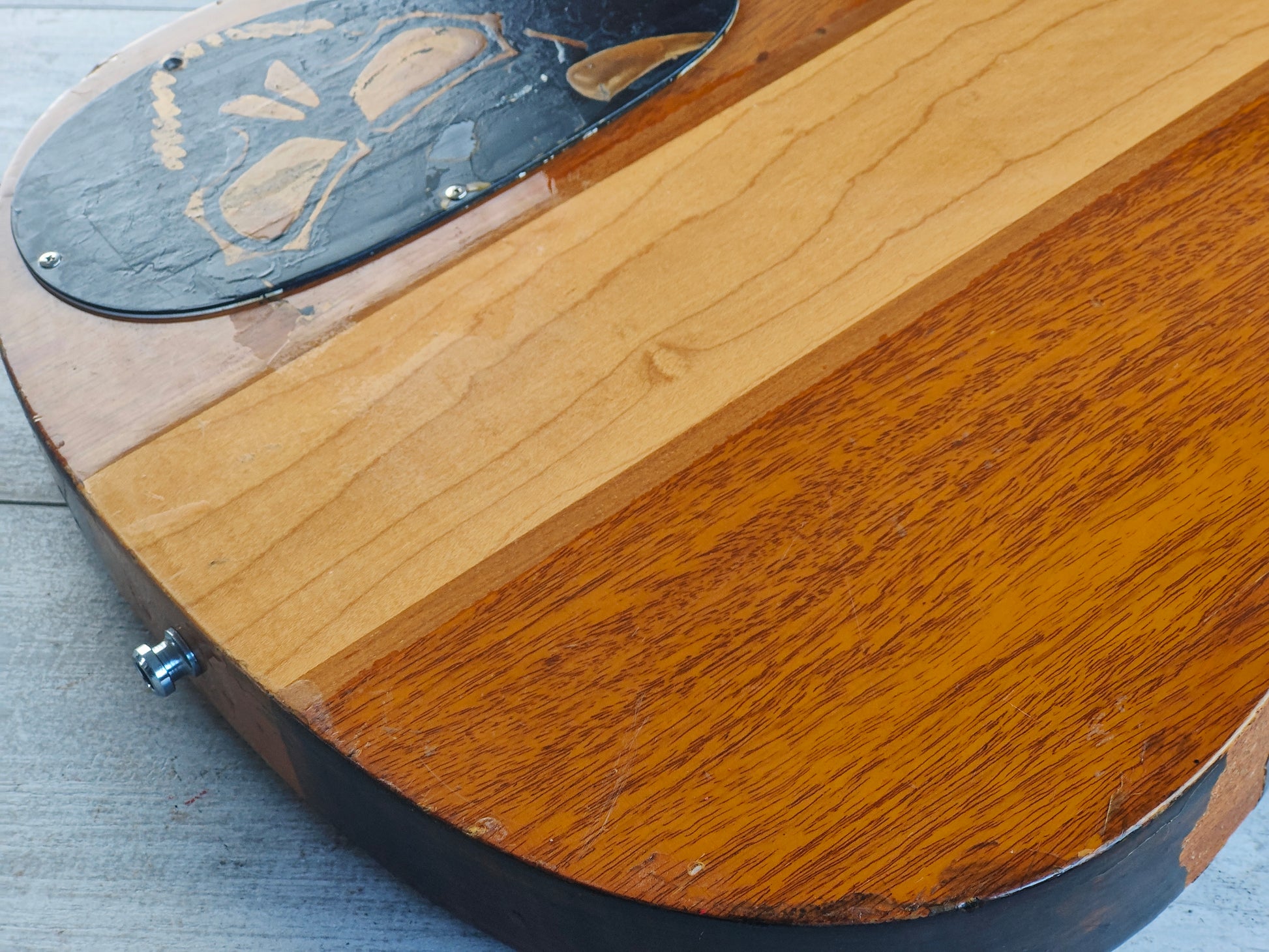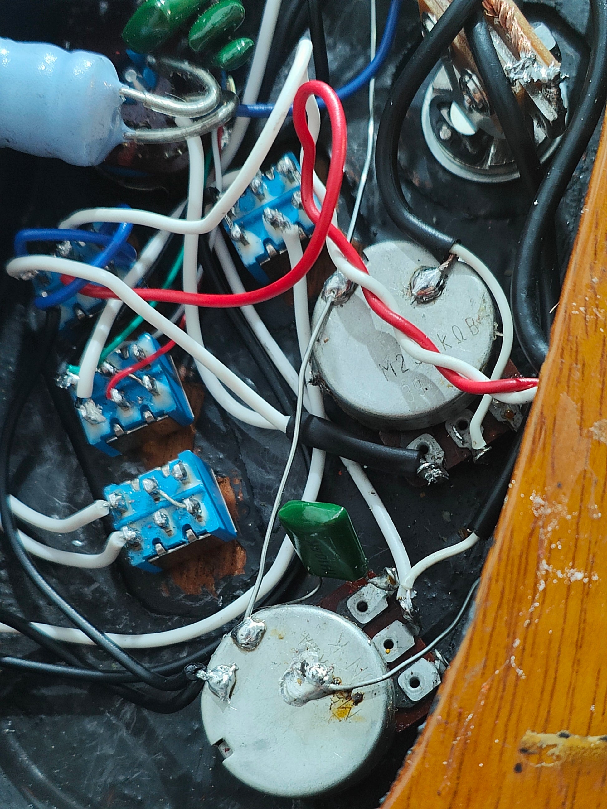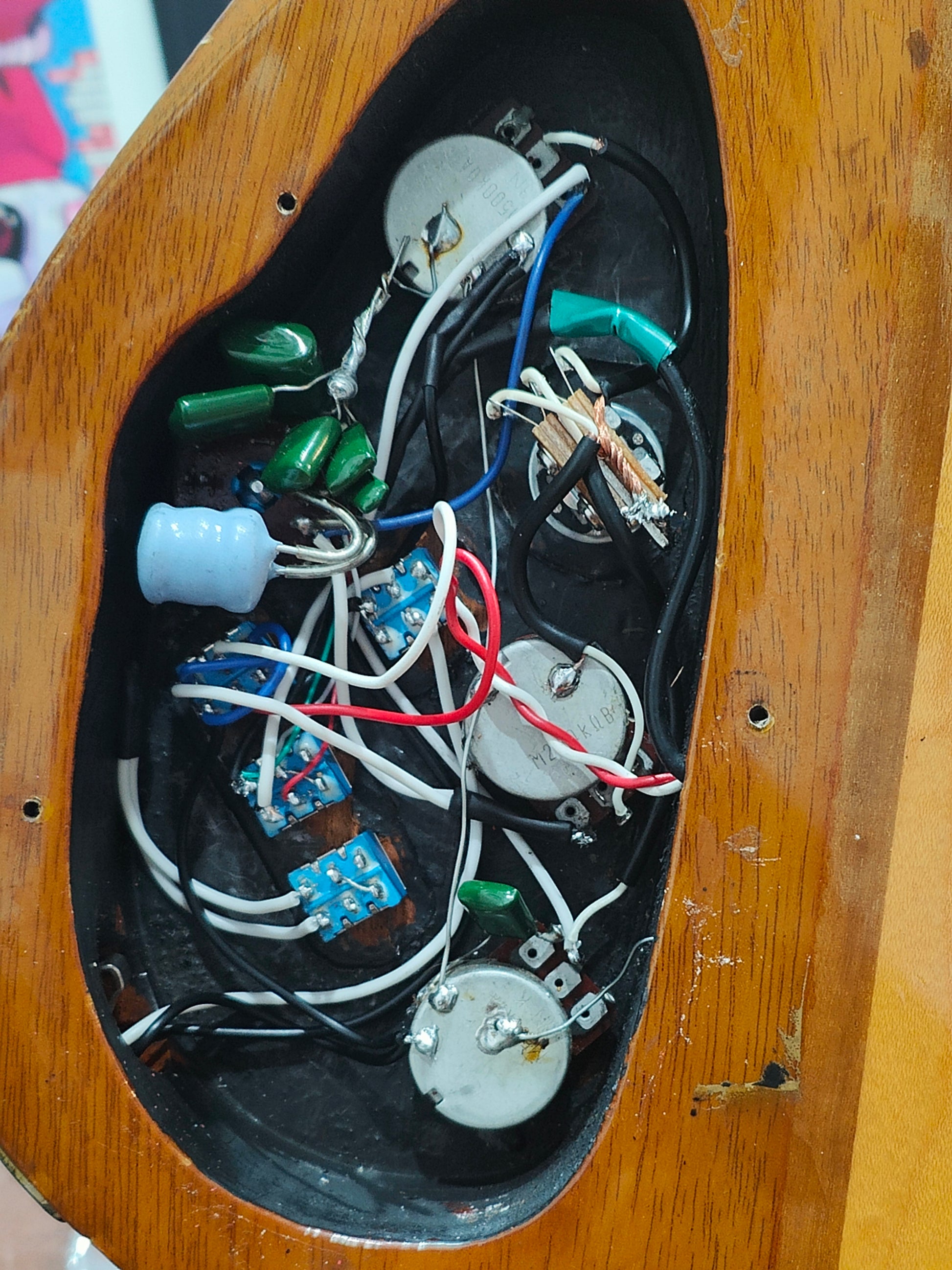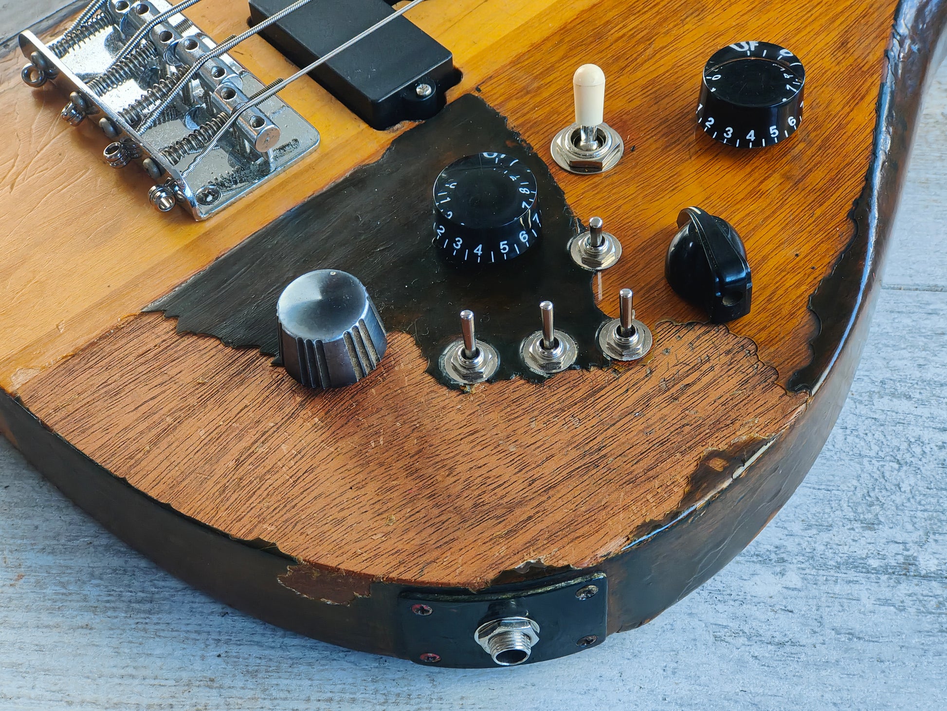 This one's been heavily used and heavily modded as pictured. The bridge pickup is a vintage Gotoh passive pickup, the bridge appears replaced and the electronics have been modified and replaced. The Varitone works as it should and both pickups sound great together with a few phase and coil splitting options on the toggle switches.