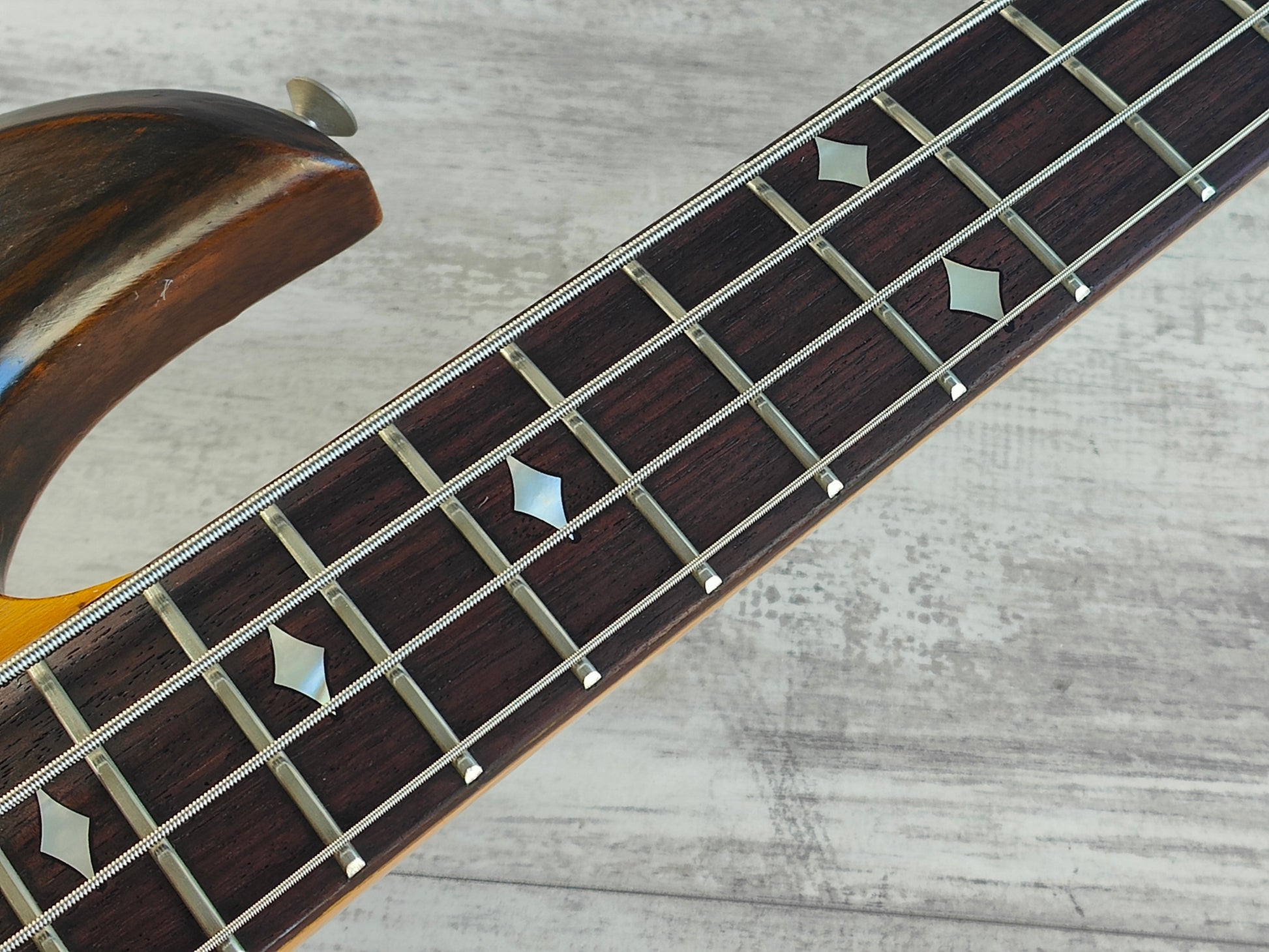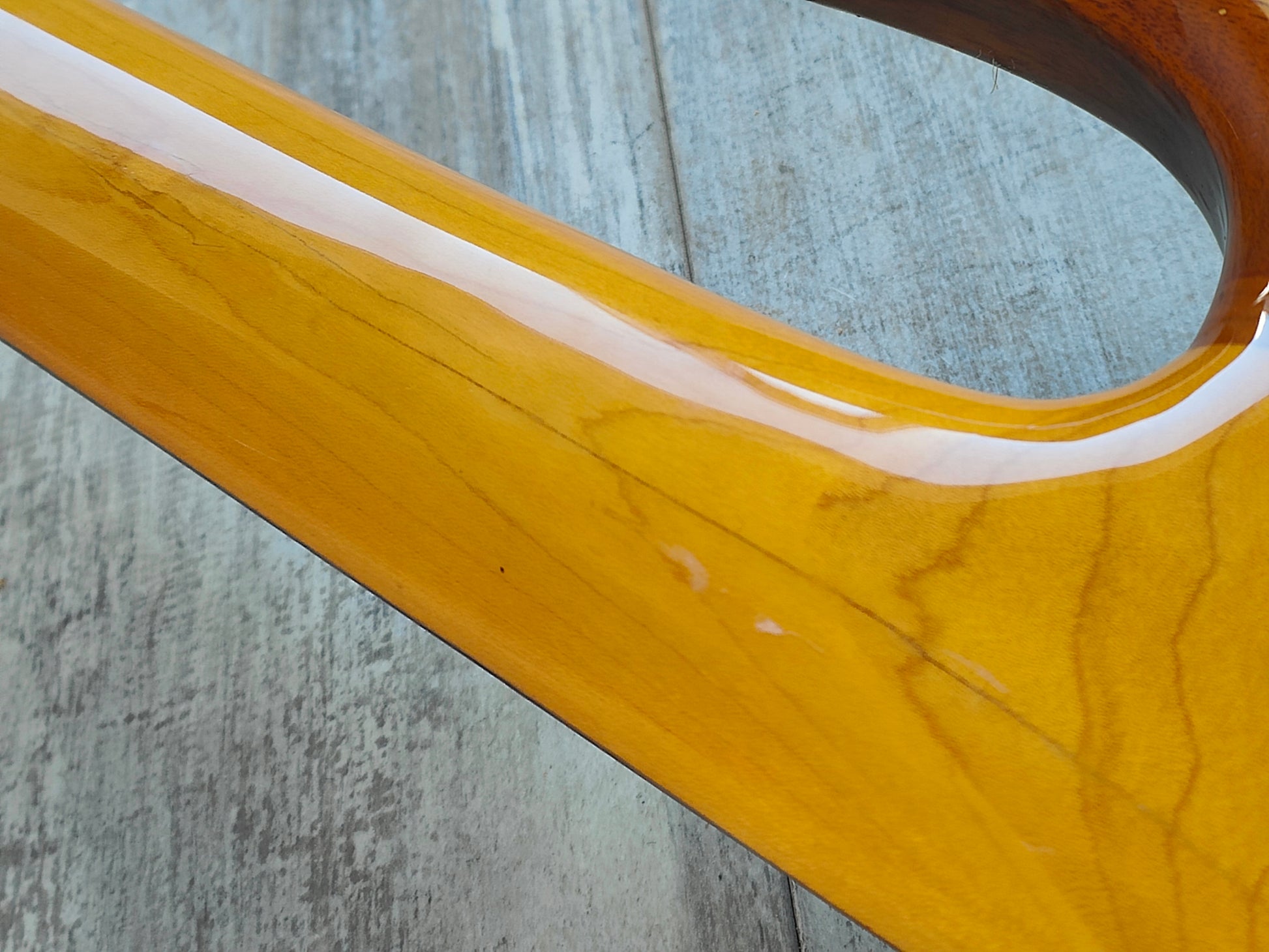 Made in Japan in the early 1980's, the EB-85 was Fernandes' Eagle Bass version of the BC Rich Eagle KOA models. Mahogany wings around a maple center with a maple neck and rosewood fingerboard (44mm nut width, 34" scale length), it weighs 4.3kg's.