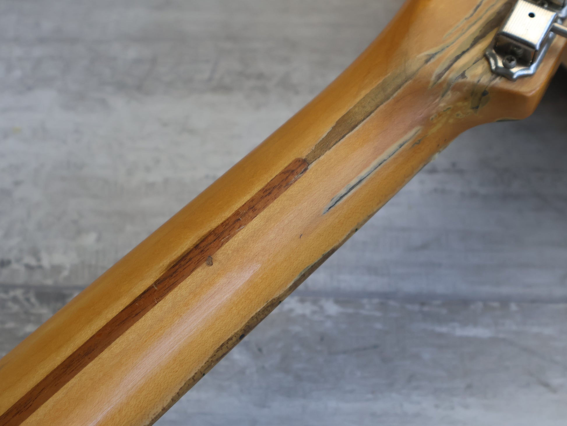 Let's talk condition. Obviously it's been heavily used over the years and was likely wet at some point but as it sits it's in pretty solid playing condition. The body and clear coat has plenty of shallow cracking that looks great, neck has been sanded smooth on the back and the fretboard has a load of beautiful wear. Both the back of the neck and the fretboard feel good in the hand, no real noticeable issues with either.