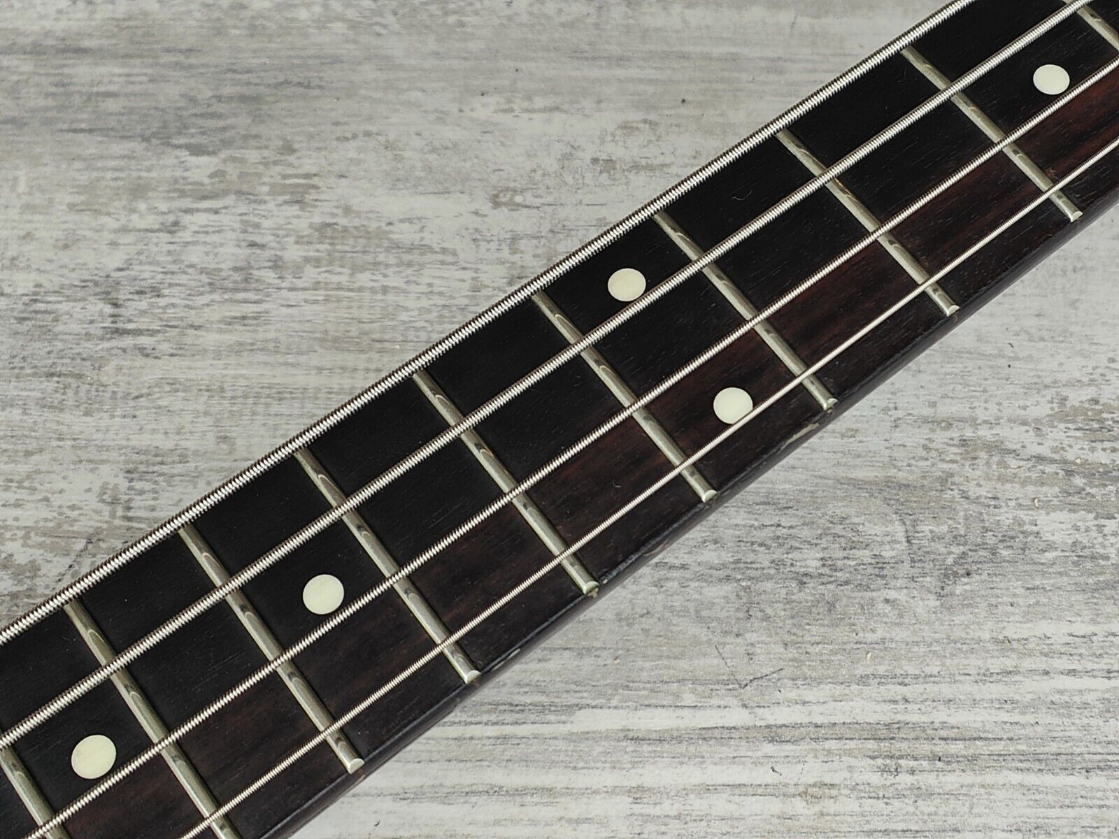 An unknown model imported from Japan, appears to be a Japanese build and is loaded with a pair of Japanese GOTOH humbuckers. Three volume controls (master and one for each pickup) work as they should.