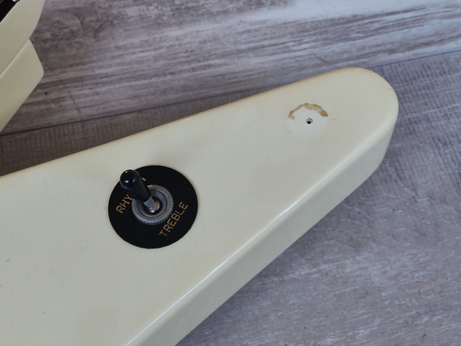 Good overall condition as pictured, has some holes in the top where it may have had either pickguard or mirrors installed at some point. Given a full restring and Floyd balance prior to listing.