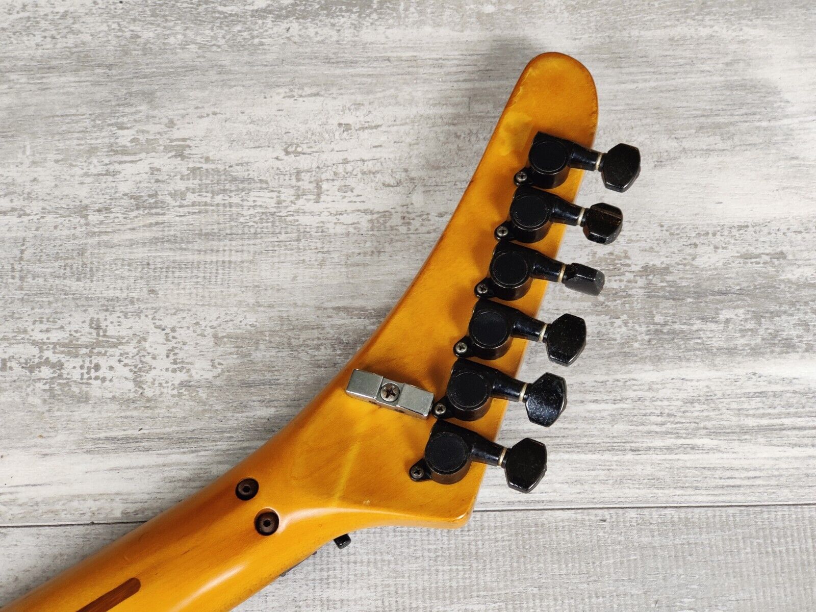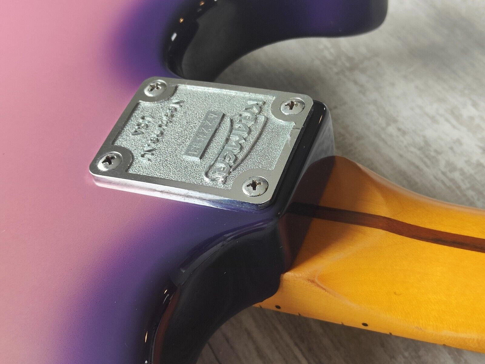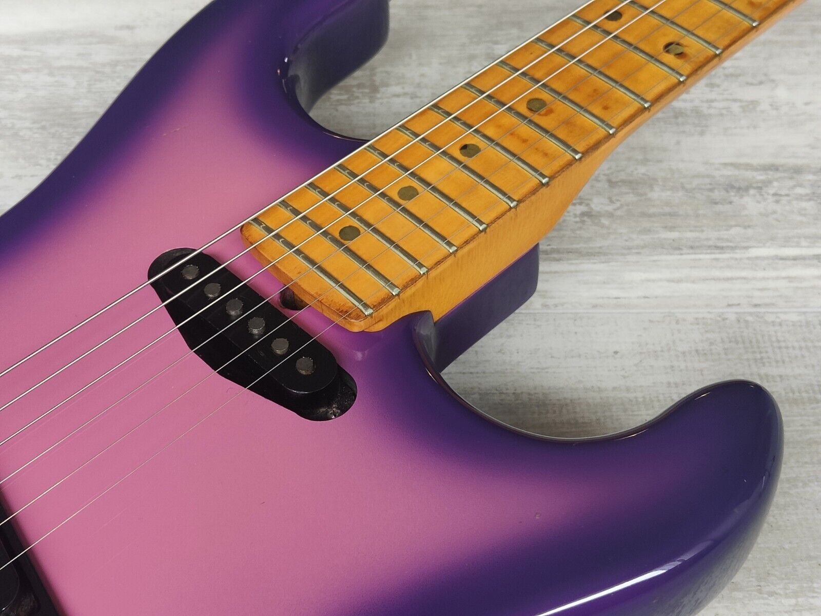 A Japanese market JK1000 made in the late 1980's, this is one of those guitars that i hate to be selling (but it's my job). Purpleburst finish on a maple body with a matching purpleburst banana headstock on the maple neck (22 frets, 648mm scale length), weighs 3.7kg's. Loaded with a genuine Floyd Rose locking tremolo and a pair of Jackson HS pickups controlled by a master volume knob and three-way selector.