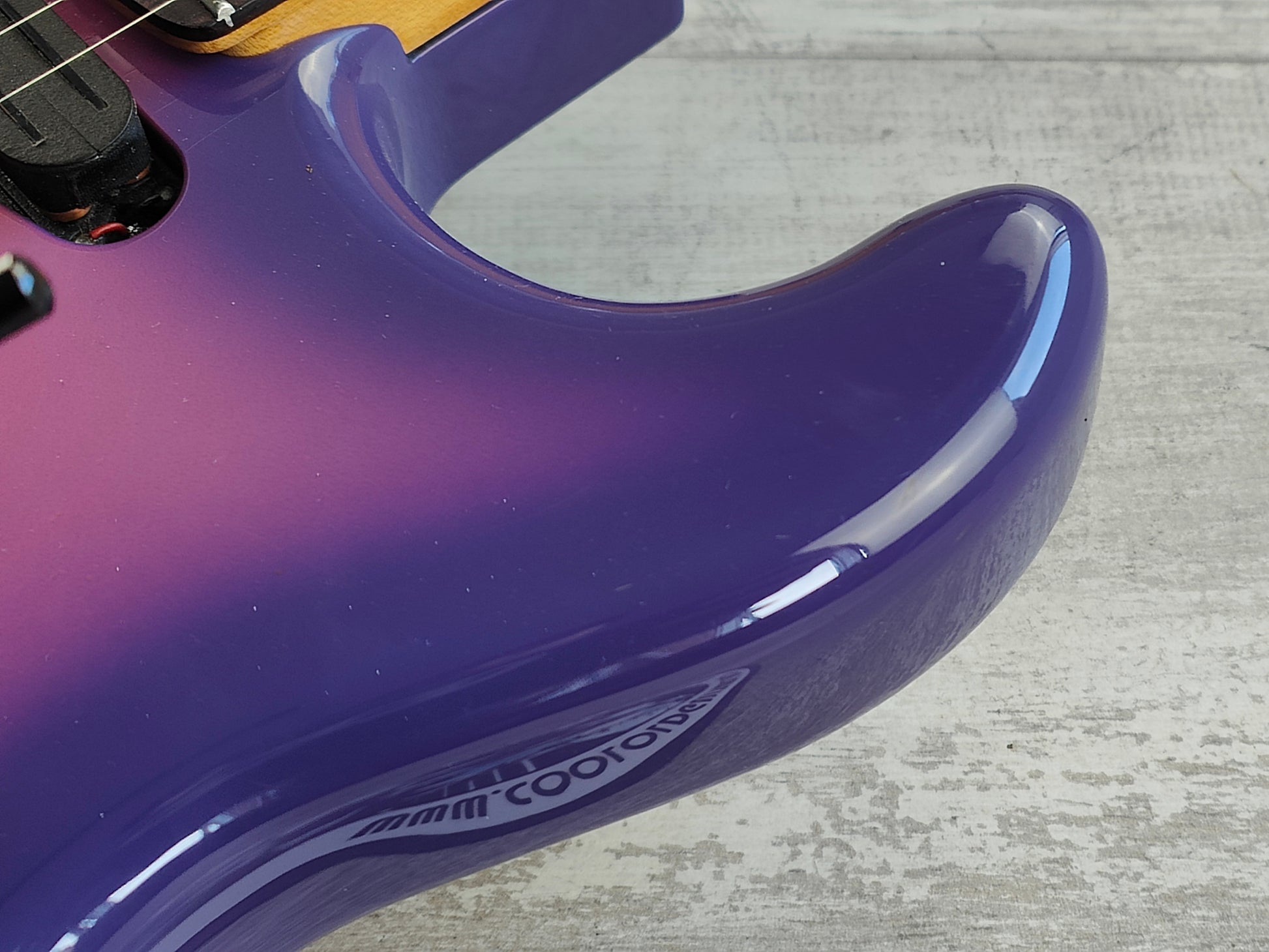Purpleburst finish on a maple body with a matching purpleburst banana headstock on the maple neck with a rosewood fingerboard (22 frets, 648mm scale length), it weighs 3.8kg's. Loaded with a genuine Floyd Rose locking tremolo with an unknown Dimarzio humbucker in the bridge position and an unbranded rail humbucker in the neck controlled by a master volume knob, a push/pull pickup selector and a mini killswitch toggle.
