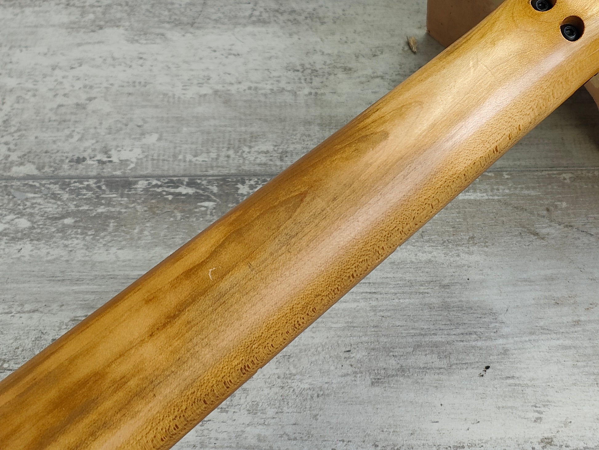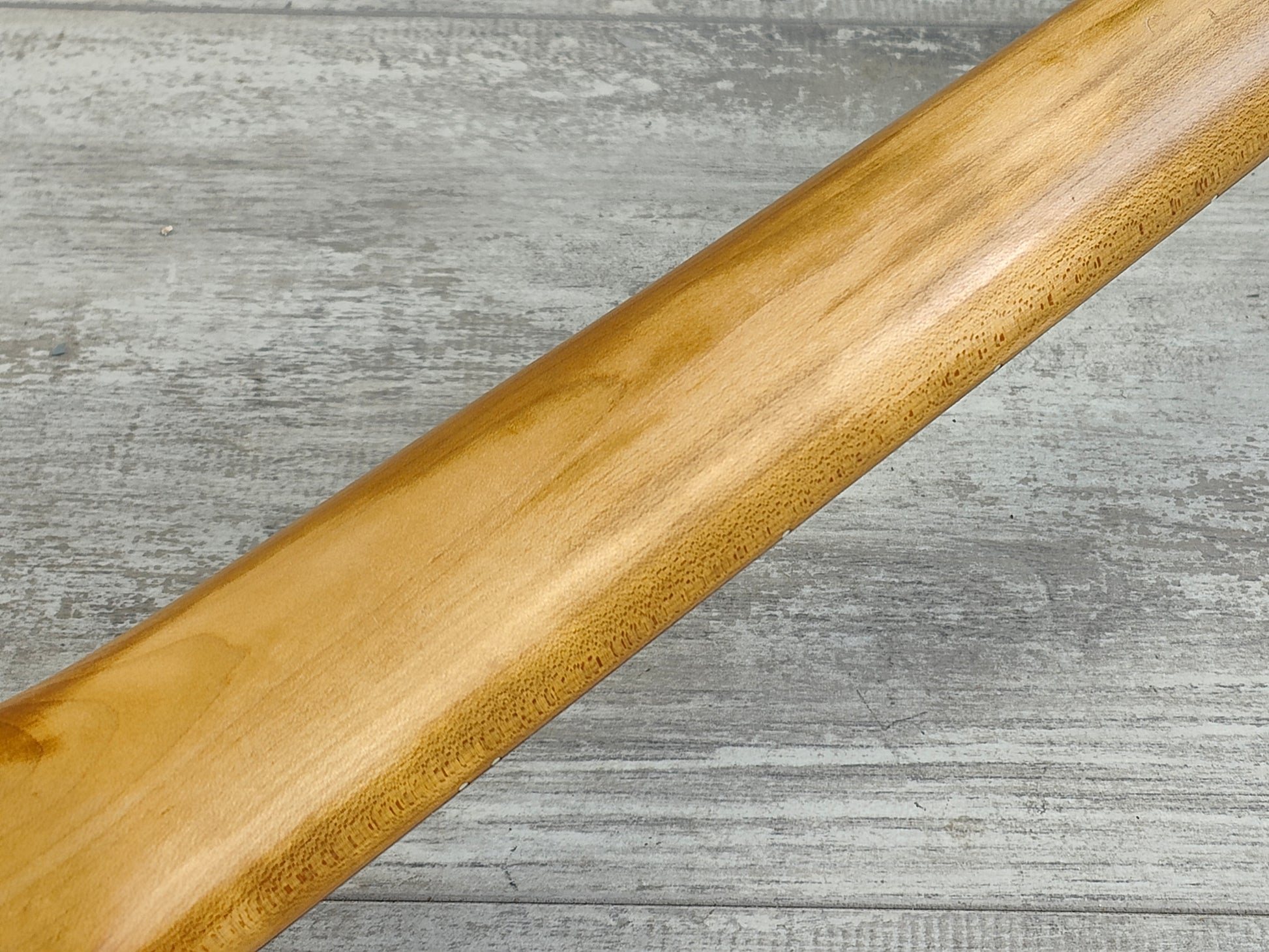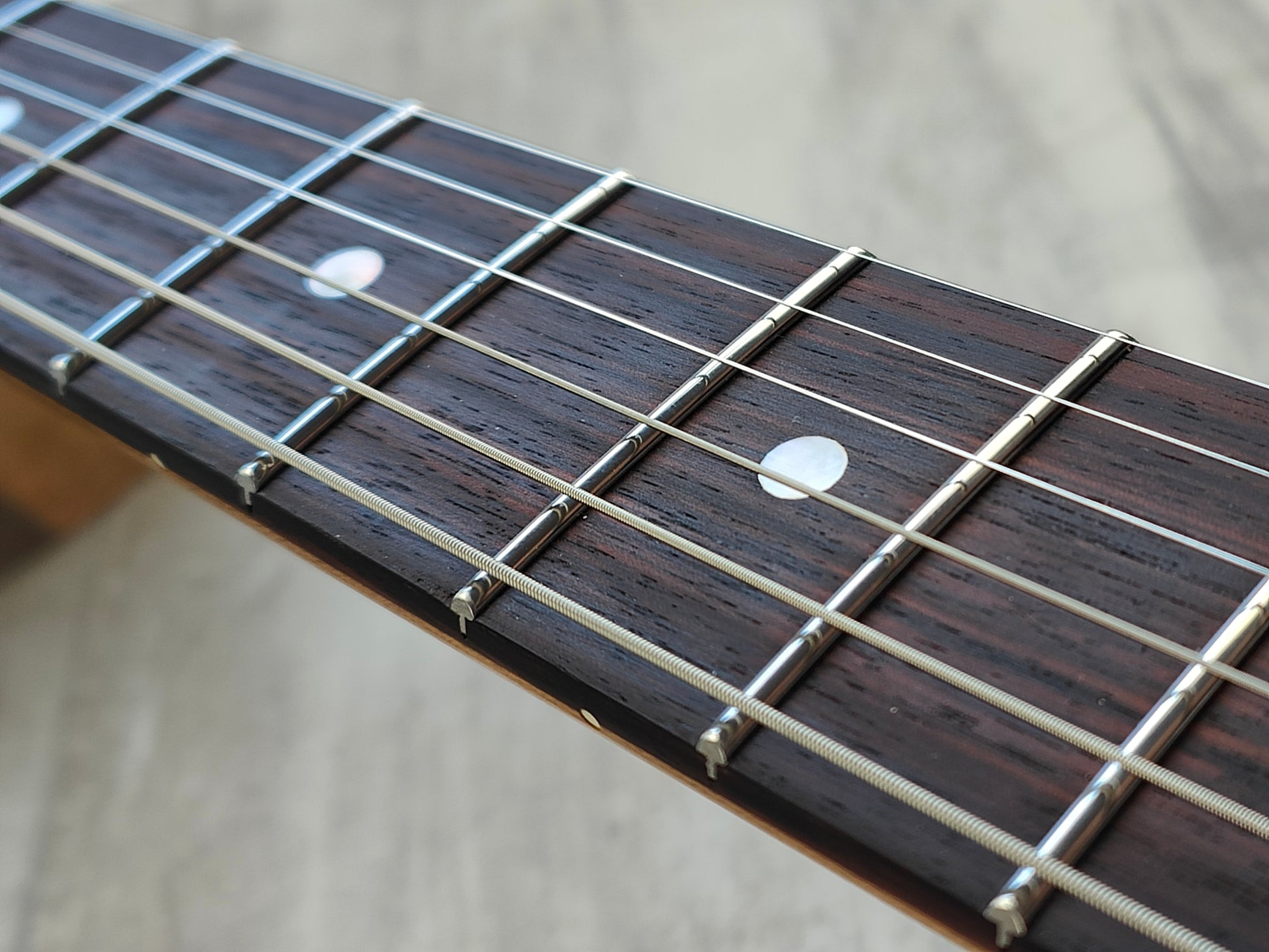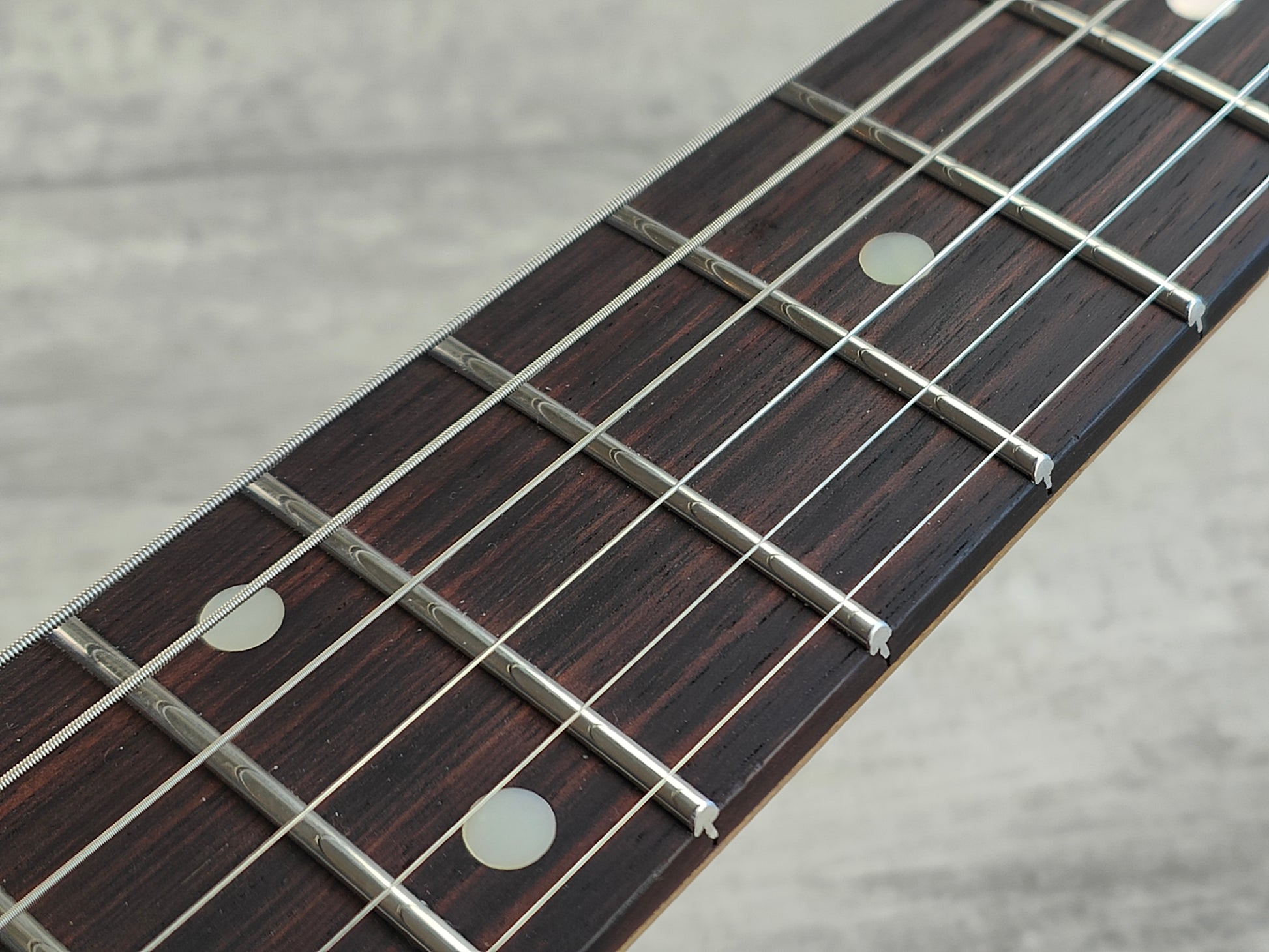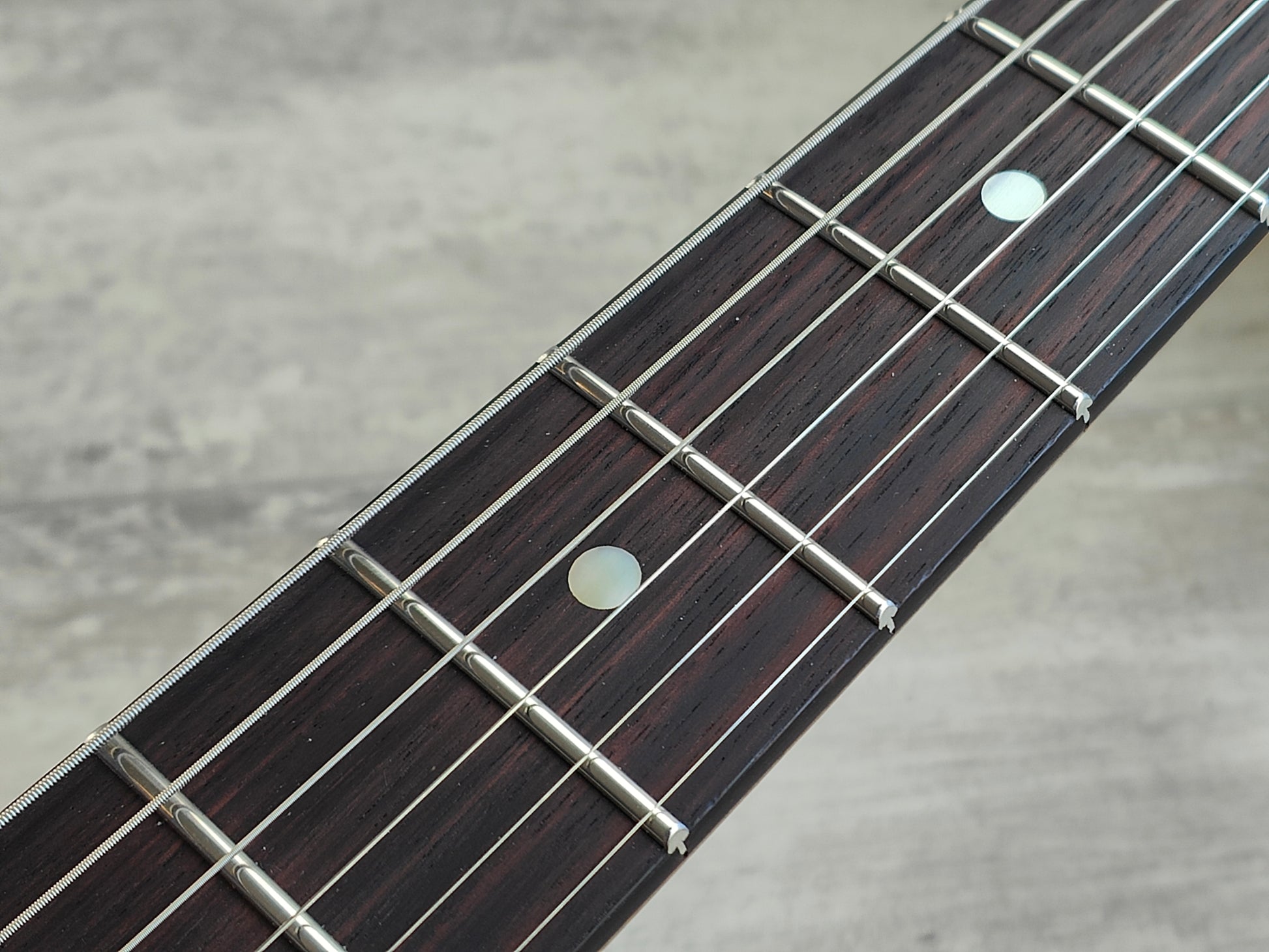 This one received a full professional setup and service by Mick while he was in Sydney including a refret with Jescar stainless steel medium jumbo frets. The board was perfectly levelled to a 16" radius and it plays beautifully with a set of Ernie Ball 9-46's.