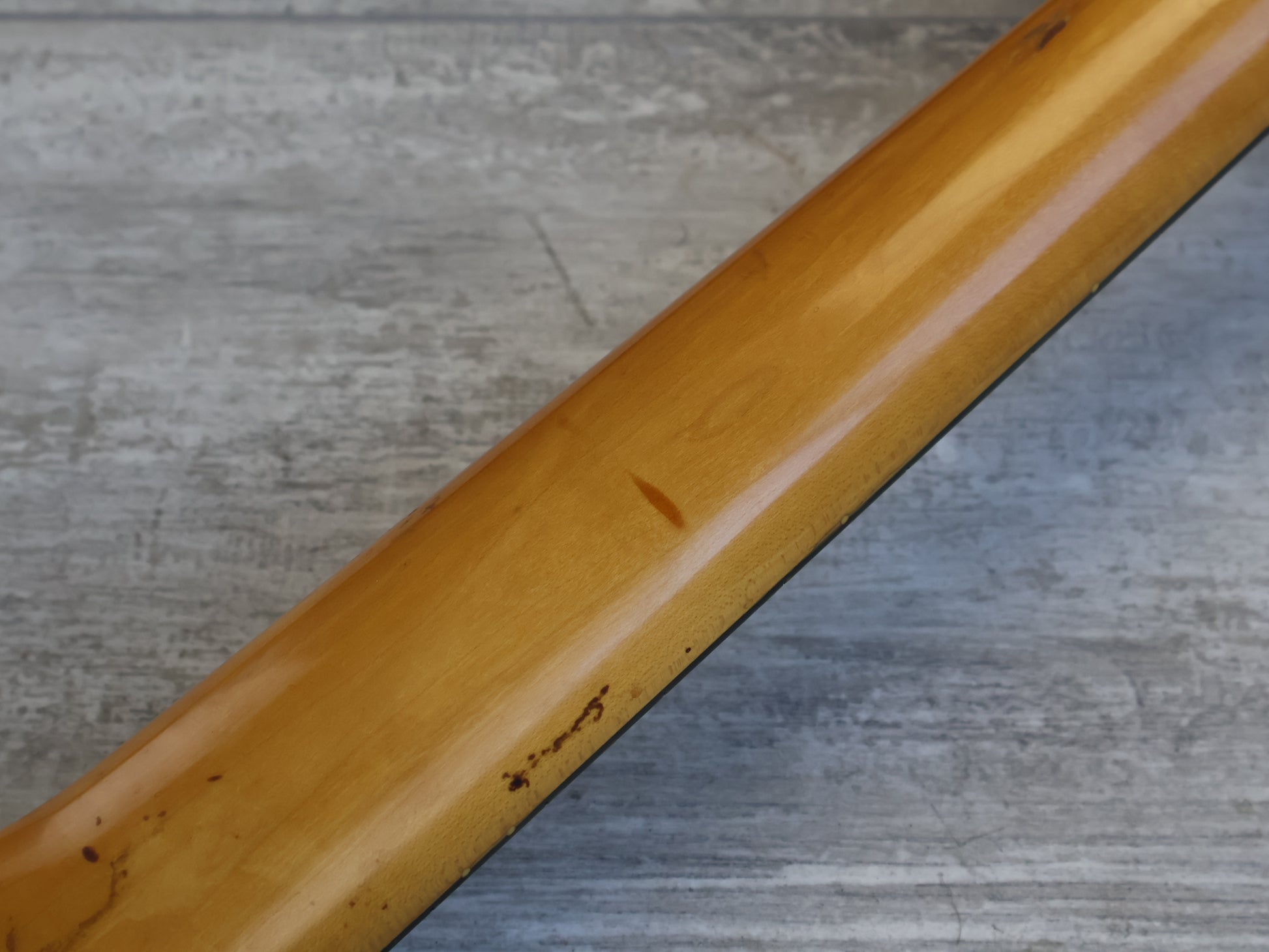This one seems to be an early custom order (based off the neck stamps and ESP pot codes), built with a one piece ash body wearing a thin three-tone sunburst finish, maple neck and what looks like an ebony fretboard (39mm nut width), it weighs 4kg's. Has the Moon logo stamped on the neck heel but no logo on the headstock, seems to have aftermarket knobs and the original Seymour Duncan IR stickered pickups.