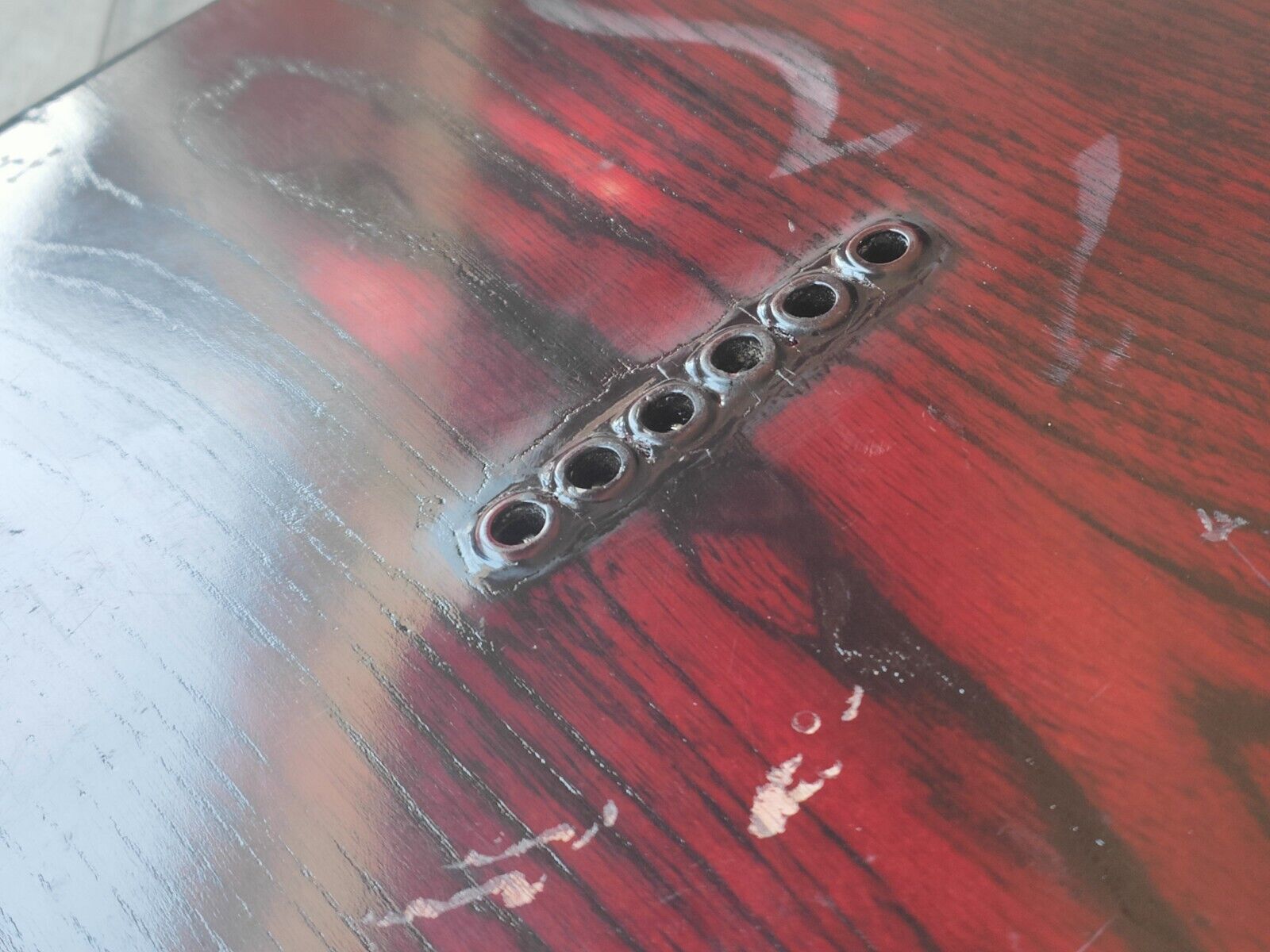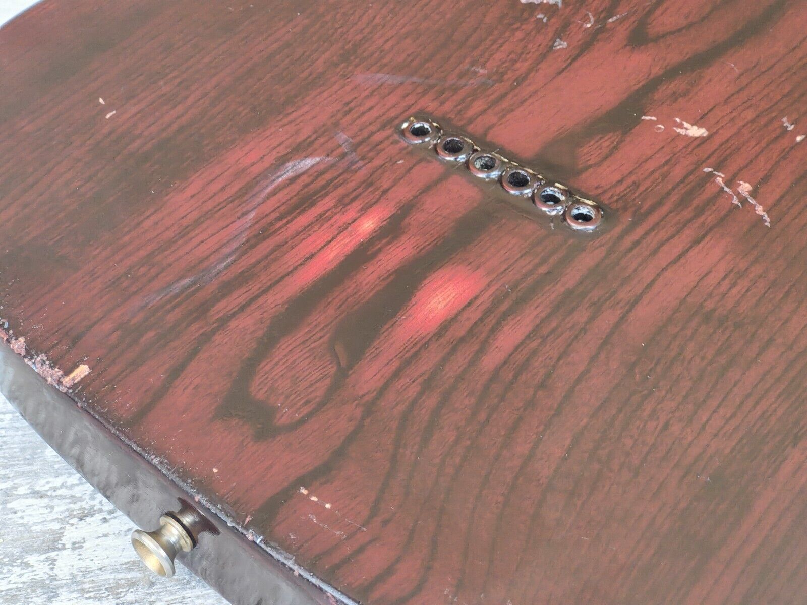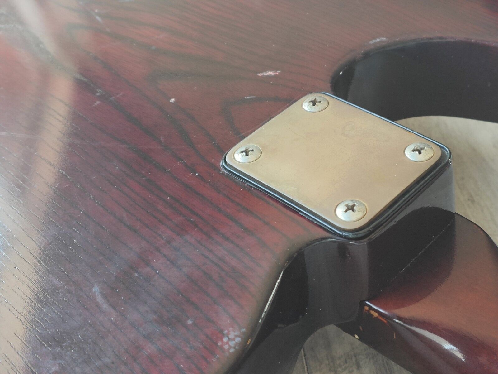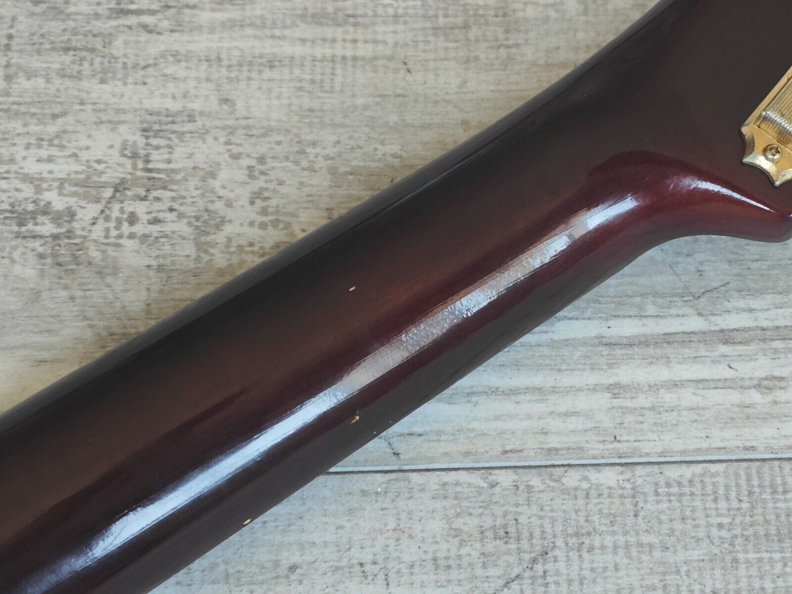 Made in Japan in the 1980's, this was one of Moon's custom order models replicating the Schecter Dream Machine series. Made with a lacquer stained one-piece ash body bolted to a mahogany neck with a 22 fret rosewood fingerboard (648mm scale length, 9.5" radius), it weighs a hefty 4.2kg's. Loaded with a pair of aftermarket Schecter-style vintage Gotoh pickups (as it didn't have any when it arrived with us) along with a new set of pots and a new three-way selector (as the originals were too far gone to salvage).