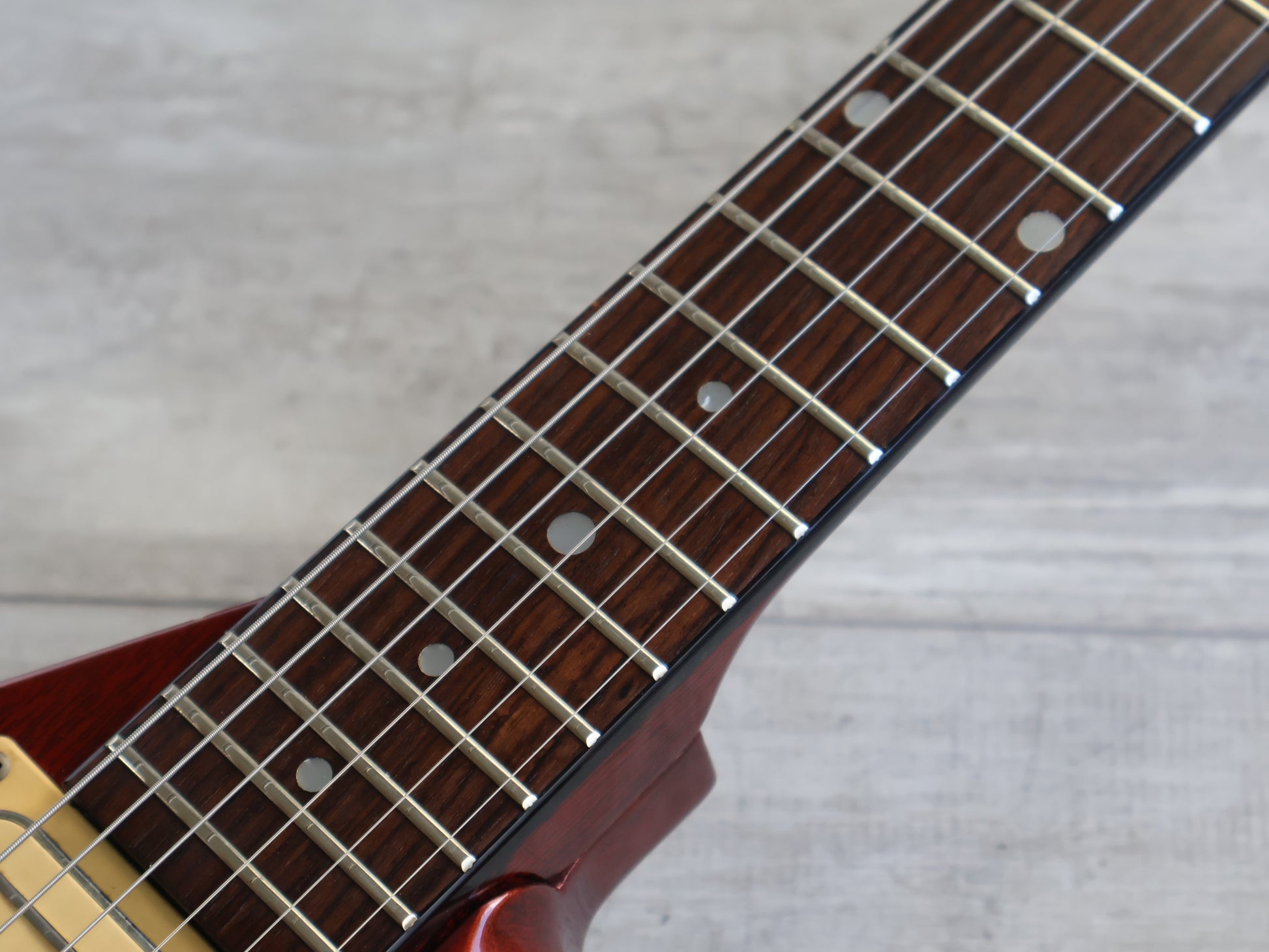 Made in Japan in the 1980's, this seems to be a very limited production (or possibly one-off) Morris replica of the HS Anderson "Kite" guitar. Solid mahogany body with a mahogany neck and rosewood fingerboard (41mm nut width, 628mm scale length), it weighs 2.9kg's. Loaded with a pair of Bill Lawrence rail humbuckers, Schaller tuners and an intonate-able wraparound tailpiece, it looks to be all original as pictured.