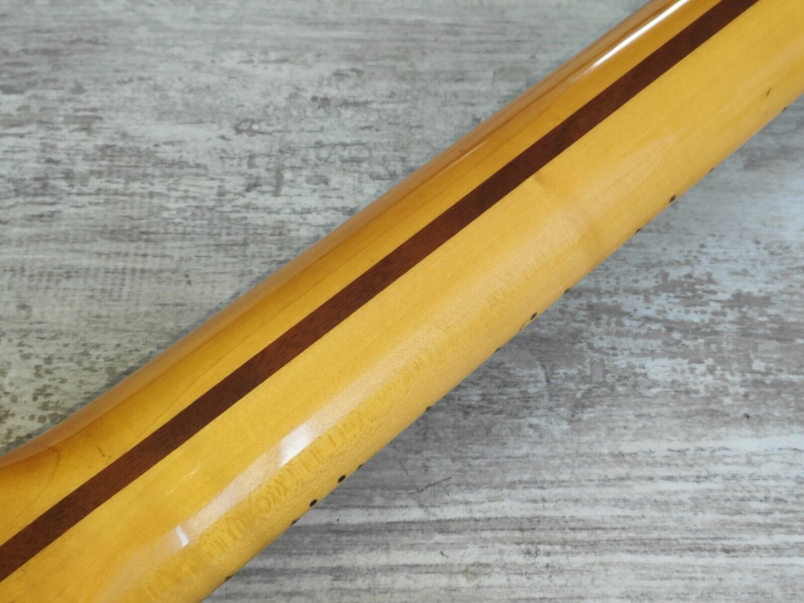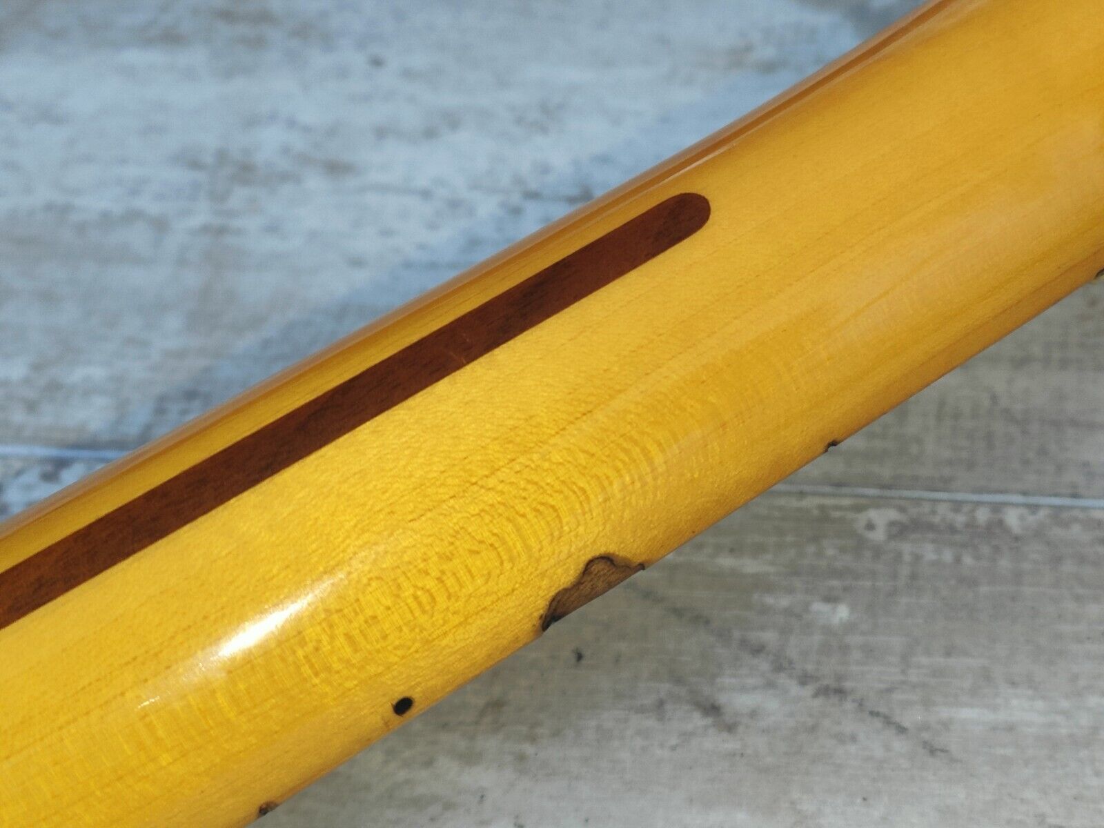 More aesthetic vibe than you could ever handle and twice as much sound! Made in Tokyo by the by Yubi Sound Lab (the Japanese distributor for Seymour Duncan), these were mostly on-off custom shop style builds created to showcase the range of SD pickups prior to their agreement with ESP. Loaded with just a single Seymour Duncan JBJ/SH-4 humbucker (16.5k), this one's built with a one-piece '54 style maple neck (soft V profile) bolted to an unfinished two-piece alder body. Controlled by a single volume knob and output jack mounted to the control plate, it's a very simple no-nonsense guitar with incredible acoustic volume. The original Dimarzio branded machine heads are an interesting choice given that it's a Seymour Duncan build, but they look the part and keep things perfectly in tune.