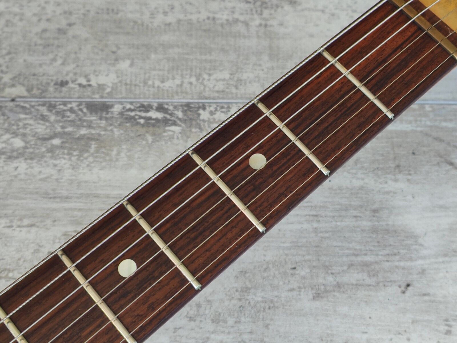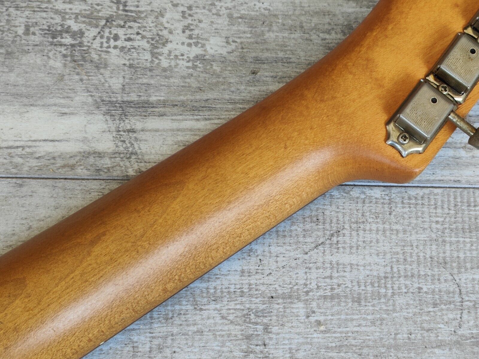 We've given it a basic setup and service and it plays well with loads of vibe, the neck has a nice satin feel and plays straight with smooth, shiny vintage frets.