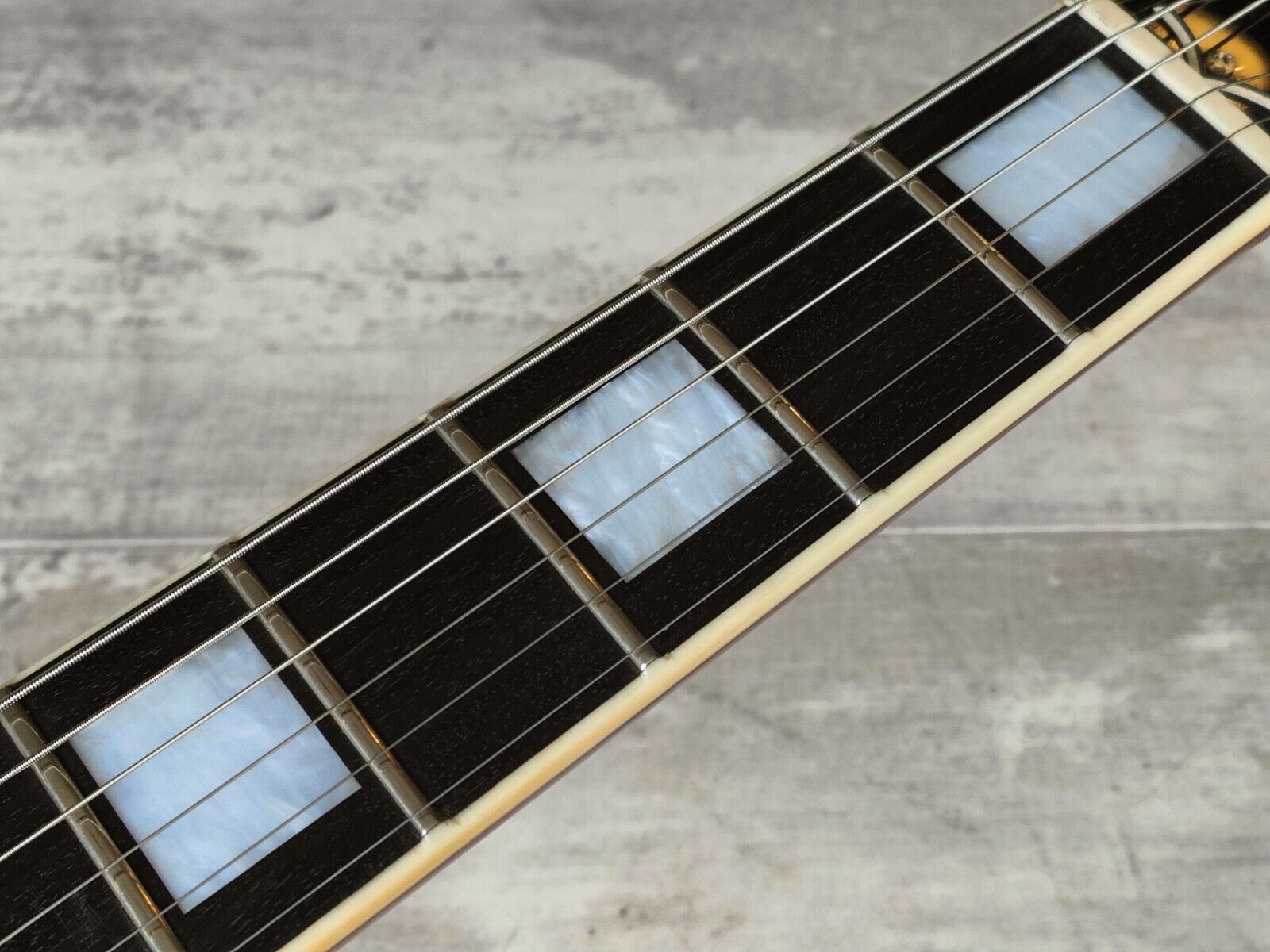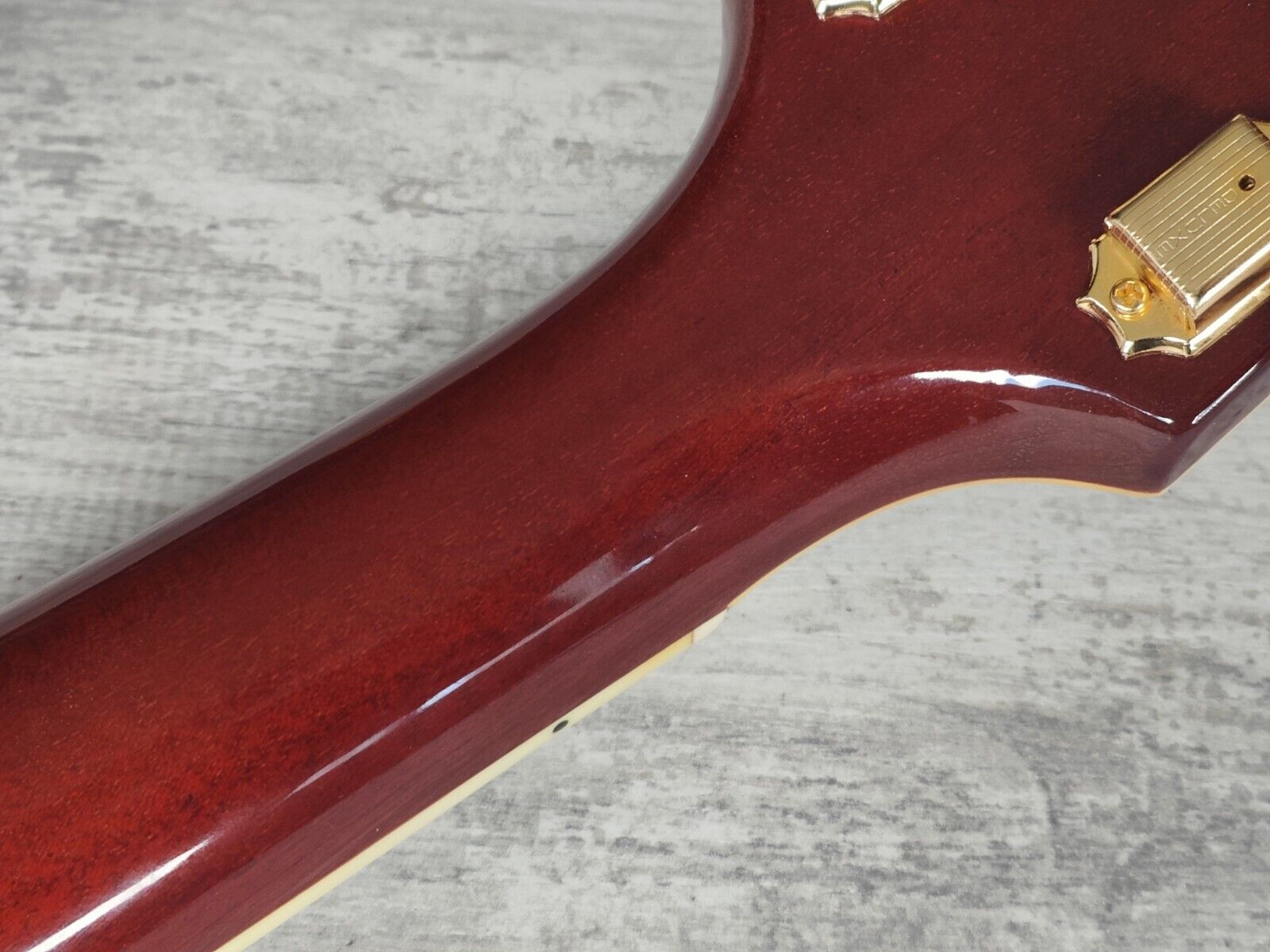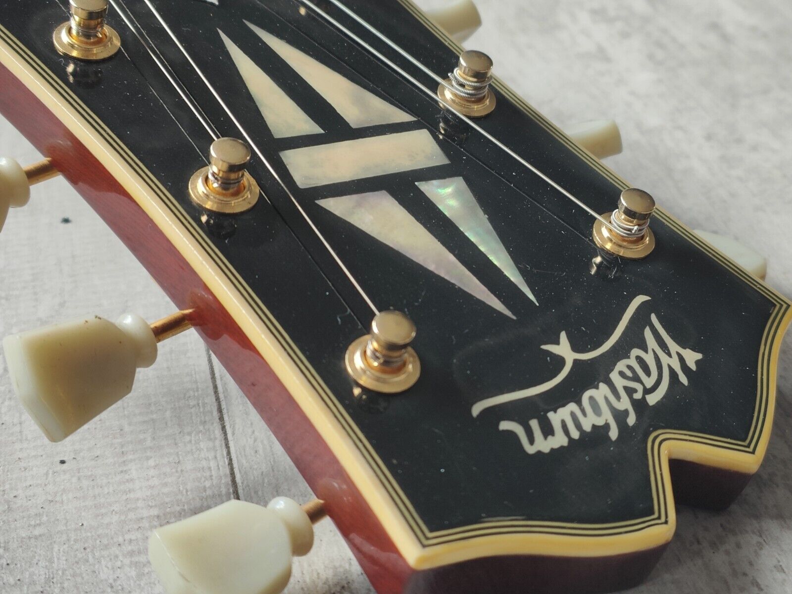 Built with a mahogany body and slim 60's mahogany neck with a flamed maple cap and a 22 fret ebony fingerboard, it weighs a hefty 4.6kg's. Classic Washburn logo and headstock shape, however this one has the Gibson style headstock inlay rather than the original one on most high-end Washburn WP's. This was dug out of the factory with no pickups and limited hardware so we installed a full factory NOS Tokai loadout (also from the Tokai warehouse) with Gotoh made humbuckers, Japanese hardware and vintage-style tuners.