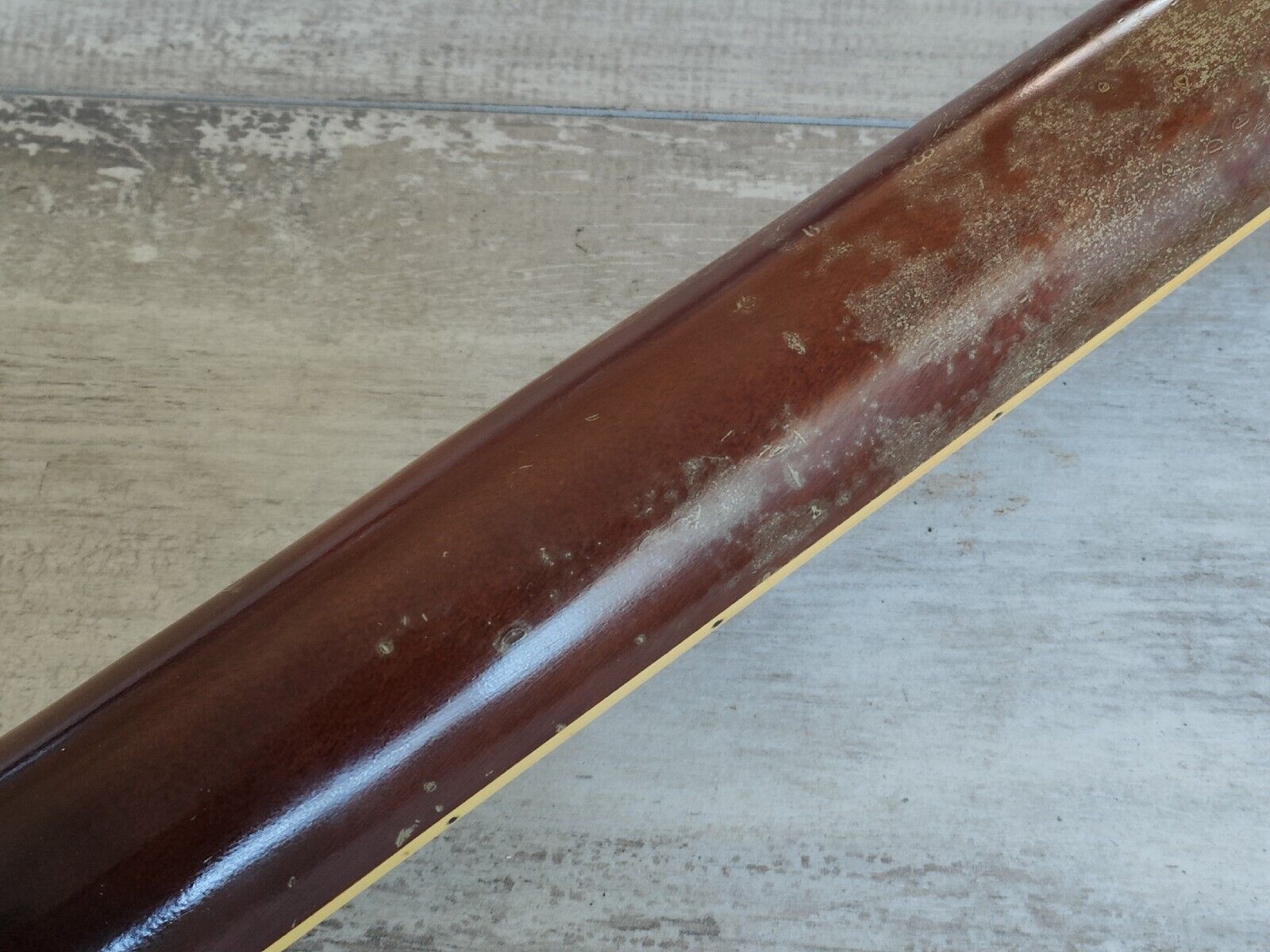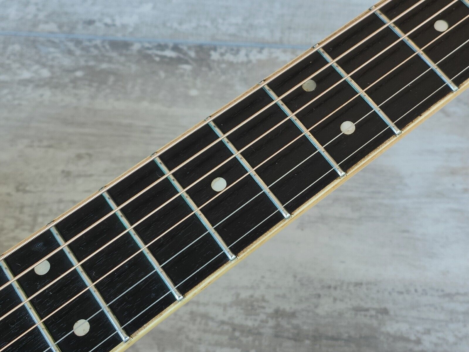 Well used vintage condition with some dings and wear as pictured, frets are used but were polished and play well, the neck is straight with a functional truss. Fretboard was oiled, has some fading under the clear coat on the back, sides and neck.