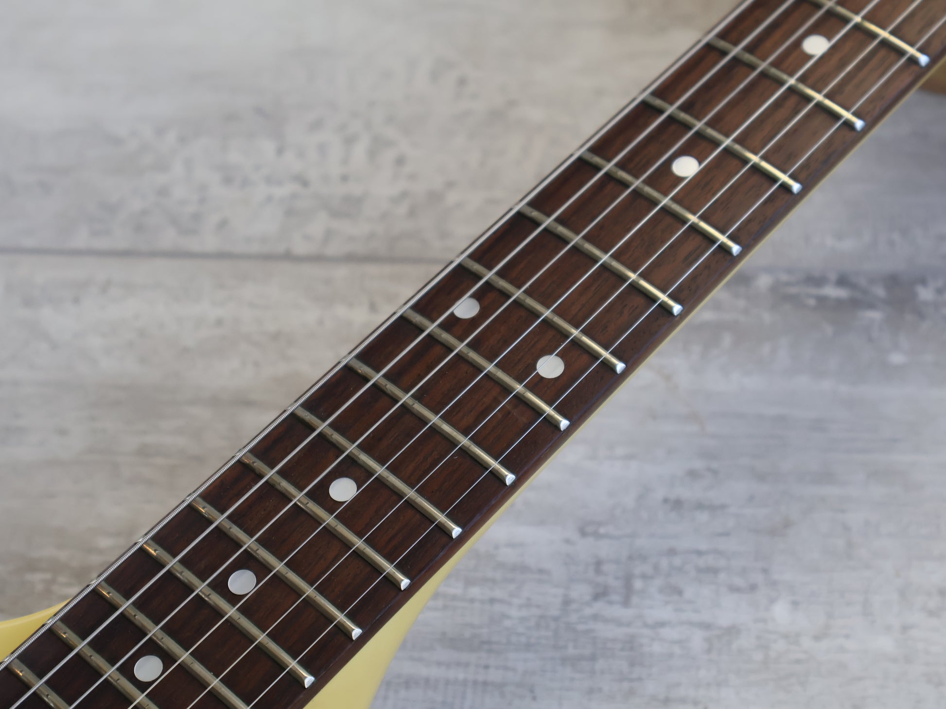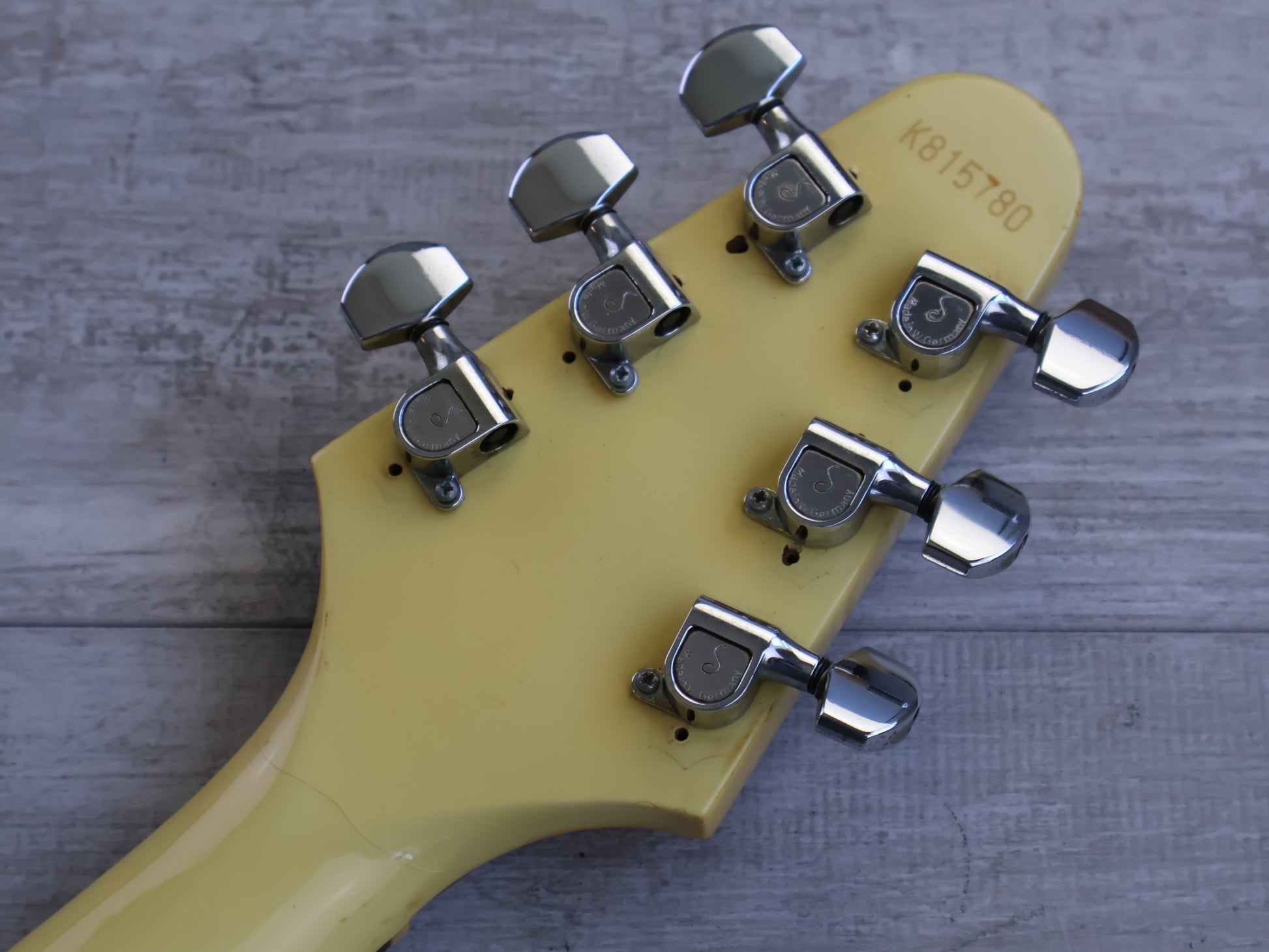Made by the Fujigen factory in 1981, this is the Greco FV-600 '67 reissue Flying V. Mahogany body with a slim 60's profile mahogany neck and a 22 fret rosewood fingerboard with dot inlays, it weighs 3.2kg's. Loaded with aftermarket pickups (a Gotoh in the bridge and an unbranded neck pickup) and a set of Schaller tuners with the original Japanese wiring and Greco hardware.