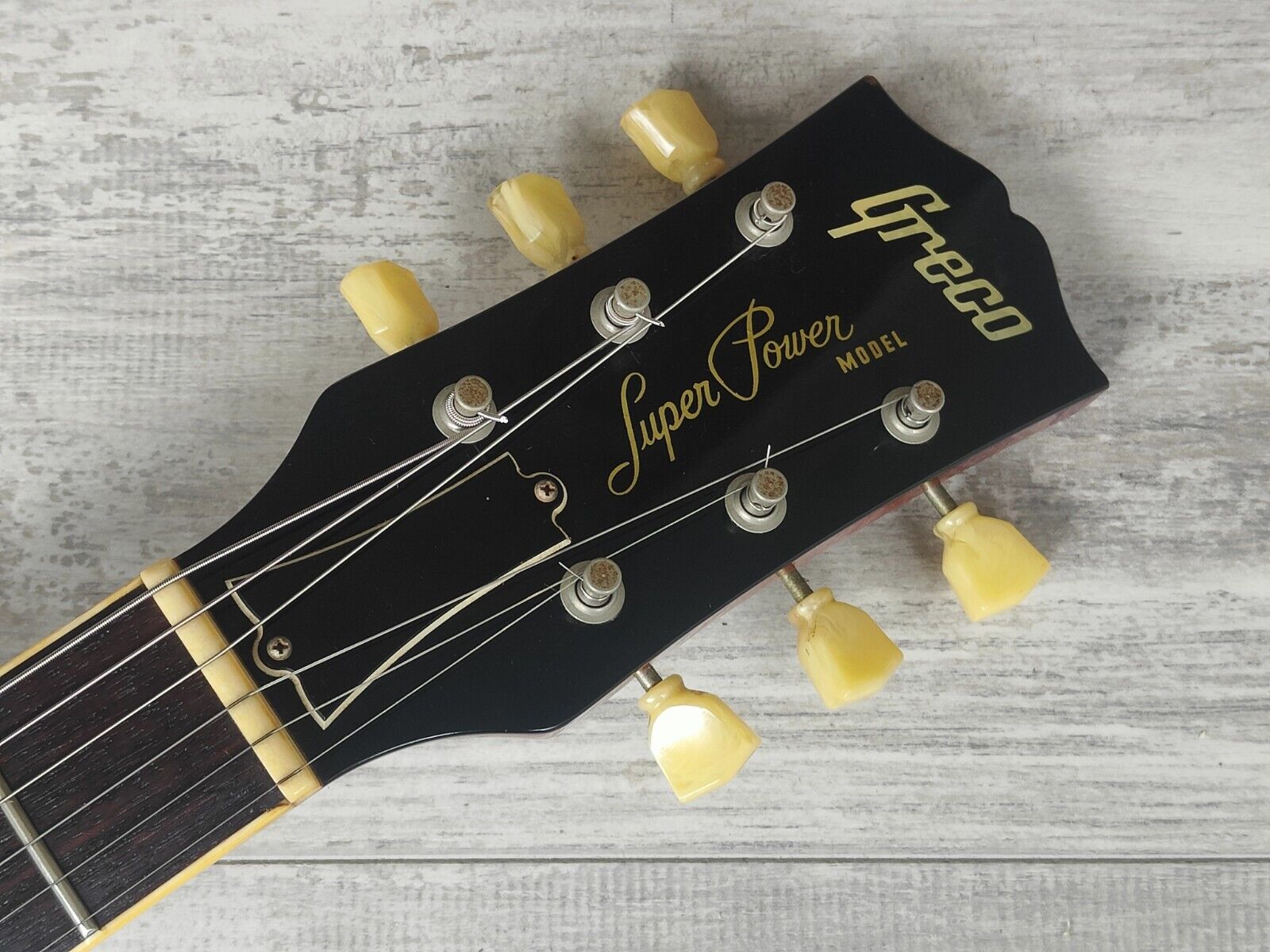 Made by the Fujigen factory in 1981, the Greco EG-500 Super Power was a mid-tier model from the Japanese catalog. Mahogany back with a lightly carved maple top, slim 60's profile mahogany neck and a 22 fret rosewood fingerboard, it weighs a hefty 4.7kg's. Original Maxon PU humbuckers with the original switch and wiring along with the original Greco Deluxe vintage tuners.