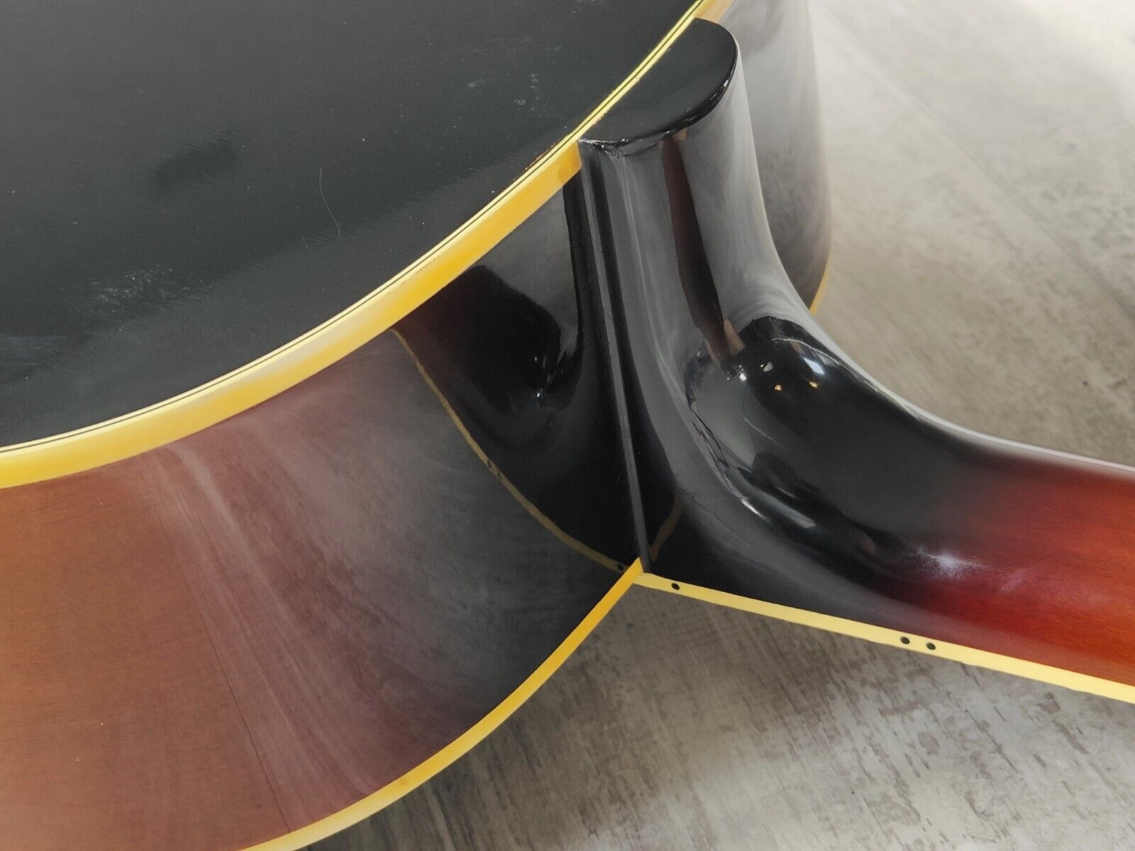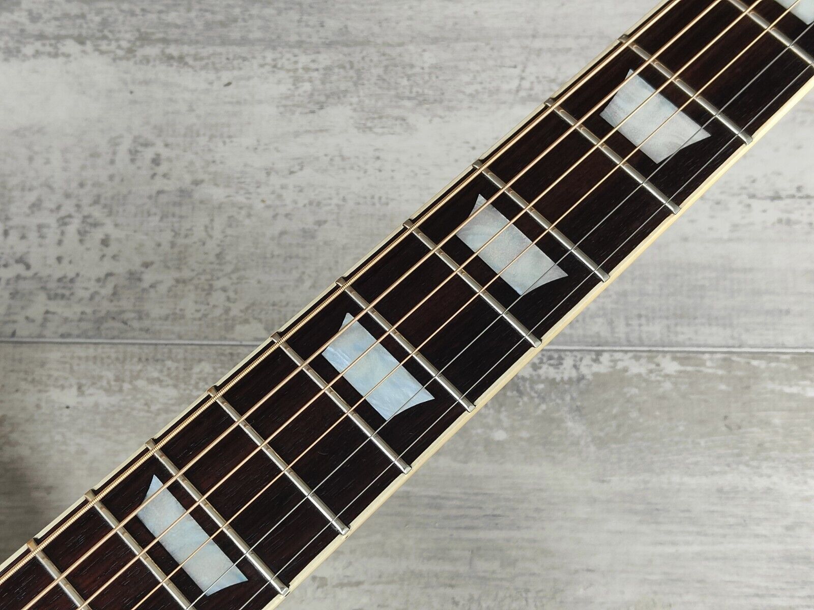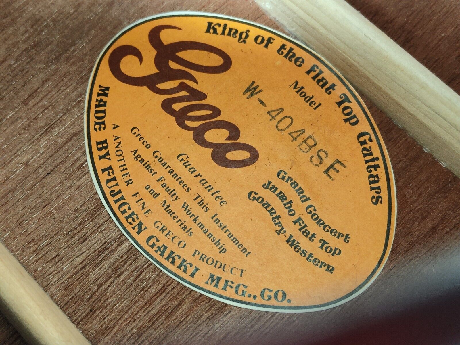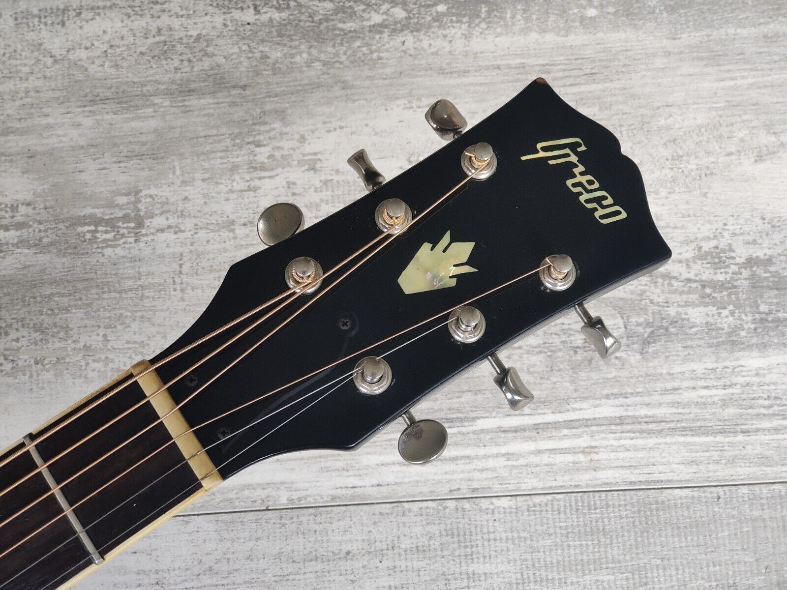 A gorgeous emulation of the Gibson J-160E, the Greco W-404BSE was built by the Fujigen factory in early 1981. An exceptionally rare model, these feature the full Gibson aesthetic with an open book headstock, trapezoid inlays and Greco Deluxe Kluson-style tuners.