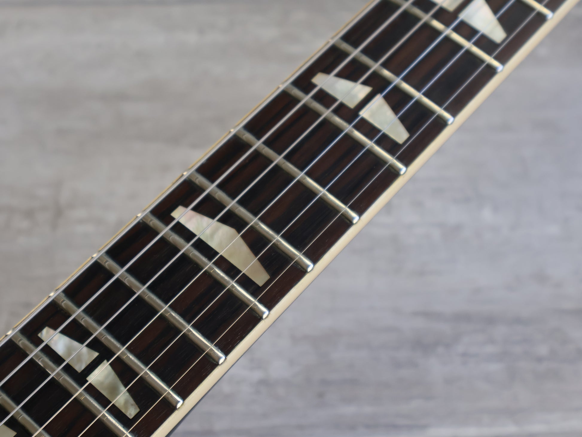 Received a professional setup and service prior to listing, plays well with a straight neck and adjustable truss. Shiny frets are worn and a little flat but still have some life left.
