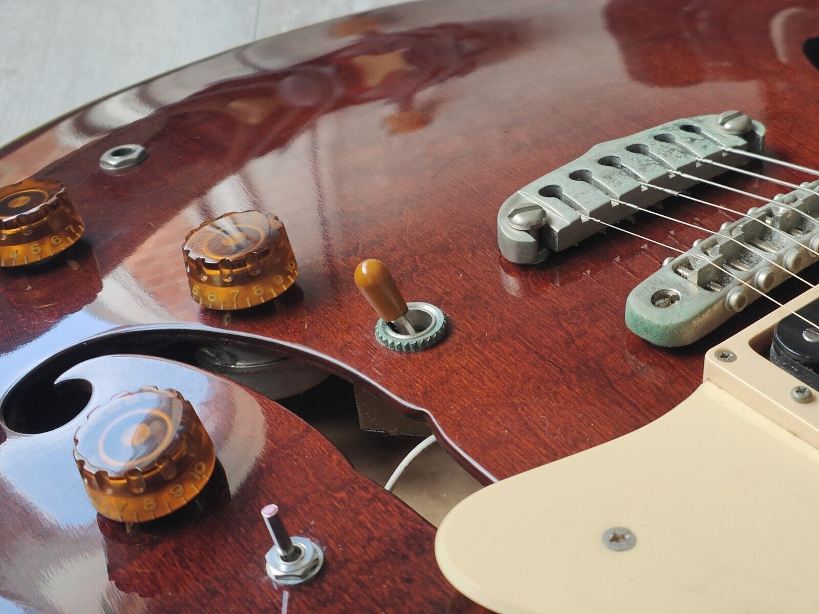Good overall vintage condition as pictured with some fading to the finish and a few signs of wear and tear as pictured, the frets are clean and play well with a straight neck and adjustable truss. Has a coil split toggle switch installed.
