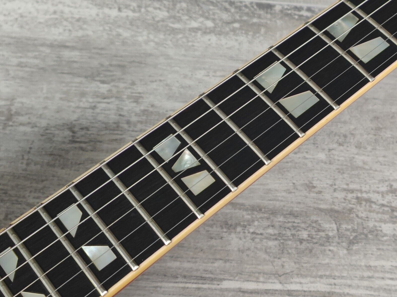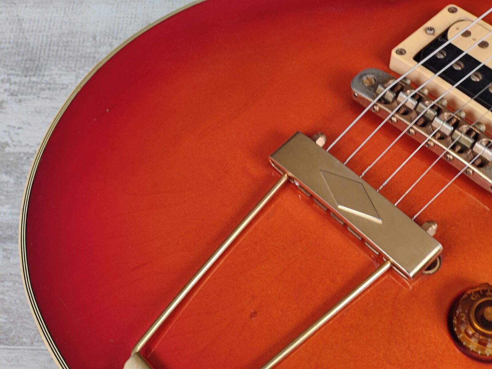 The original MMK-75 humbuckers (only used in the highest end Matsumoku guitars) sound great and are controlled by 2 volume and two tone knob, a three-way selector and a pair of "dual sound" mini toggles. Still has the original brass nut, Aria branded tuners and harmonica-style bridge although the tailpiece was replaced with a Trap-eze style system at somepoint and has been screwed to the body to secure the strings into the bridge nicely.