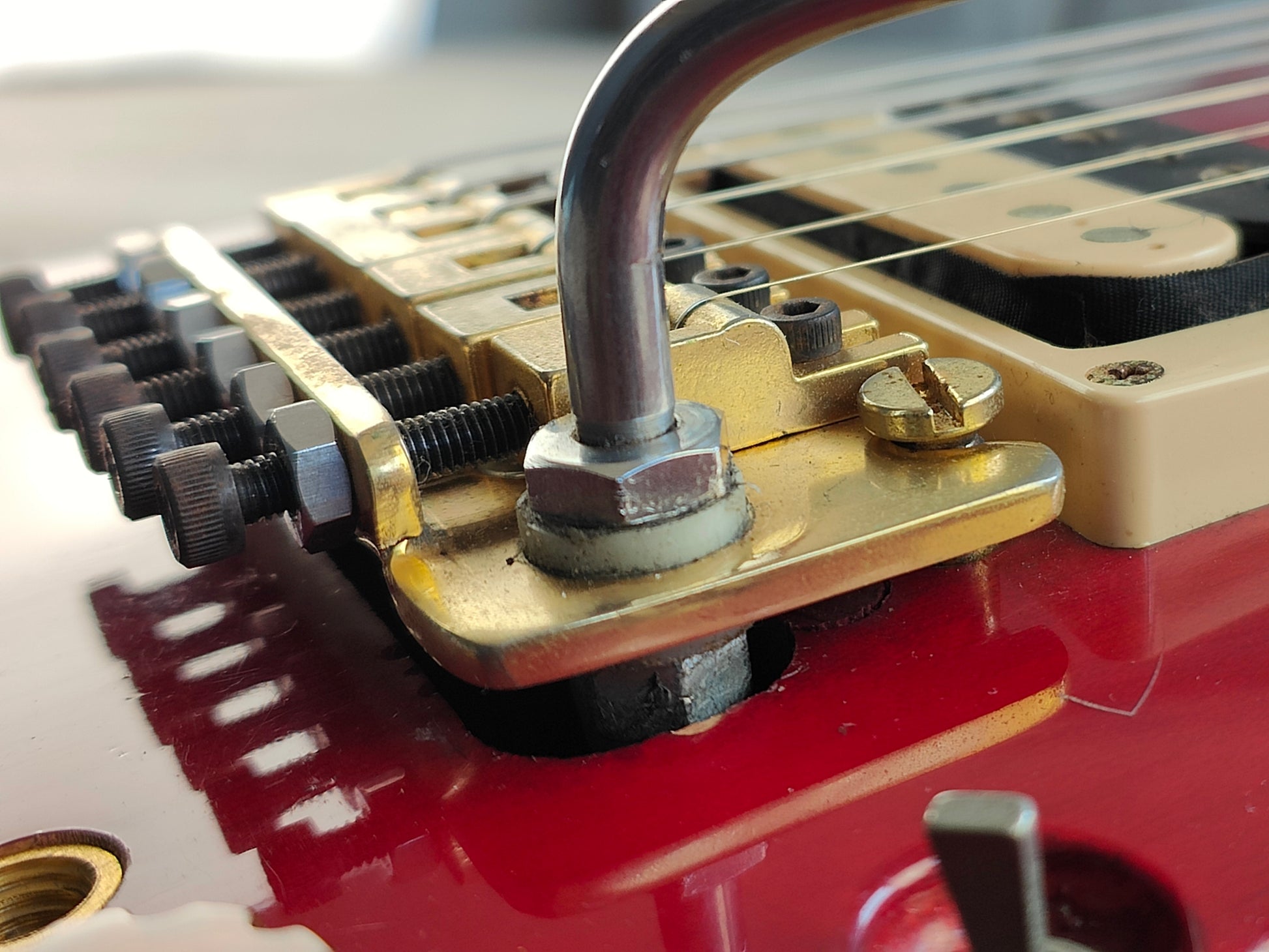 Catching the eye of Neal Schon in the early 1980's, a PE model was featured in many live Journey performances during their Japan tours. There are some rumours that following these shows Aria Pro II produced a few guitars for Schon that featured a genuine Floyd Rose in the same way as his modified Gibson Les Paul Deluxe did. While there's no way we can confirm whether this is one of those guitars built for Schon, we did received a two of them at the same time from the same source in Japan with very professional Floyd Rose installations that appear to possibly be from the Matsumoku factory as pictured.