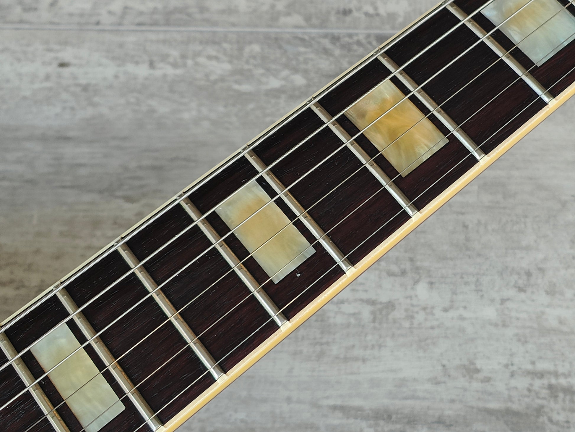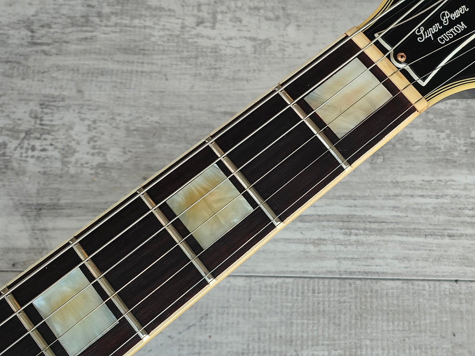 Made by the Fujigen factory in 1982, the Greco EG-500 Super Power (also known as the EGC68-50) was a '68 reissue Les Paul Custom model from their Japanese catalog. Wearing an absolutely stunning (and seldom seen) "Violin Sunburst" finish, it's built with a mahogany back, lightly carved maple top, slim 60's profile mahogany neck and a 22 fret stained rosewood fingerboard and weighs a hefty 4.5kg's. Original Maxon humbuckers with the original switch and wiring along with the original Greco branded button tuners.