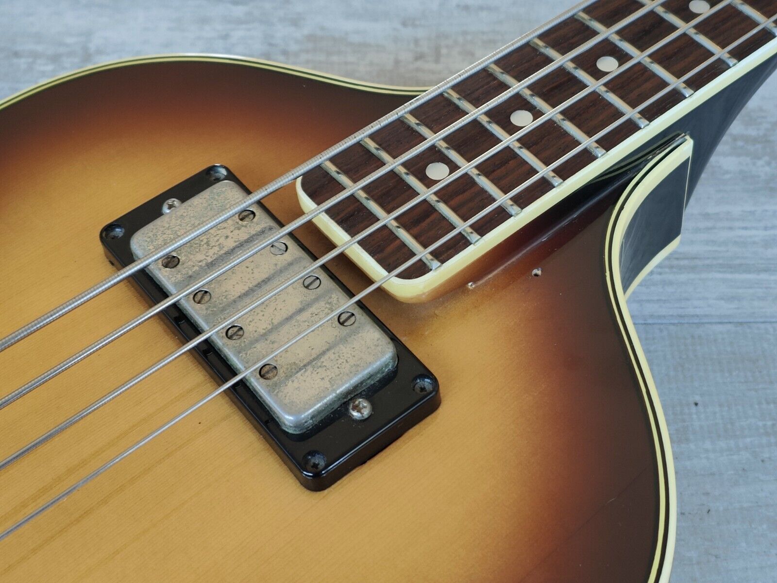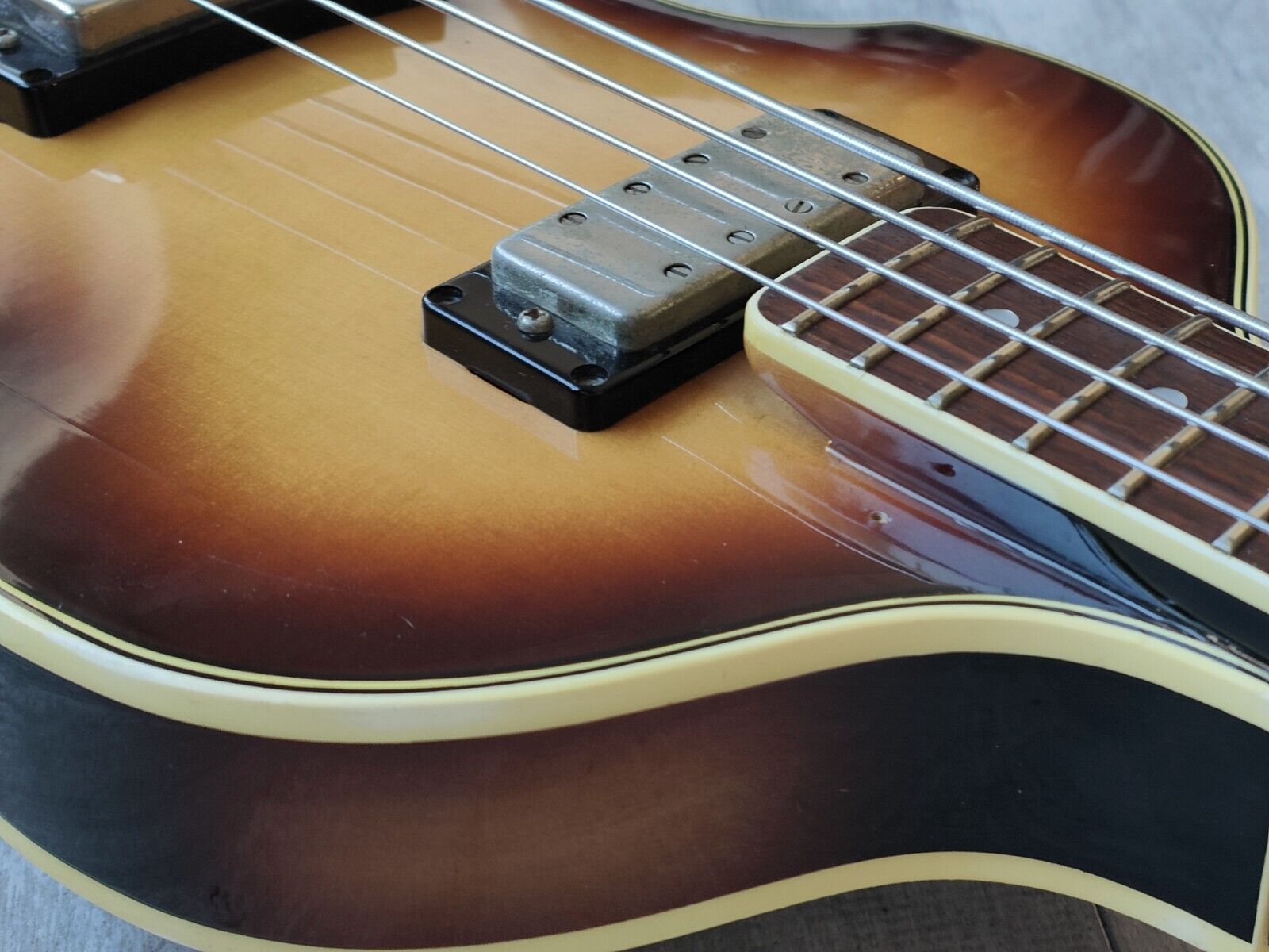 Made in December of 1982 for release in their 1983 catalog, the VB-50 was Greco's premium "Beatle Bass" model. With a spruce/sycamore hollow body and a set maple neck with a 22 fret rosewood fingerboard, it weighs a nimble 3.15kg's. Loaded with a pair of Maxon produced bass humbuckers and traditional Hofner style controls/wiring, it's strung with some flatwounds and has the perfect "pop".