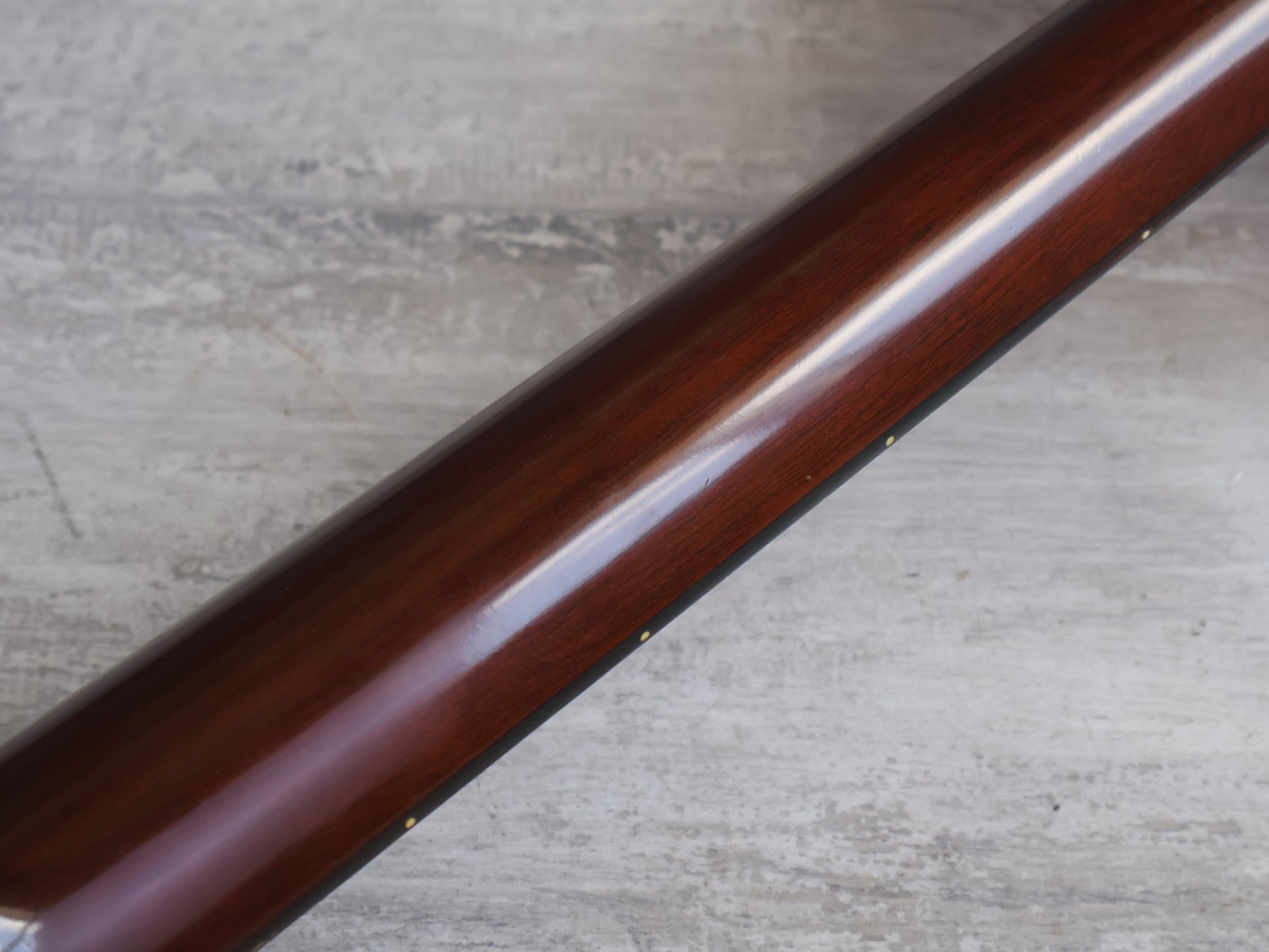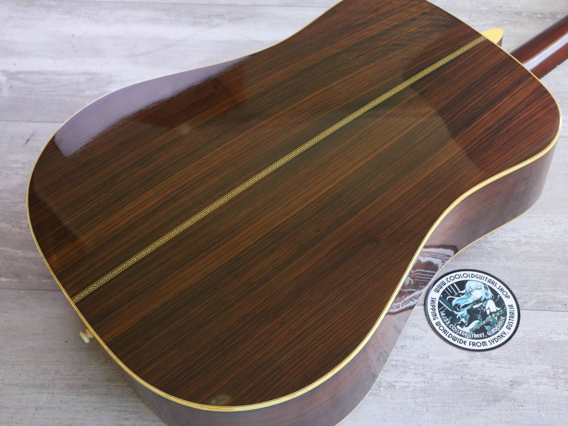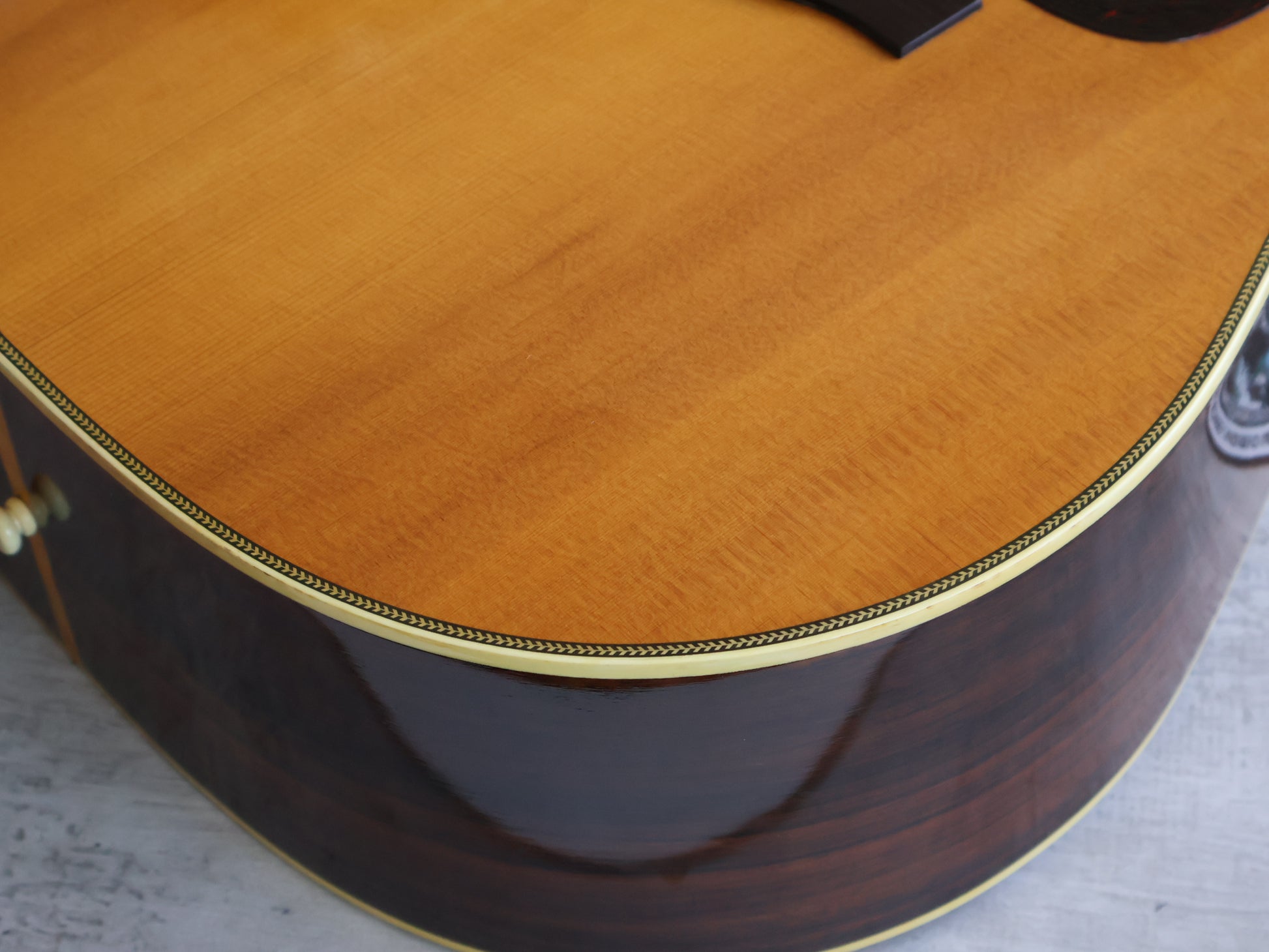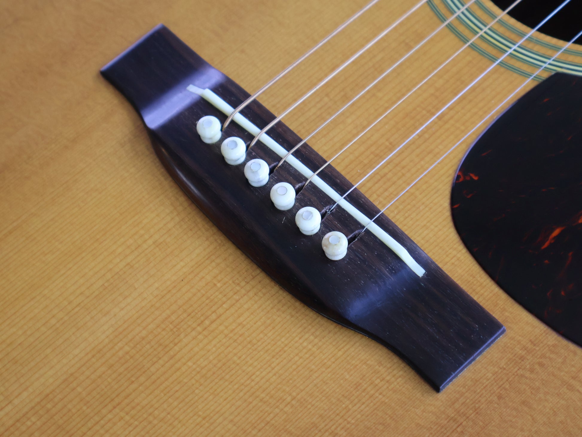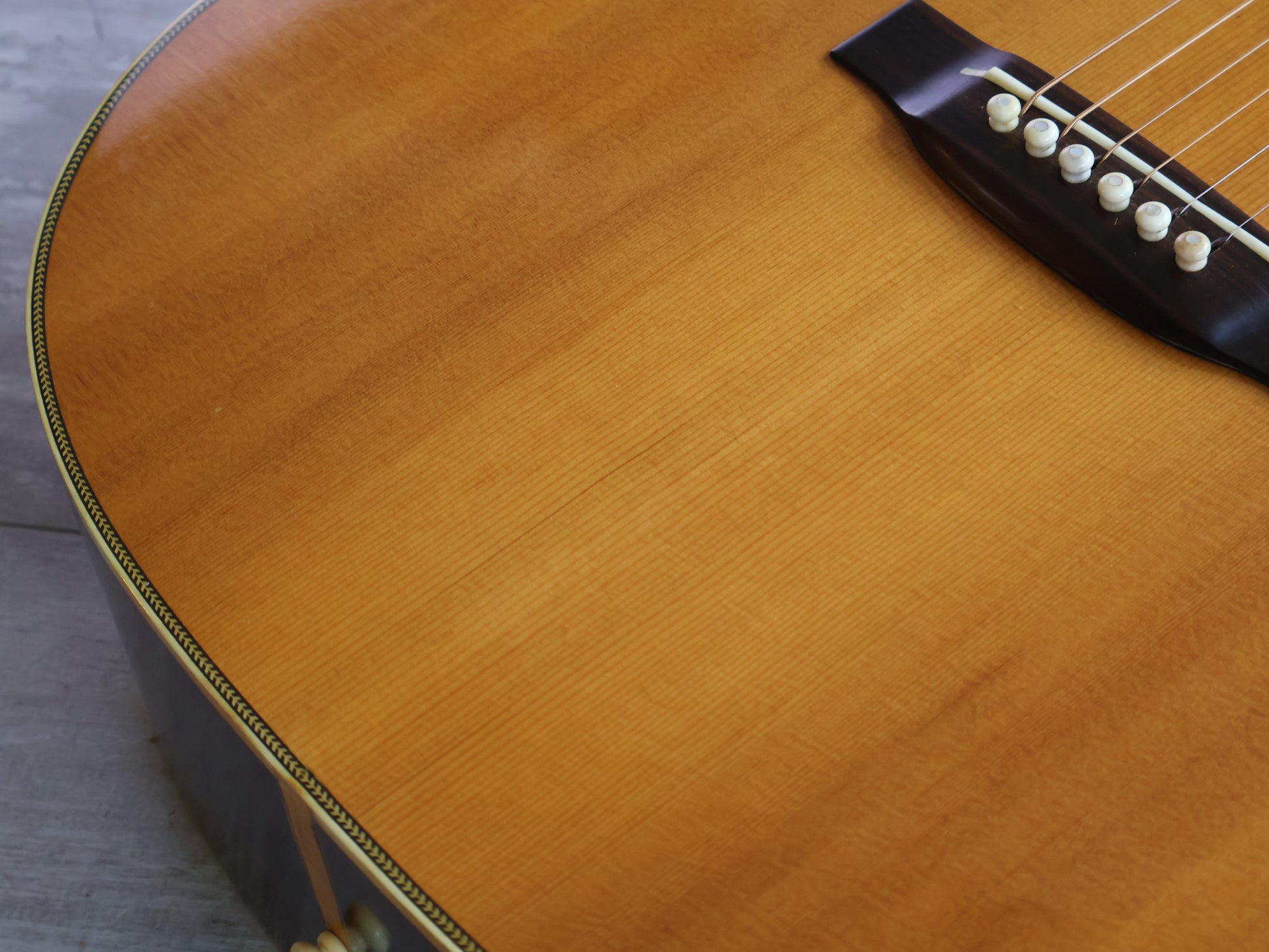 Solid spruce top with Indian rosewood back and sides, scalloped X-bracing, herringbone purfling and the correct square Martin-style headstock with the torch inlay. Long-slotted striped ebony bridge and a light ebony board with square-and-diamond inlays keep it very true to the Martin blueprint.