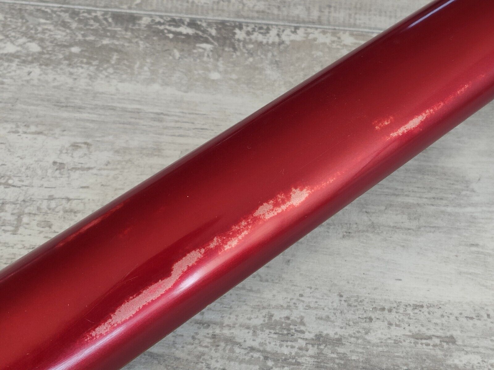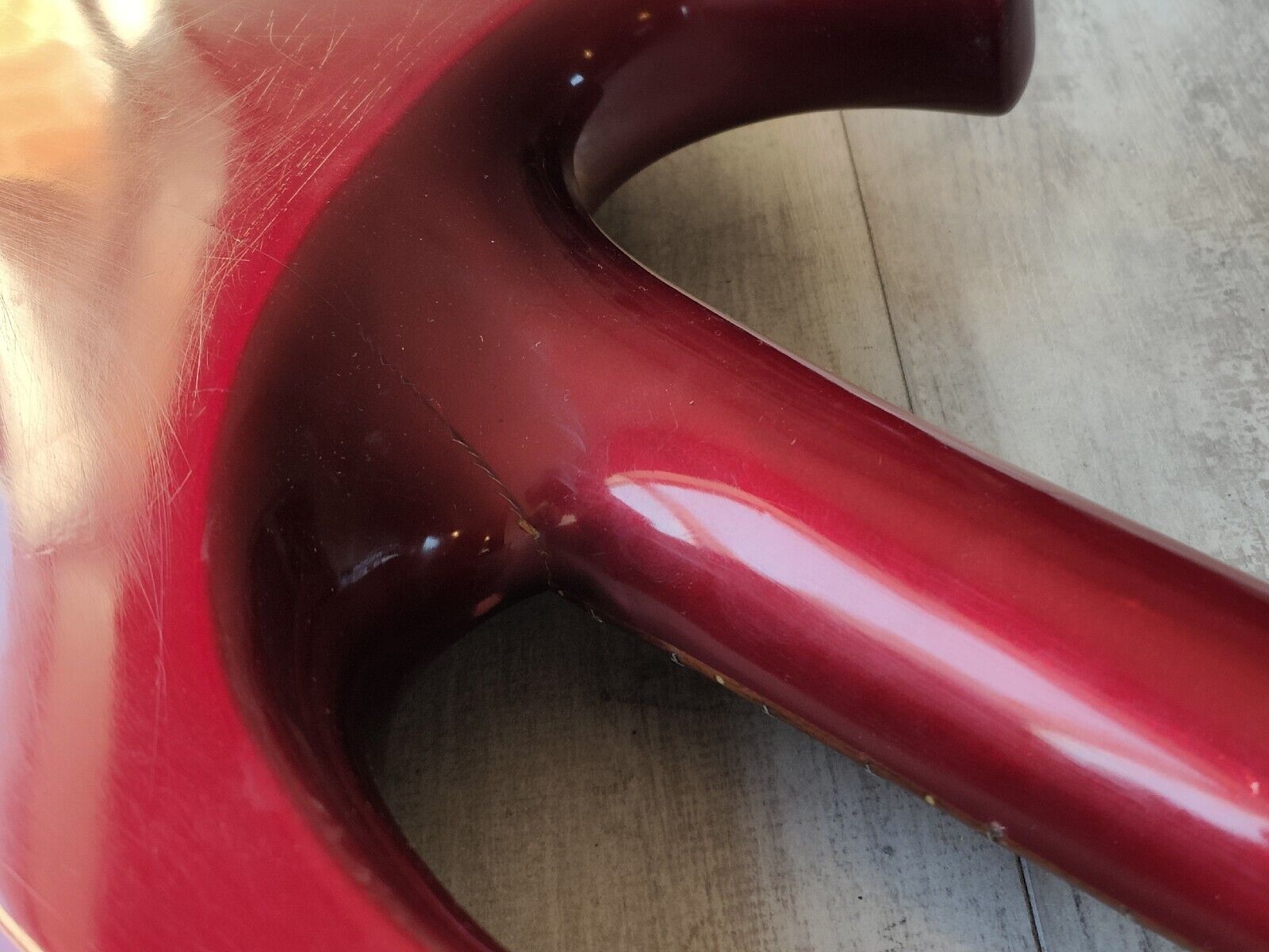 Just back from a professional refret with stainless jumbo frets, our tech truly brought new life into it. The previous owner wet-sanded the finish into a dull scratchy red that our tech buffed and polished back to a glossy red (some scuffing still visible but it's a significant improvement!). There's some finish separation along the neck along the factory transmit-neck joins, no structural issues, purely cosmetic. It's got a replacement nut and the truss cover is missing along with one replacement nut, otherwise it appears original. One bridge pickup coil is non-functional otherwise the electronics are working well.