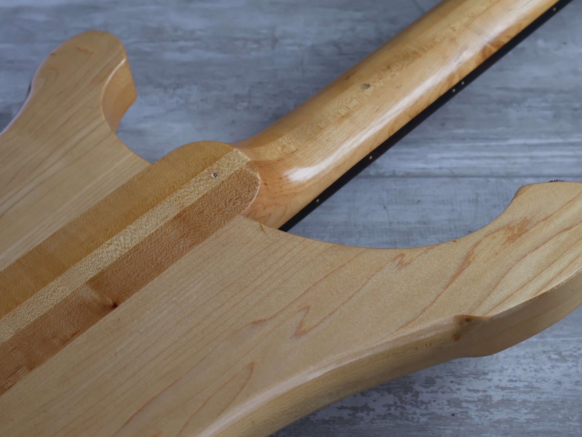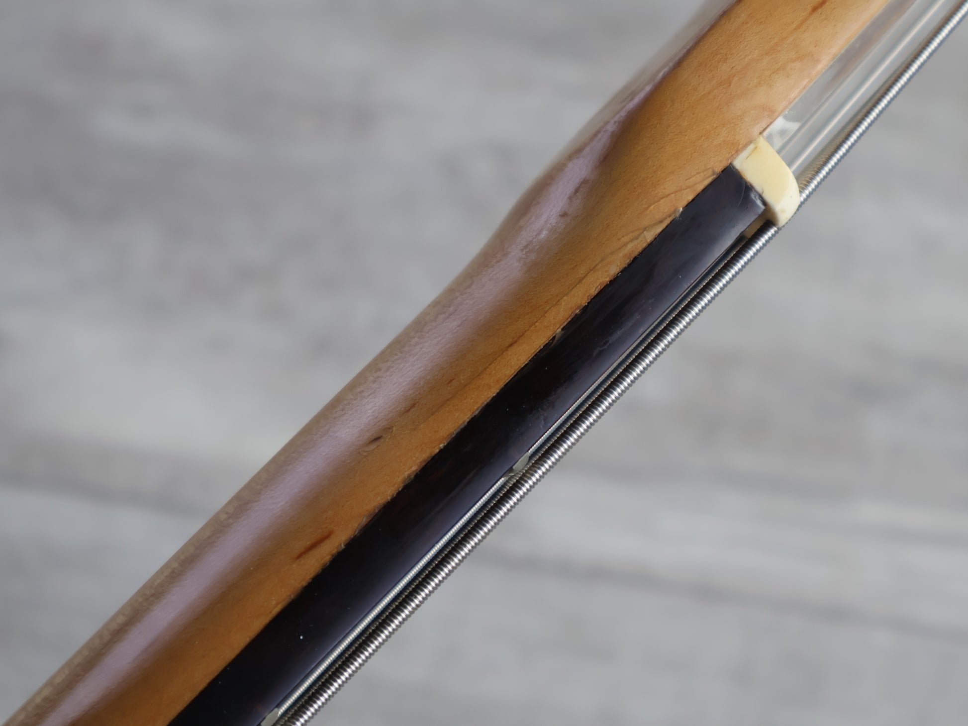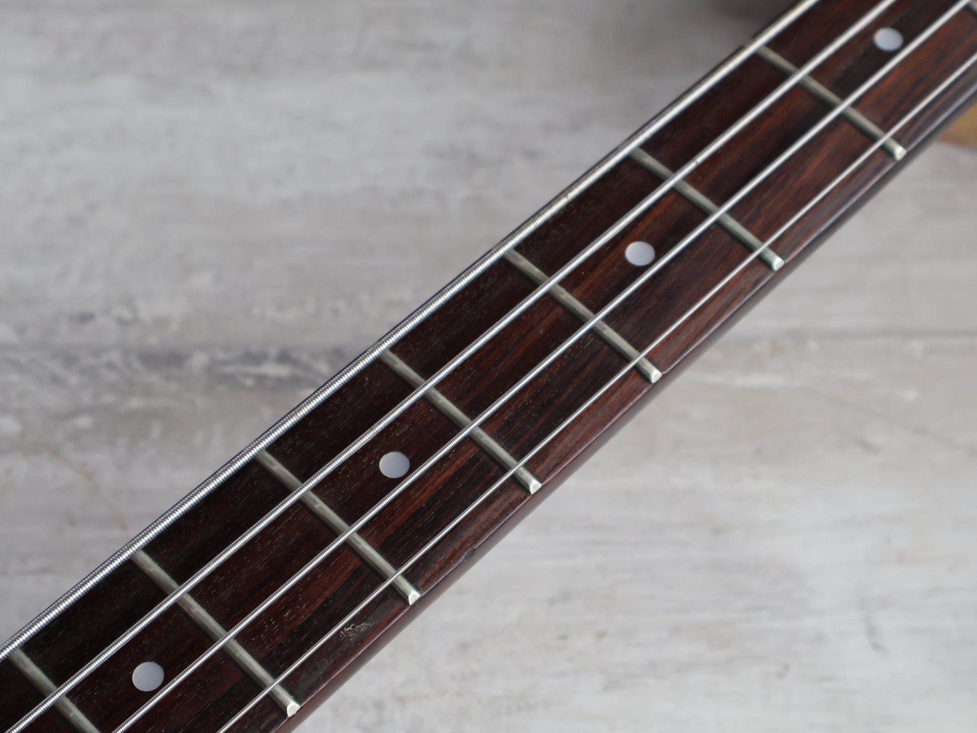 Overall it's a pretty clean bass with the exception of a small repair along the fingerboard from the 1st to 3rd frets. The area was injected and clamped and has no movement under any pressure or stress.