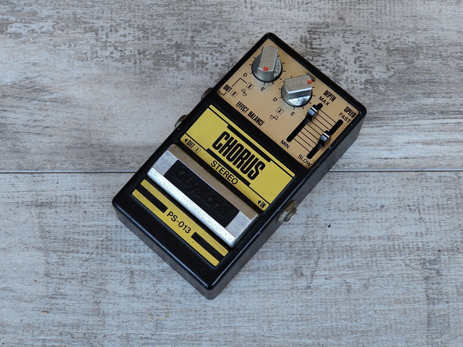 The Guyatone PS-013 is a Stereo chorus with full control over each output. This allows you to tune in two different levels of chorus and balance them into a full stereo wash or a subtle vibrato. Speed and Depth sliders allow you to fine tune this perfectly. Incredibly cool vintage pedal with a lot more options than a Boss CE-2 or Ibanez CS-9.