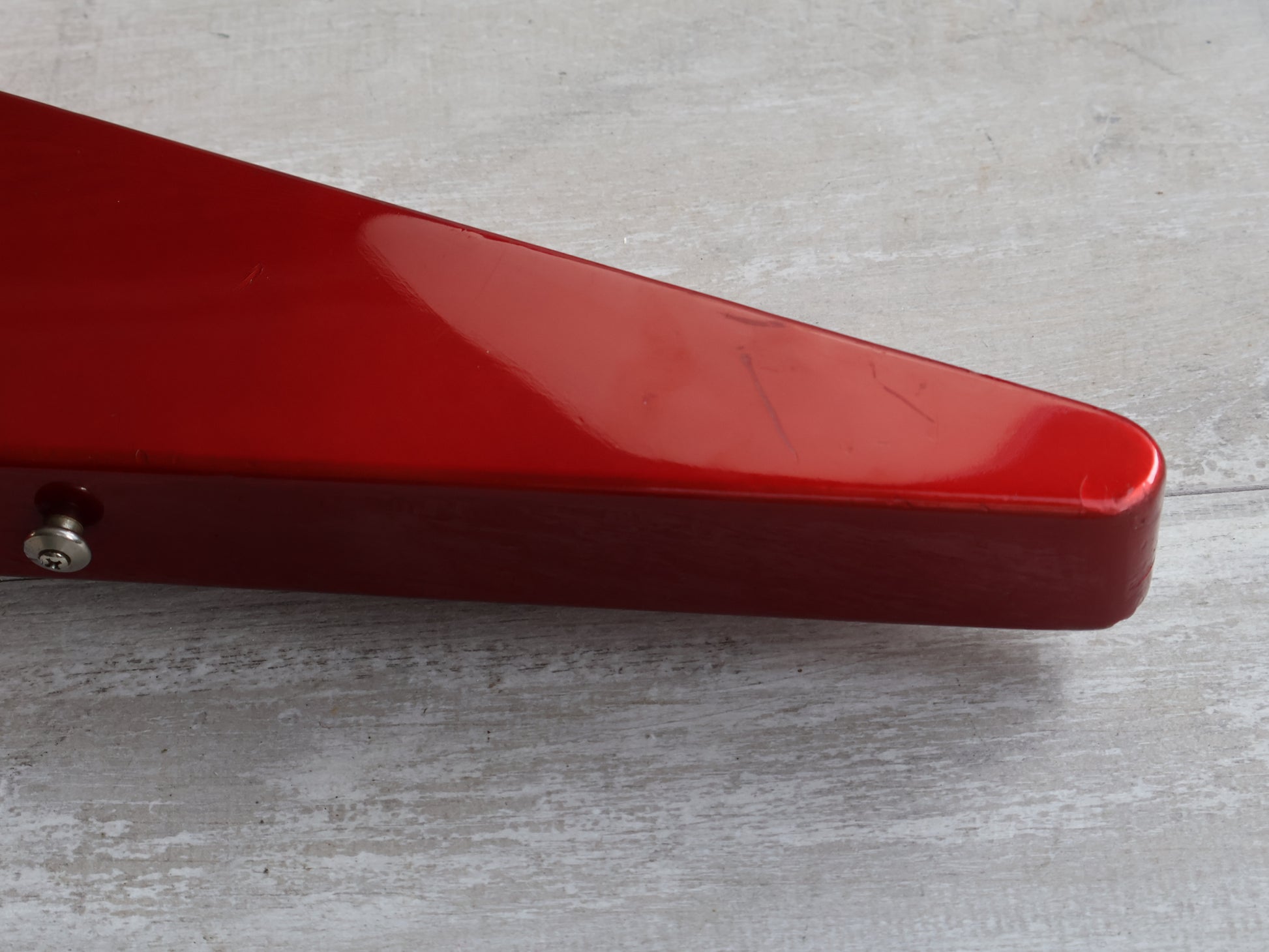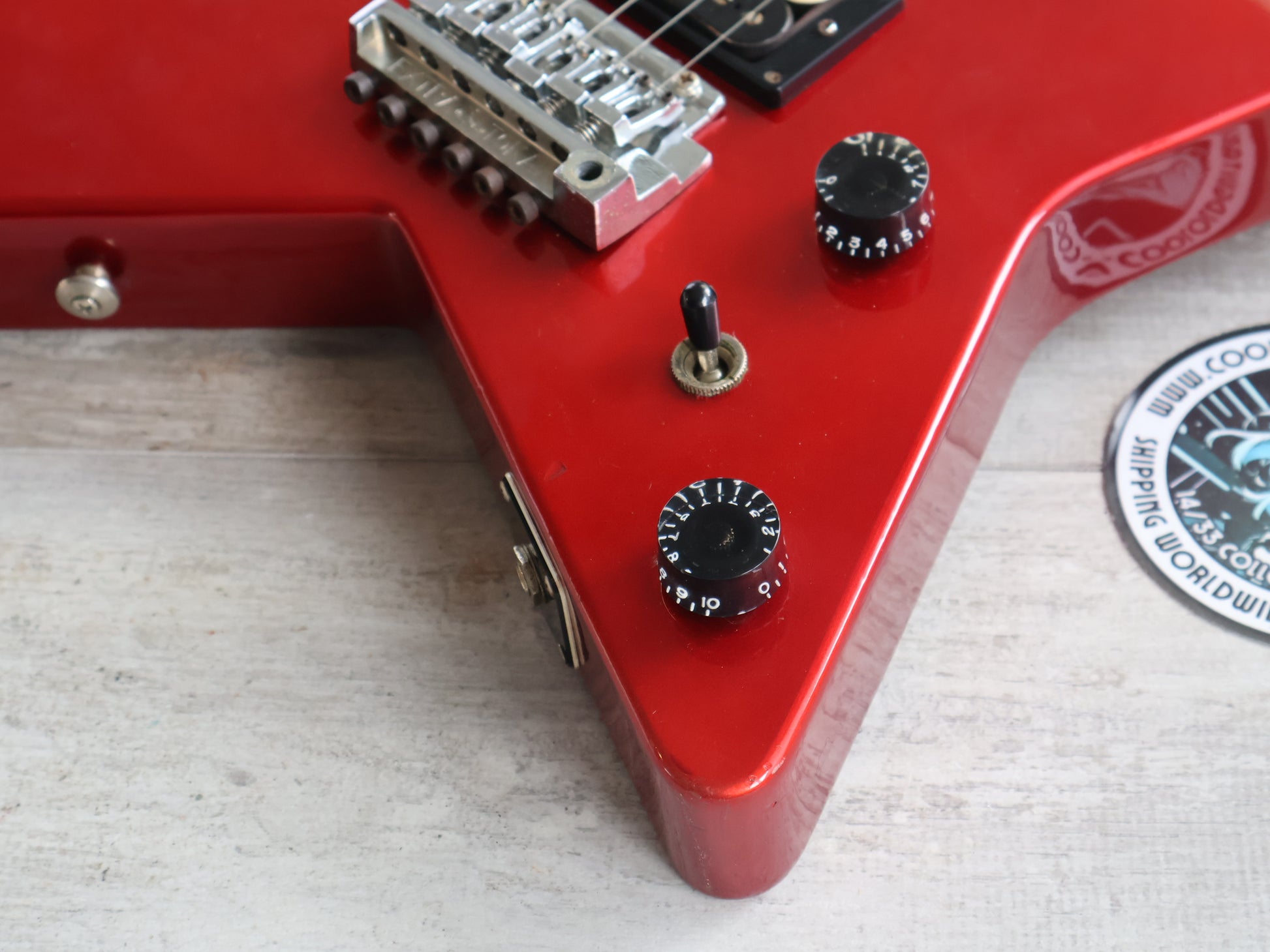 Teased in 1982 and first appearing in Tokai's 1983 catalog, the FSD70 was a mid-range model from Tokai's Japanese made FSD series of "Random Star" style electric guitars. Solid alder body with a shiny Candy Apple Red finish bolted to a maple neck with a 22 fret rosewood fingerboard (648mm scale length, 43mm nut width), it weighs 3.3kg's. This one appears original as pictured.