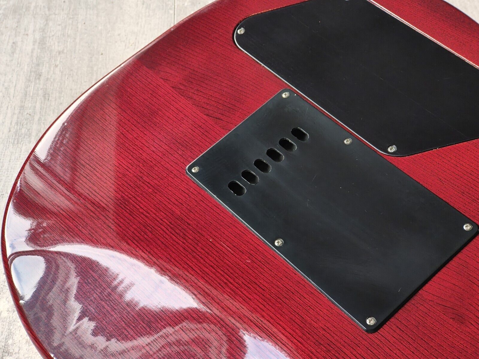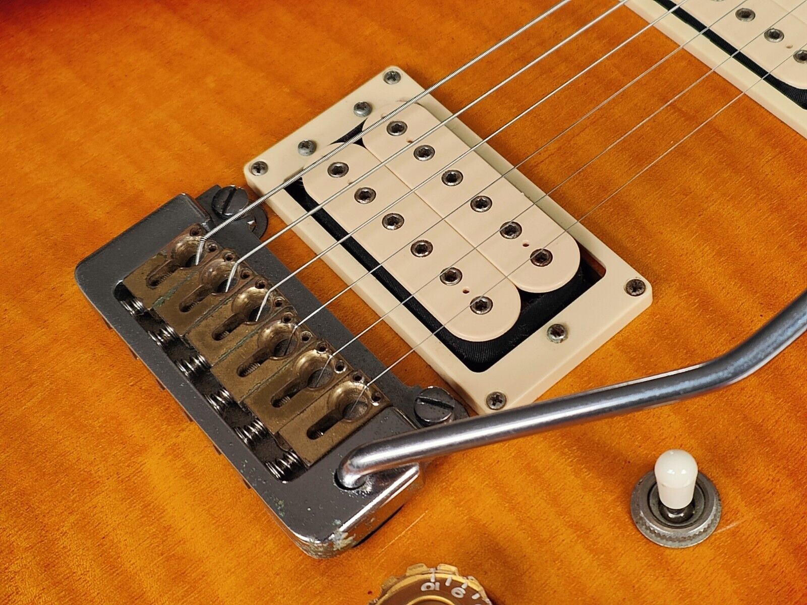 Made for Washburn by the Yamaki factory in Japan, this is a seldom seen Falcon model from the wing series with a factory loaded tremolo system. Lightly flamed maple flat-top double cutaway construction with a two-piece solid ash back, slim mahogany neck and a beautiful 22 fret striped rosewood fingerboard (41mm nut, 628mm scale length), it weighs 3.7kg's. Seemingly all original with a pair of Dimarzio-style Power Sustain humbuckers (coil splittable on push/pull knobs), Stratocaster style two-point tremolo system with soft brass saddles and George Washburn branded tuners.