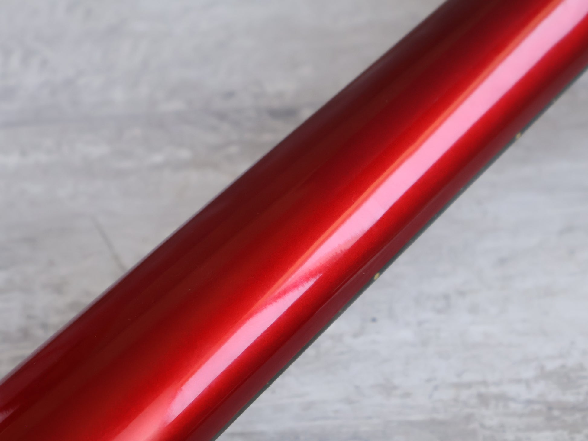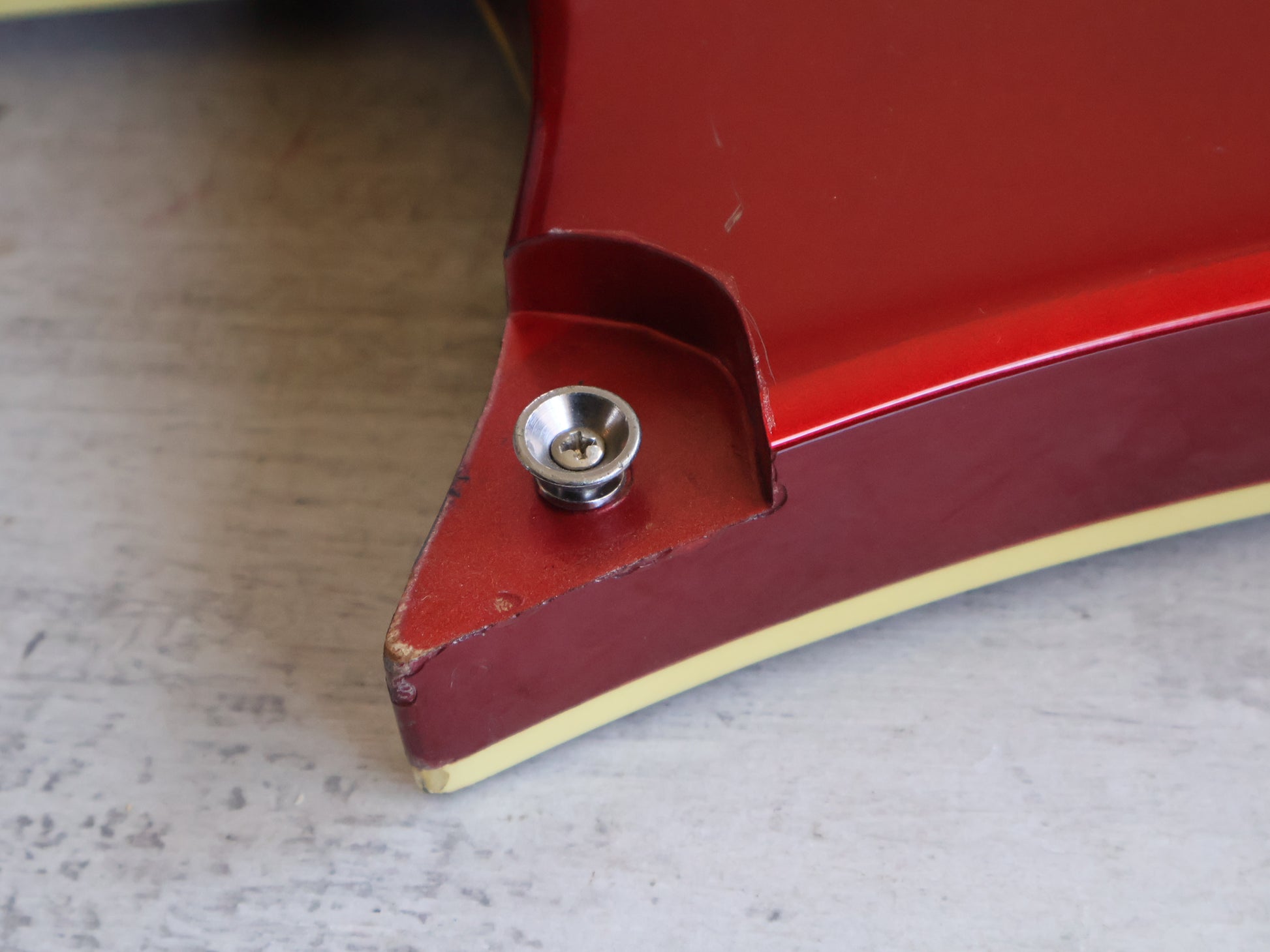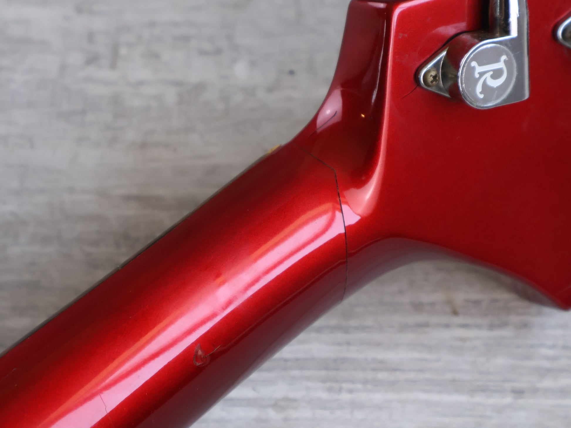 The neck and body have some pretty gnarly paint cracks from the thick glossy red finish, we've put some significant pressure on them and they don't appear to be structural at all with no movement in the wood. Received a full professional setup and service prior to listing, the neck is straight and plays well with shiny frets and a fully functional truss.