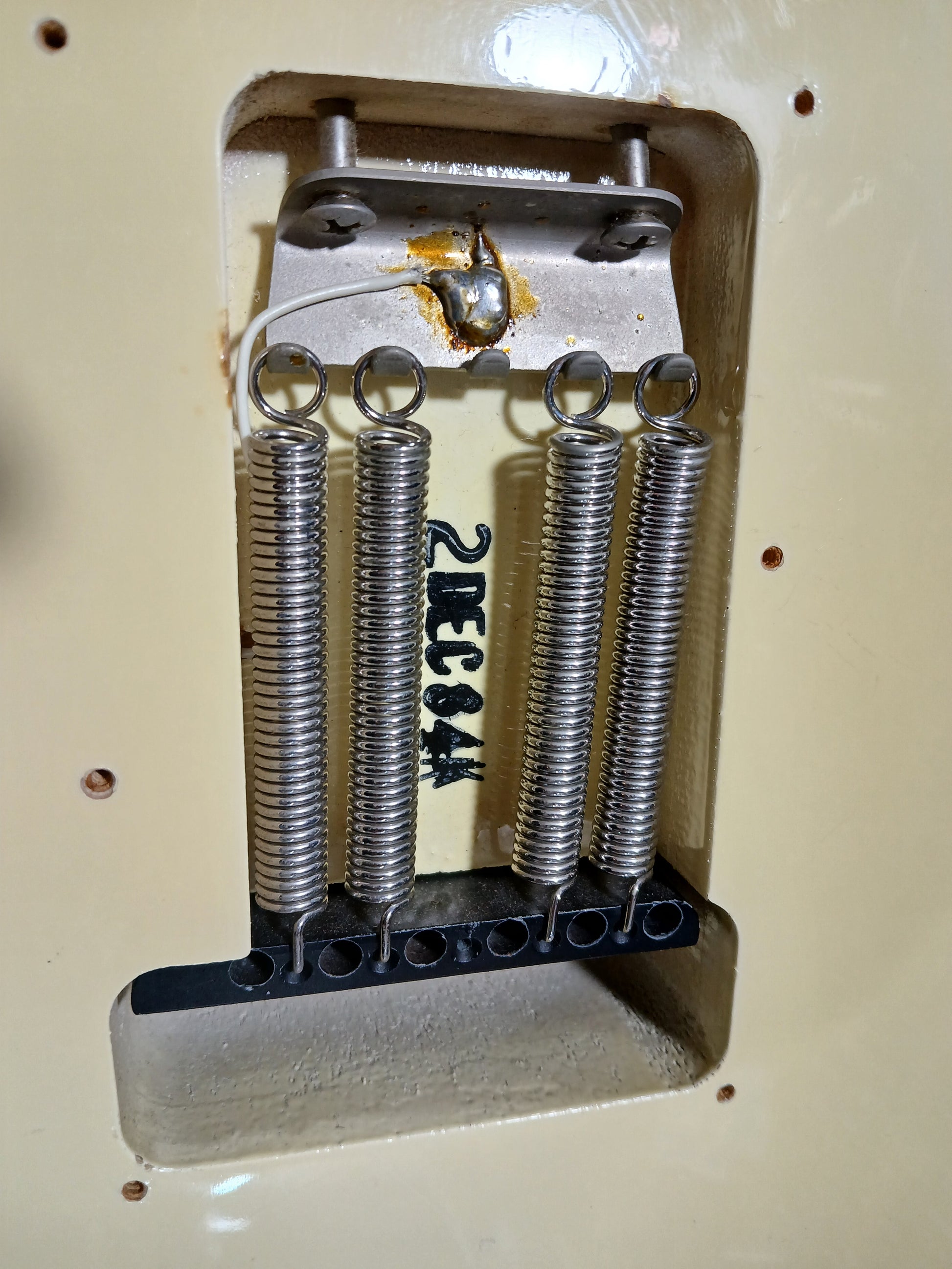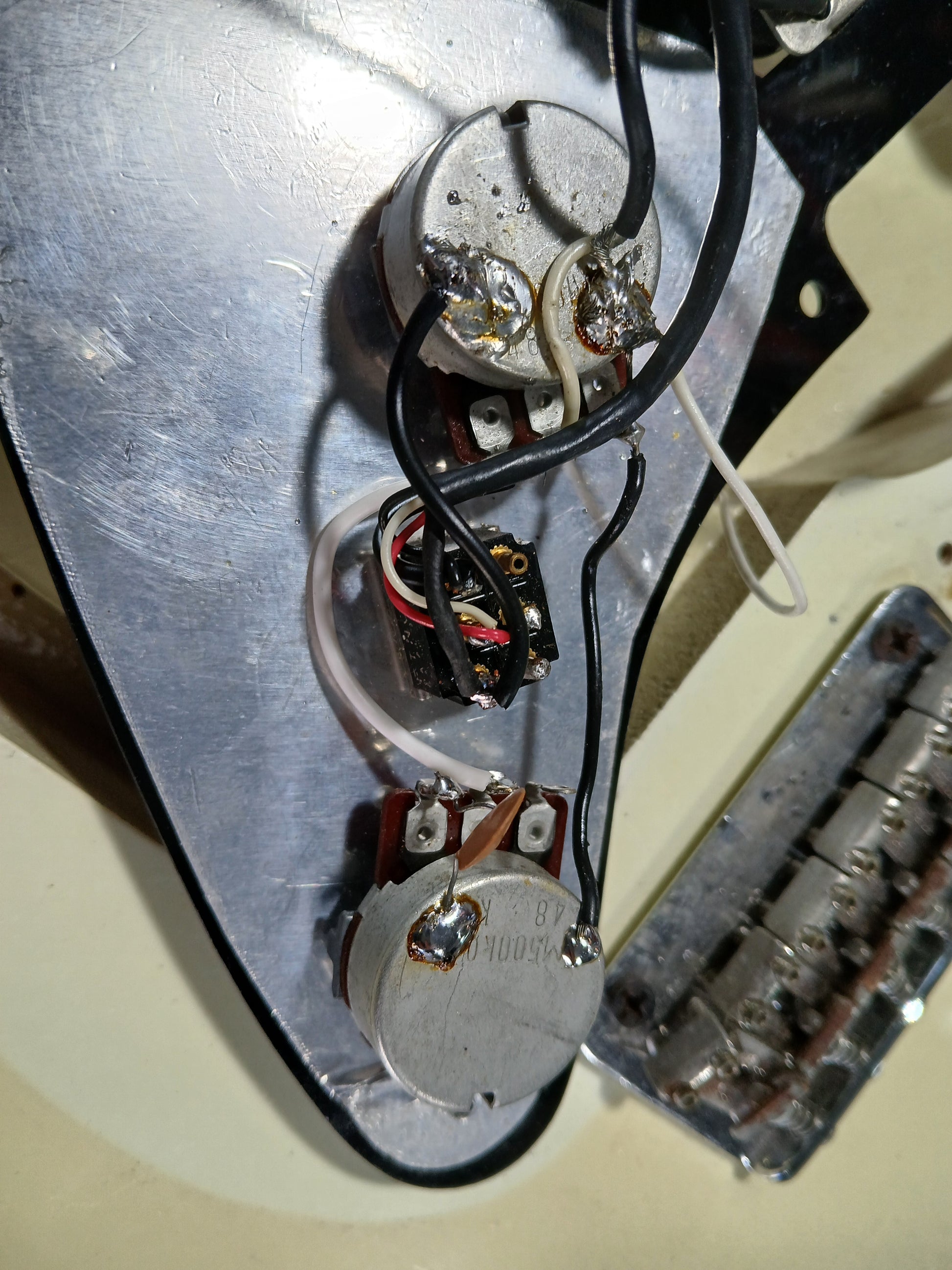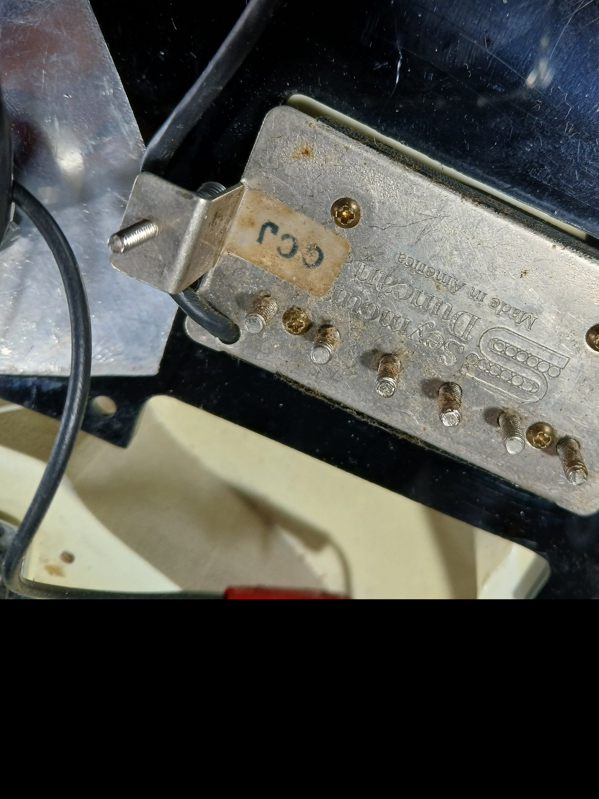 This one's loaded with a Seymour Duncan CCJ labelled humbucker with master volume/tone controls and a coil split mini toggle. Seems to be the original tuners and bridge with some replacement Fender stamped saddles.