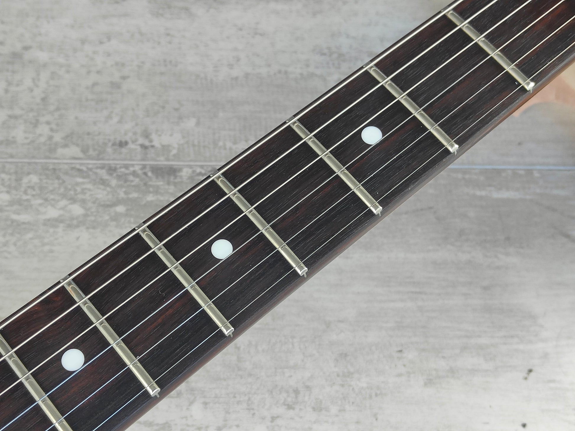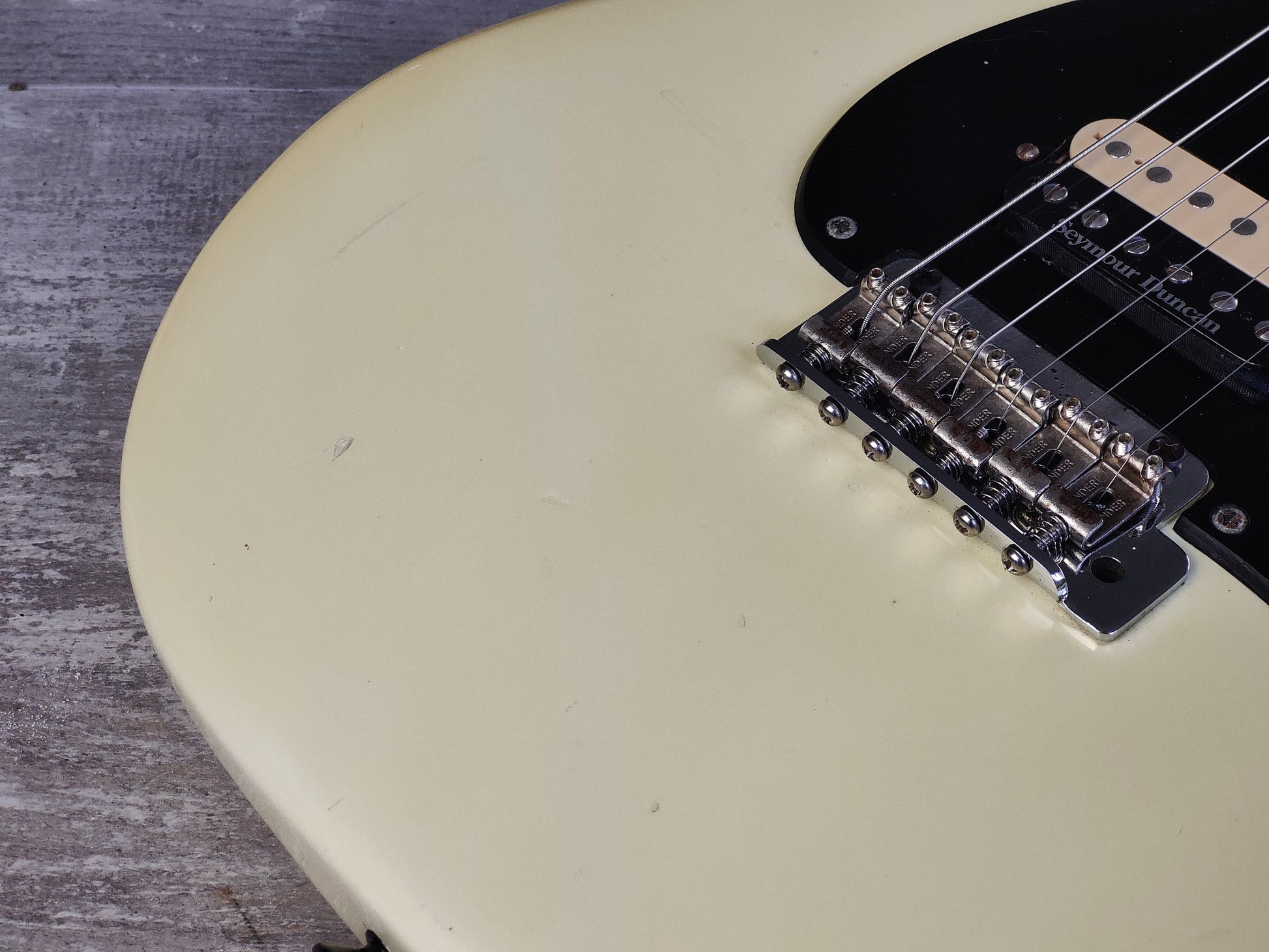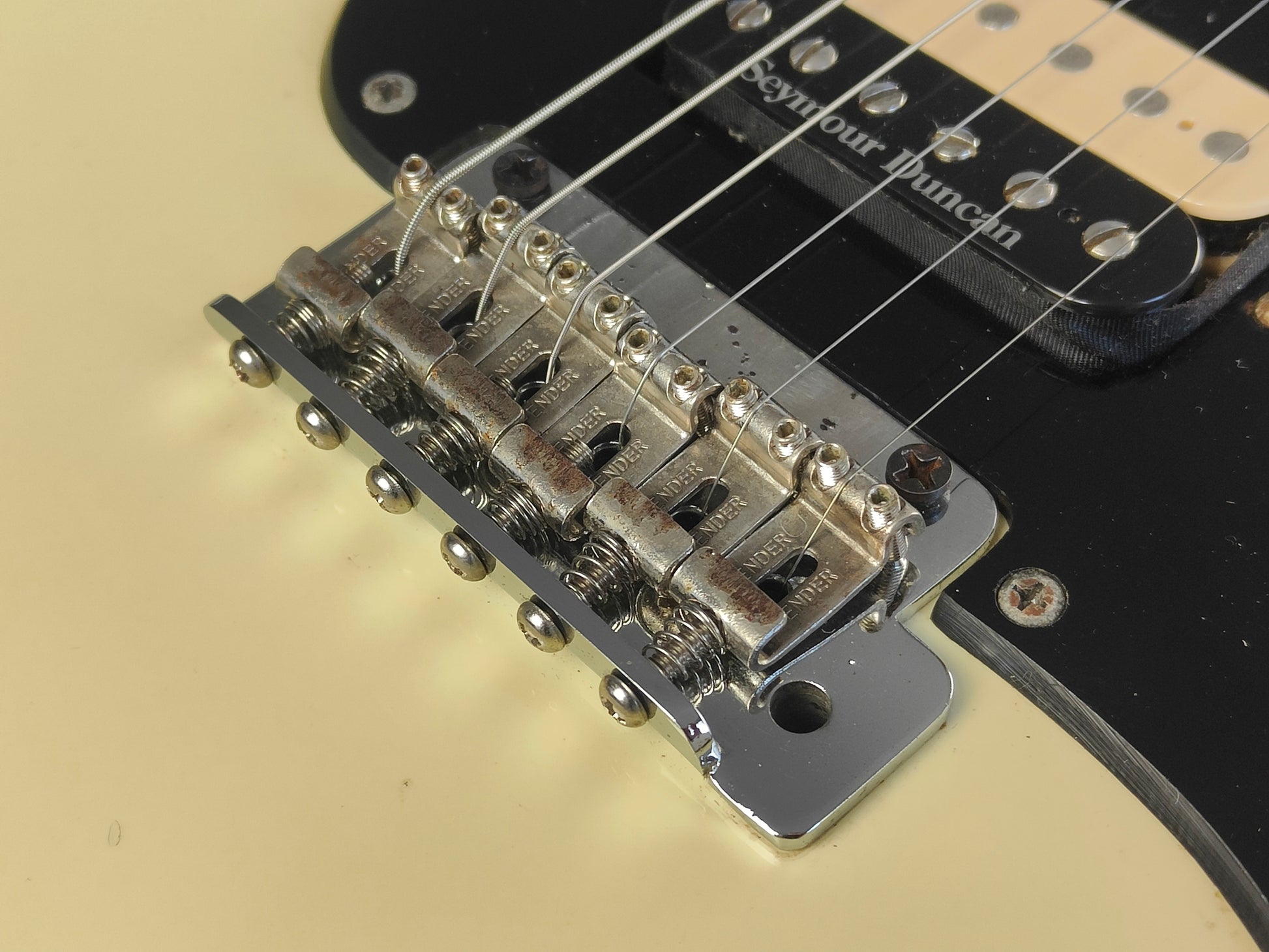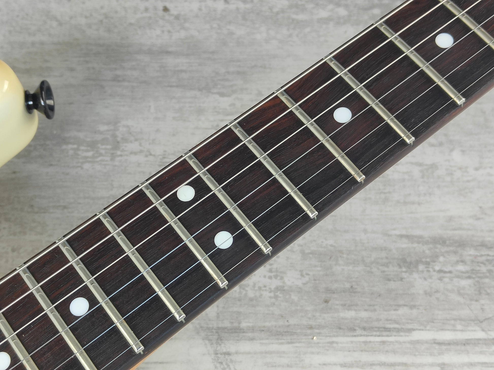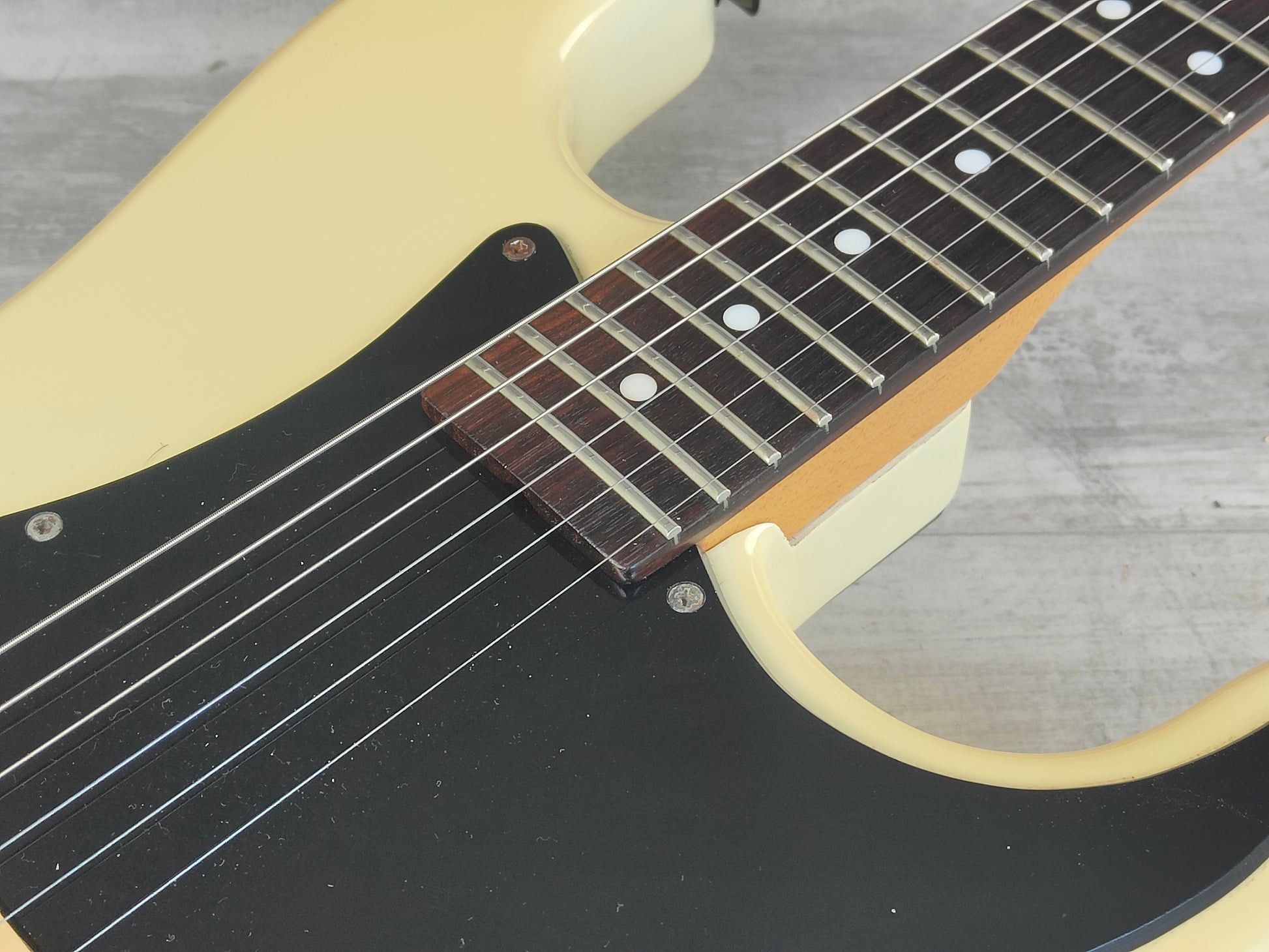 Aged white finish like the model he used for his 1983 San Francisco show, it's got a nice D style profile maple neck with a 22 fret rosewood fingerboard (40mm nut width, 648mm scale length) and weighs 3.3kg's.