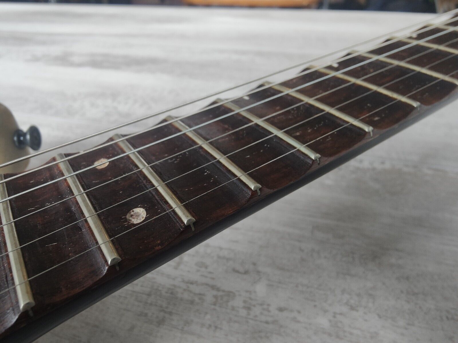 This one has had a very obvious amateur scallop job to the fretboard and had the finish removed from the body. It plays well as it sits and is perfect for those who love a guitar with a story to tell. Truss functions as it should and the frets have plenty of life left.