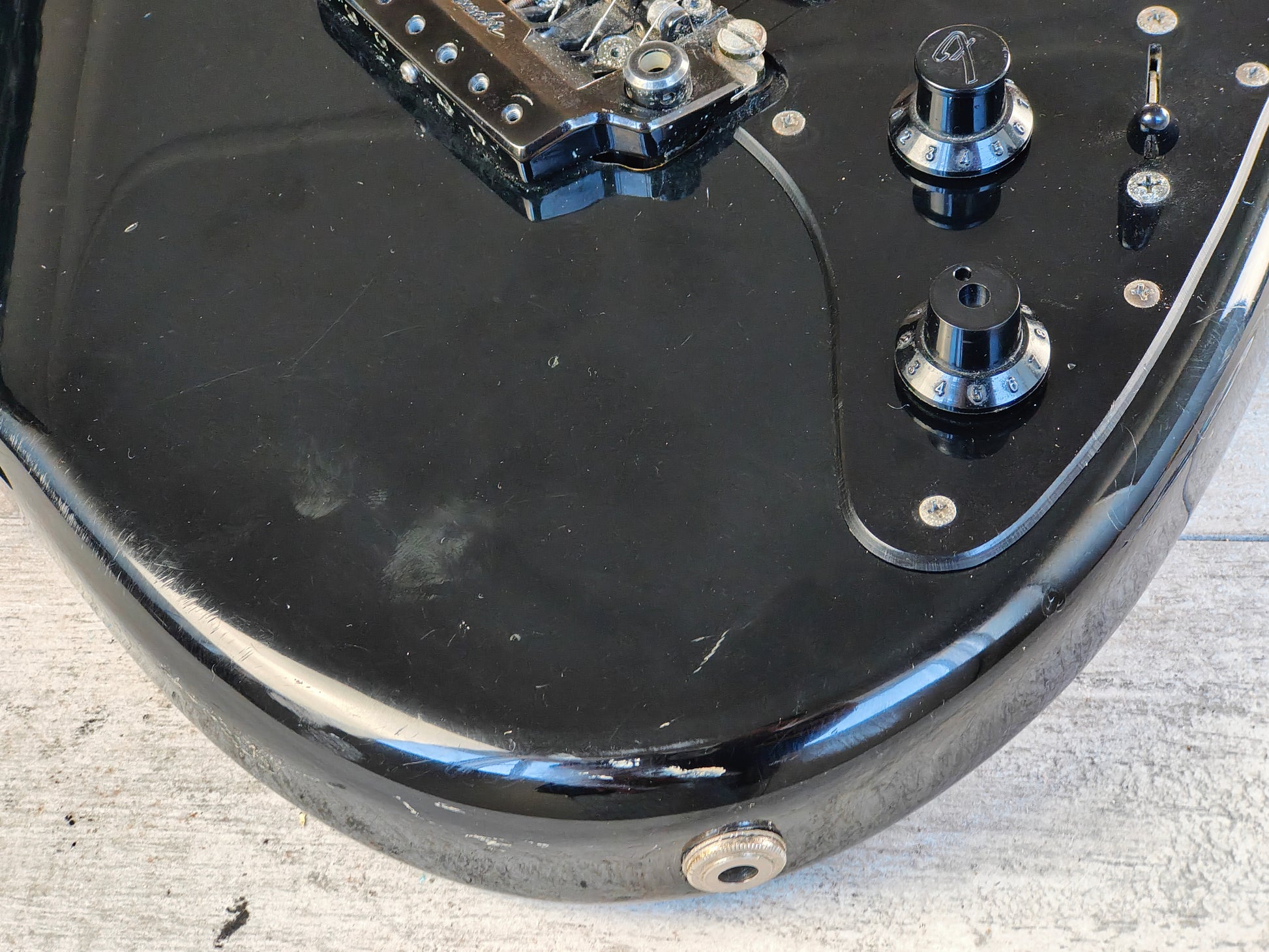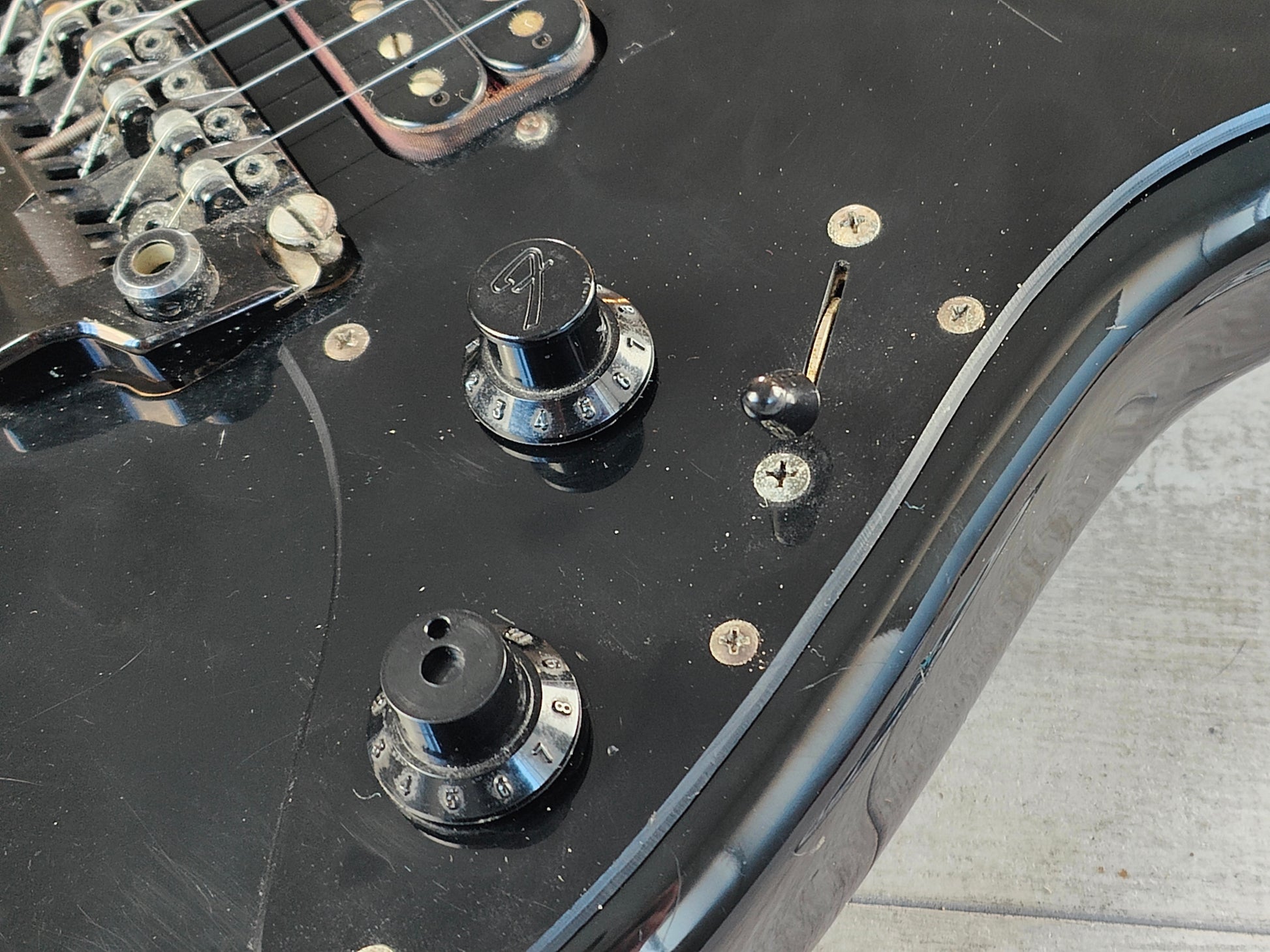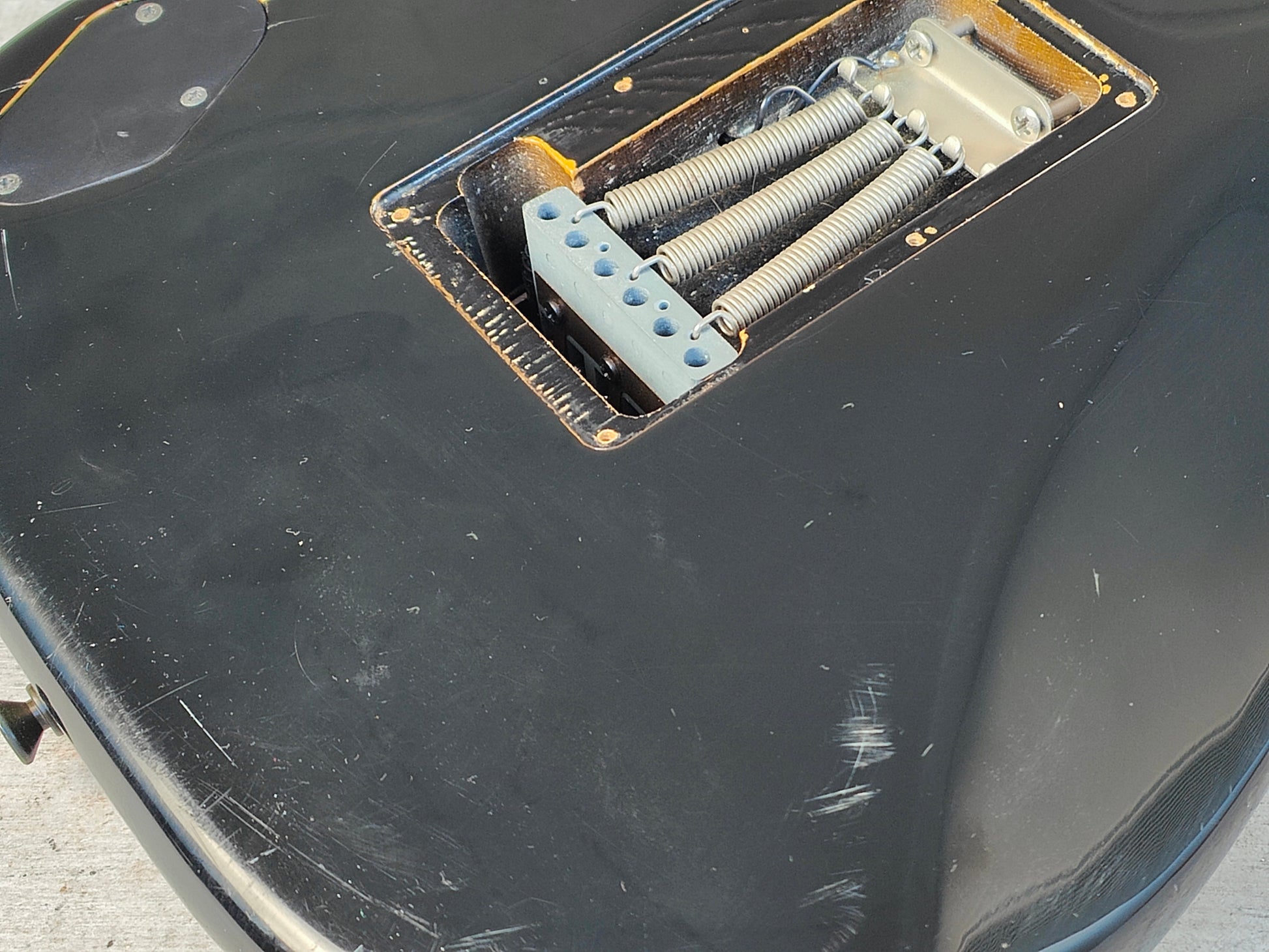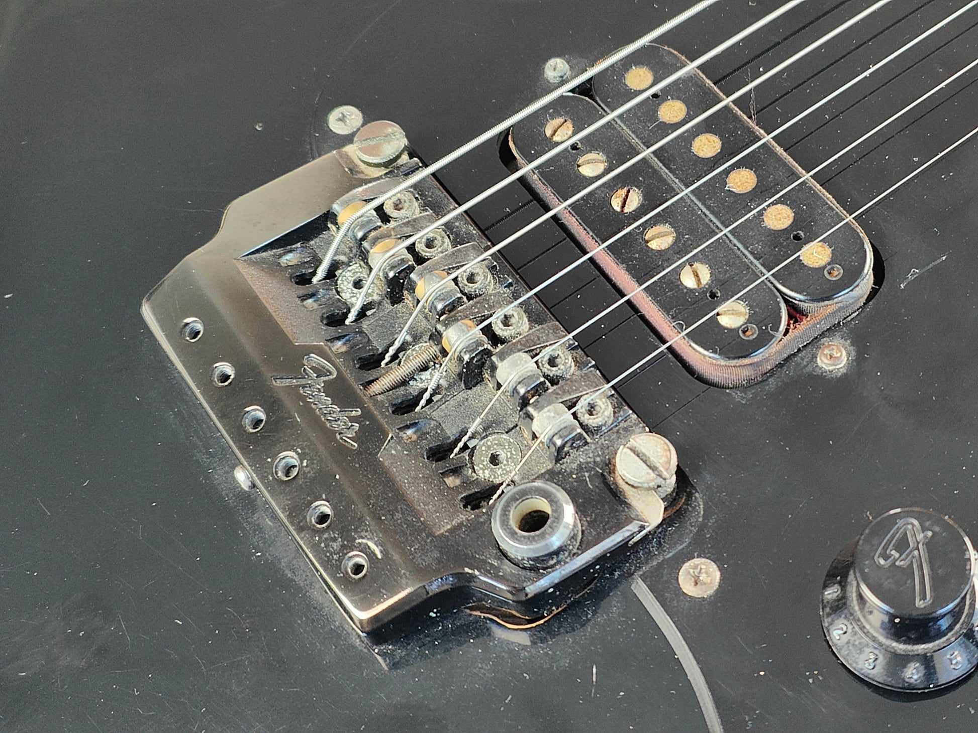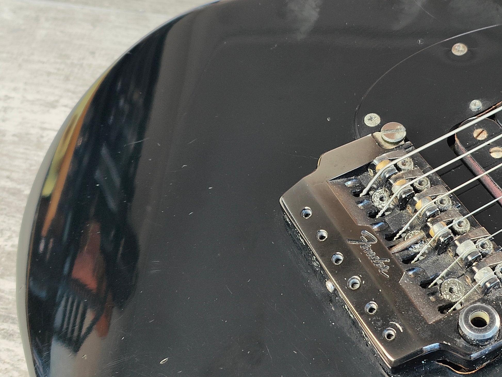 Full blackout aesthetic on the alder body with a C shape maple neck and a 22 fret rosewood fingerboard (12" radius, 25.5" scale length), it weighs 3.9kg's. Two Dragstar humbuckers with a three way switch, master volume and master tone control along with the original Fender Blade Shooter tremolo system (missing the fine tuners and arm but still functions perfectly well).