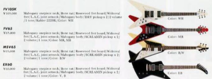 Made by the Fujigen factory in 1984 as part of Greco's "Metaliz" collection of hot-rodded Gibson style designs upgraded for the 80's audience, the Greco FV105K was a '67 reissue Flying V with a factory fitted Kahler.