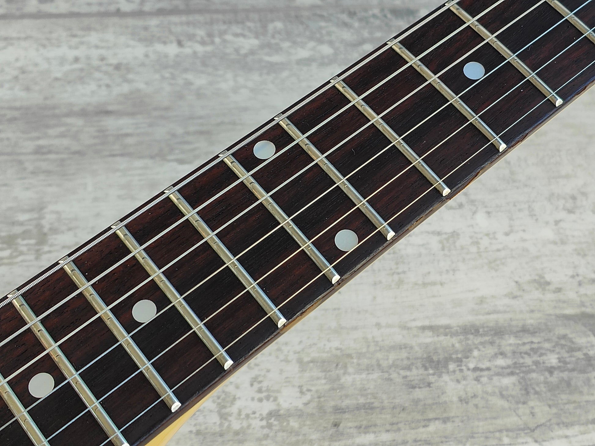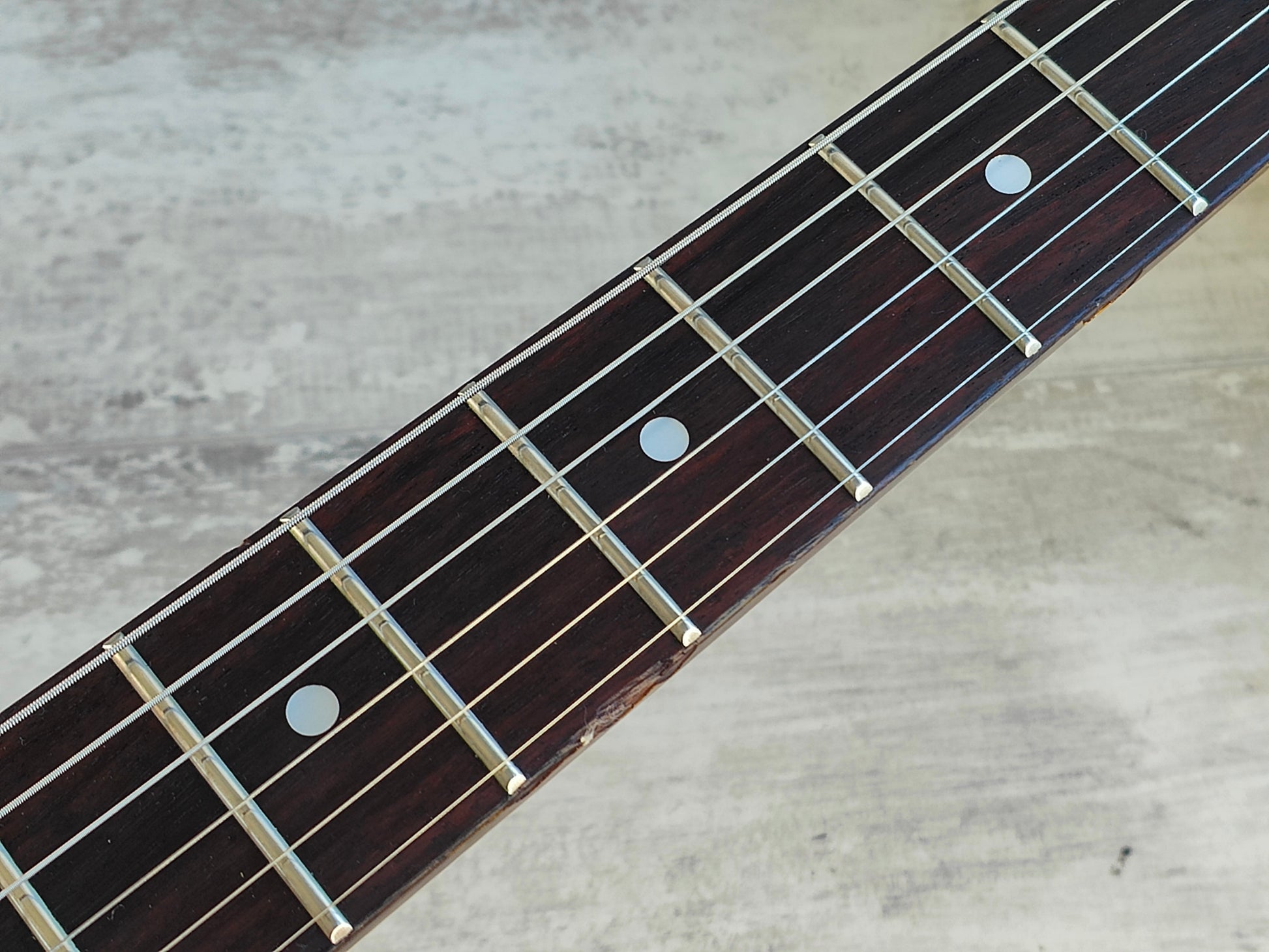 Mahogany body with a set one-piece mahogany neck and a 22 fret rosewood fingerboard (39mm nut width, 628mm scale length), it weighs 3.5kg's. Loaded with the original Kahler 2220K tremolo system, Greco stamped tuners and Maxon made humbuckers along with some new fine tuners and locking nut components.