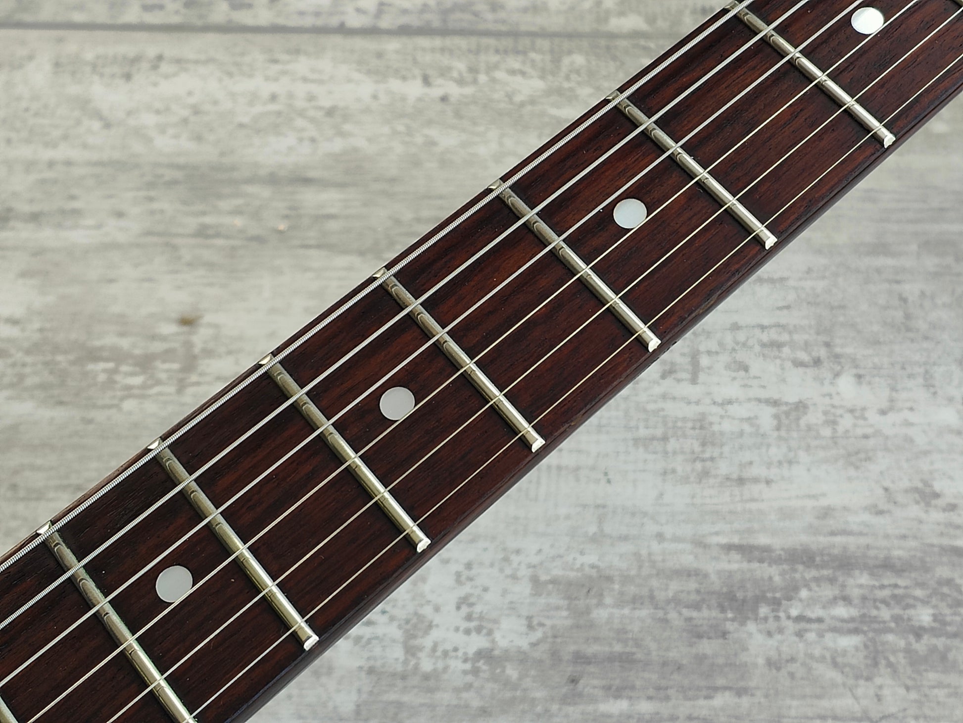 Featuring a solid mahogany body set to a mahogany neck with a soft V profile, rosewood 22 fret fingerboard (628mm scale length, 12" radius, 40mm brass nut), it weighs 3.6kg's. Loaded with a pair of Greco SCREAMIN' humbuckers and Greco stamped tuners, this one seems all original apart from the previously mentioned brass nut.