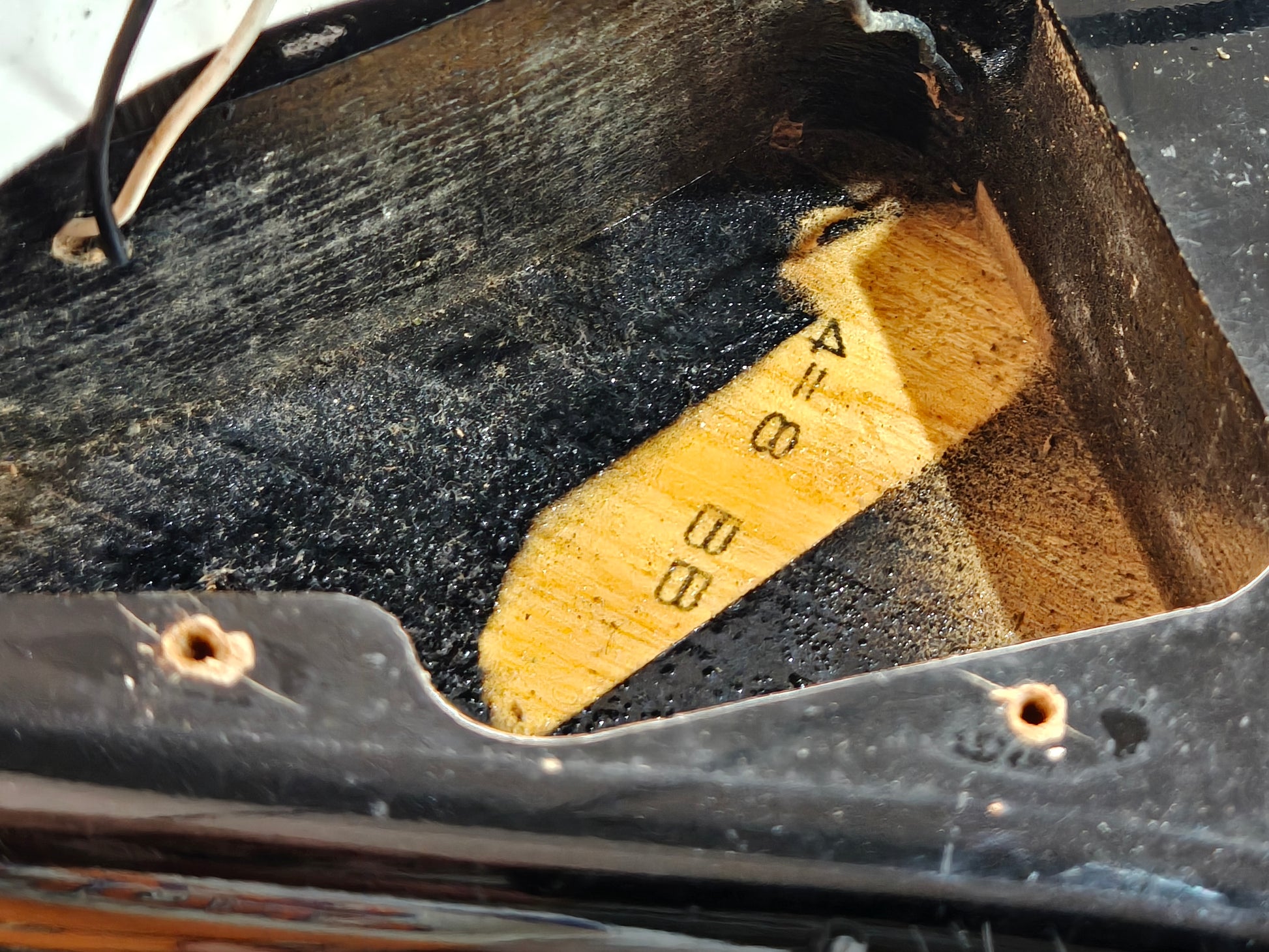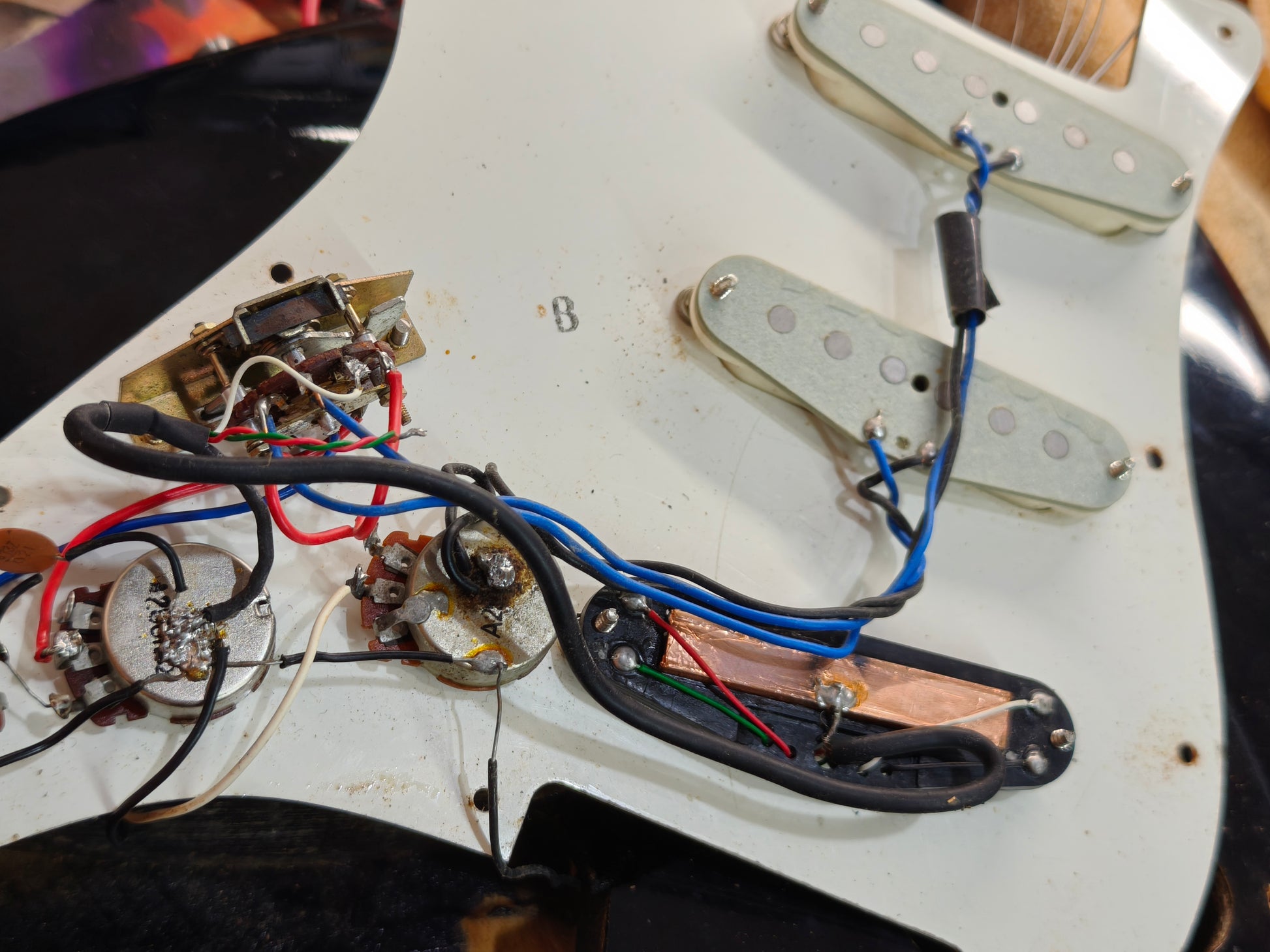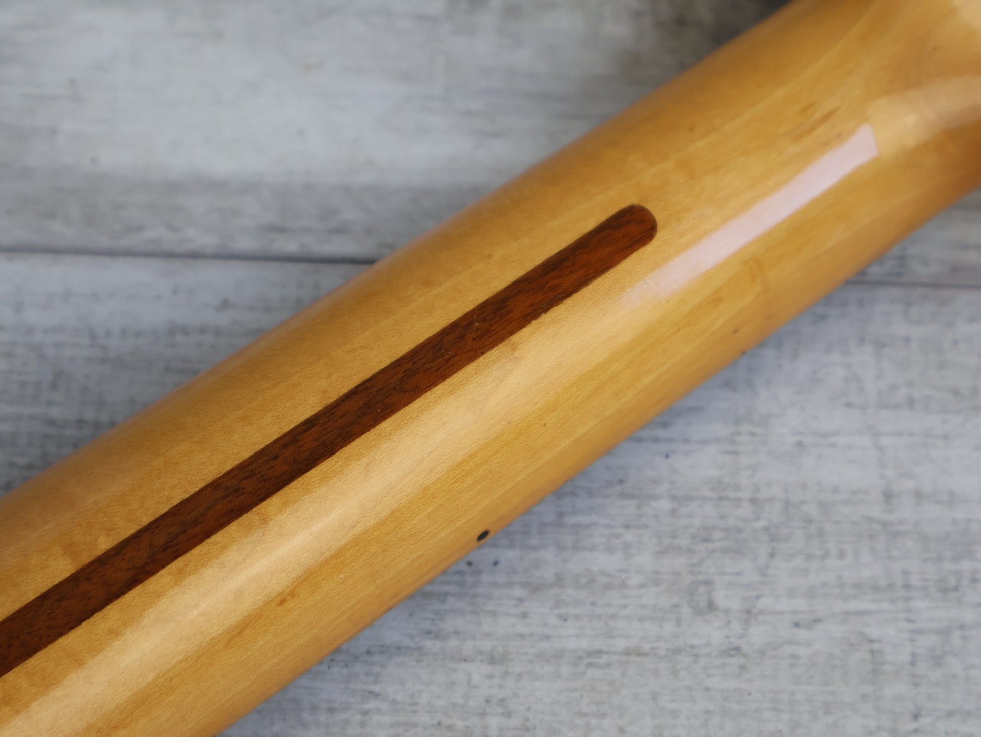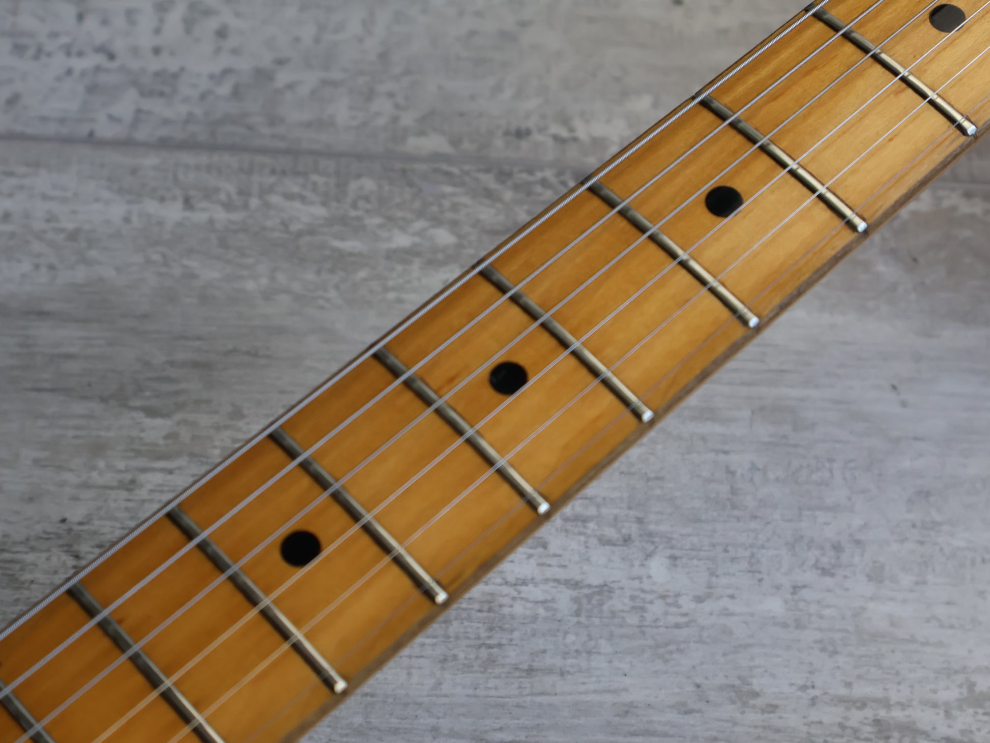 Made in Japan in 1984, the TSS-38 Silver Star was one of Tokai’s replicas of the CBS era Fender Stratocaster. Large headstock with a bullet truss and tilt adjuster on a three-bolt neck plate, it weighs 3.5kg’s. Alder body with a gloss black finish, one piece maple neck with a comfortable rounded C profile (40mm nut width), 21 fret maple fingerboard. Loaded with the original Tokai SS-HOT alnico pickups in the neck and middle positions and a generic rail humbucker in the bridge.
