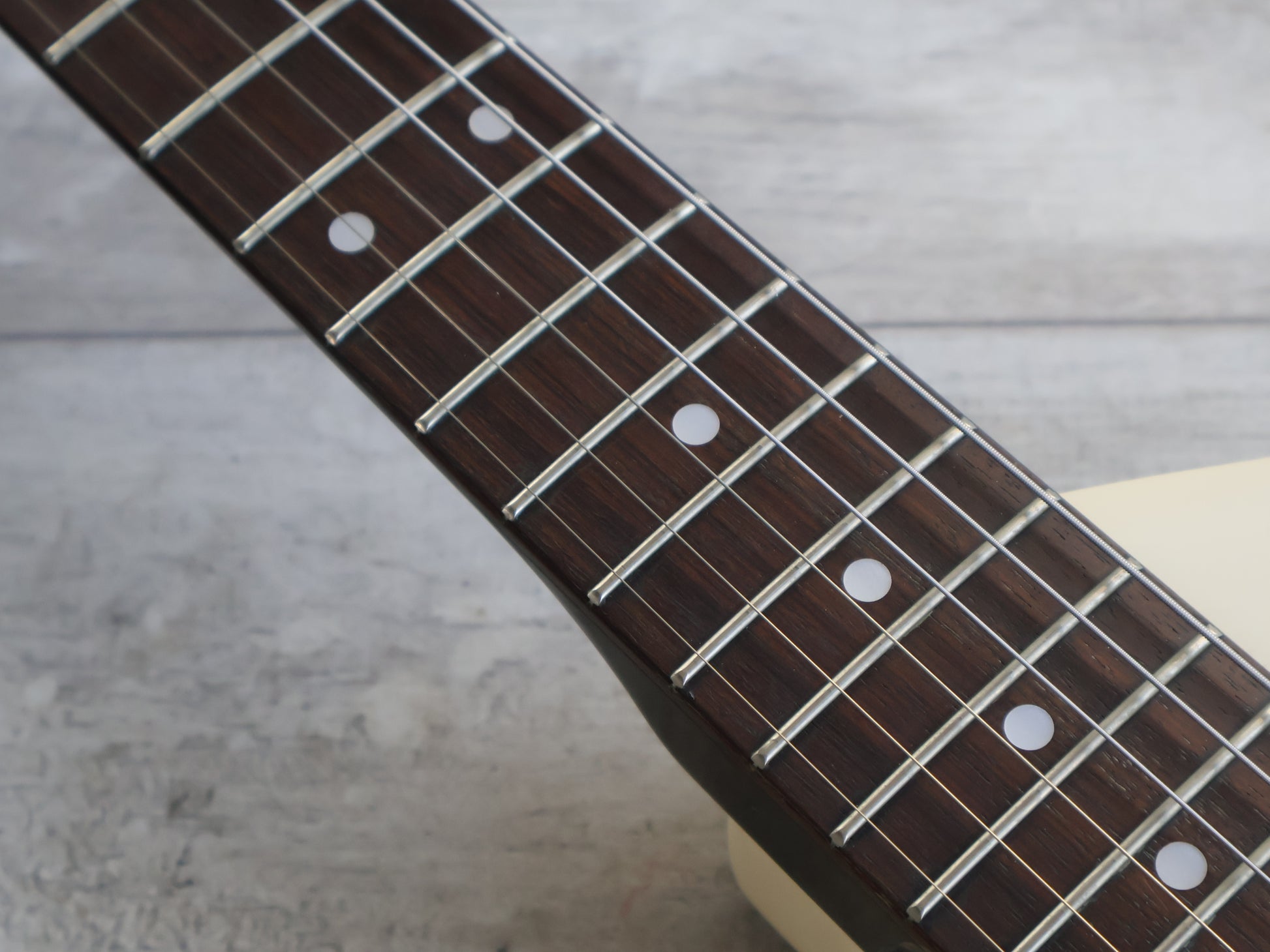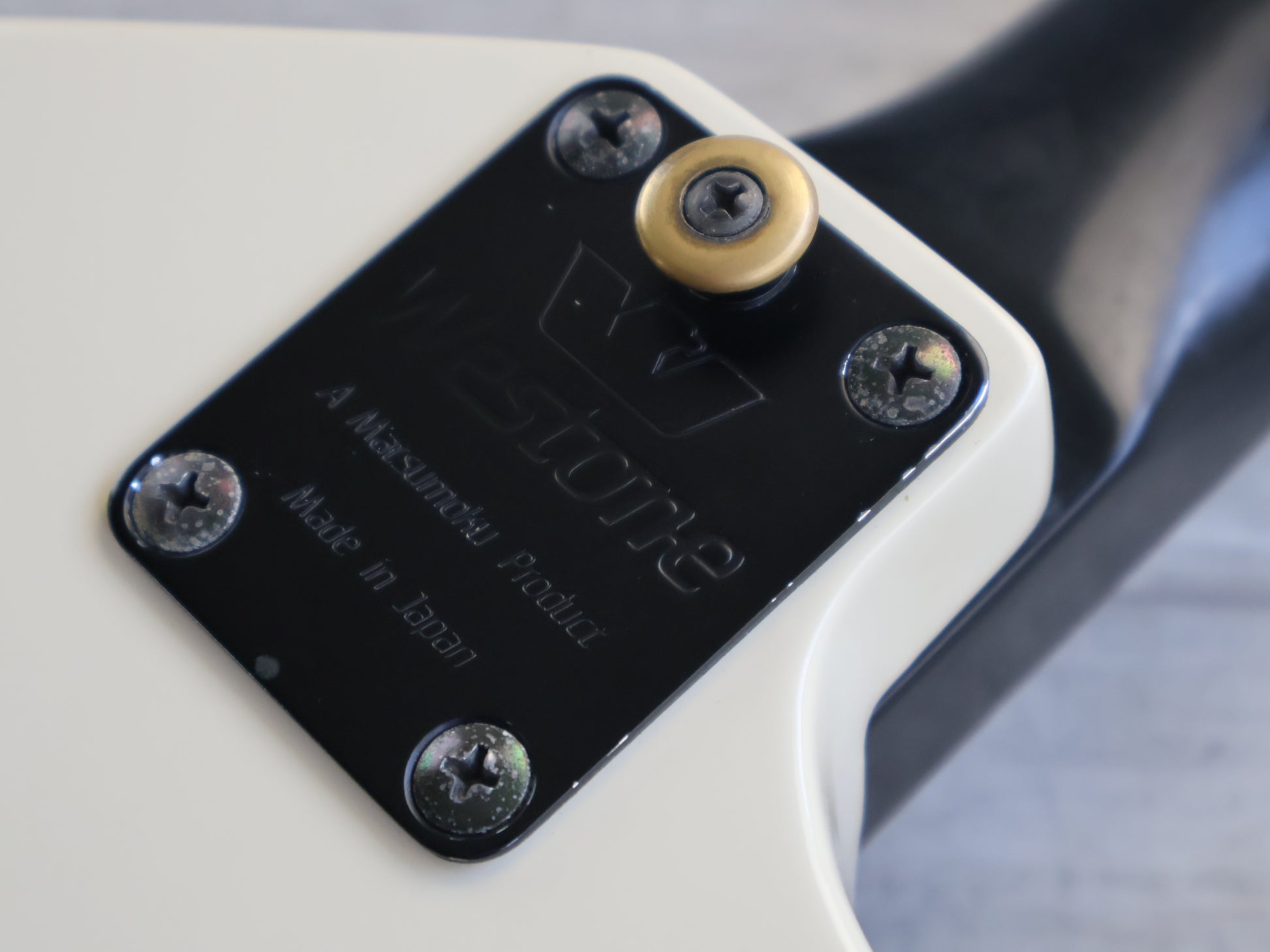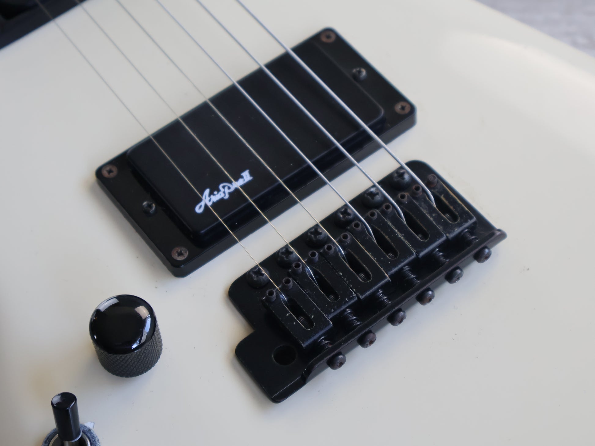 Weighs 3.2kg's and appears to wear a reasonably professional refinish to the body. One pickup was replaced with a passive Aria Pro II humbucker and the other is the original.