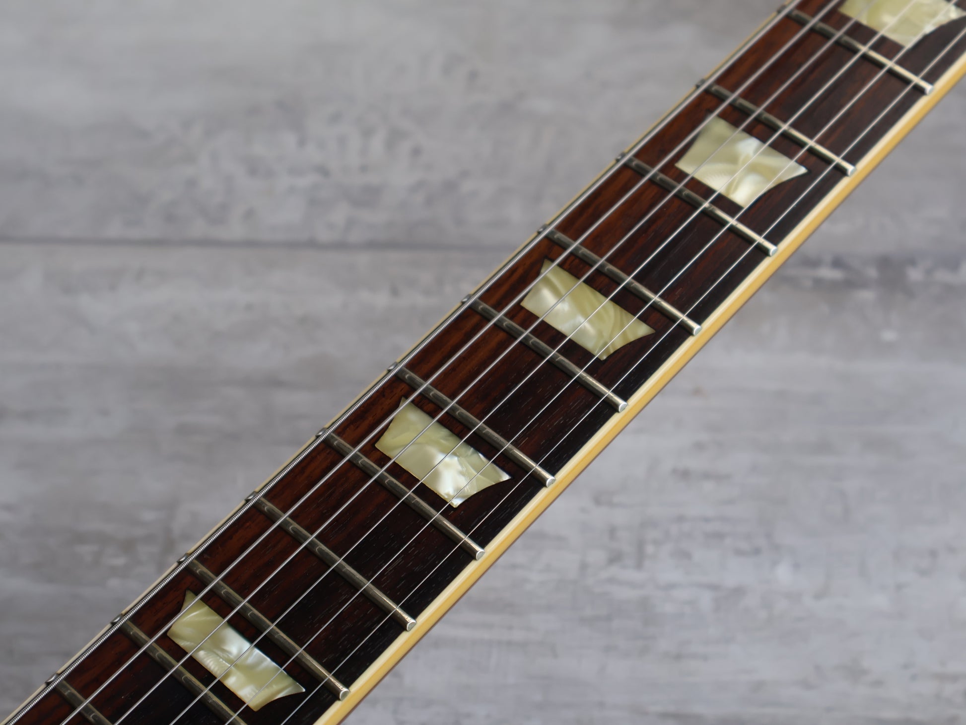 Made in Japan by Yamaha in the mid 1980's, the LP-500 was the mid tier level Les Paul model sold to the Japanese market featuring the full Gibson aesthetic. Mahogany body with a maple top and cherry sunburst finish, set mahogany neck with a 22 fret rosewood fingerboard (13.75" radius, slim 60's profile), weighs 4.2kg's. Yamaha Alnico V humbuckers with Kluson-style vintage tuners, it appears all original.