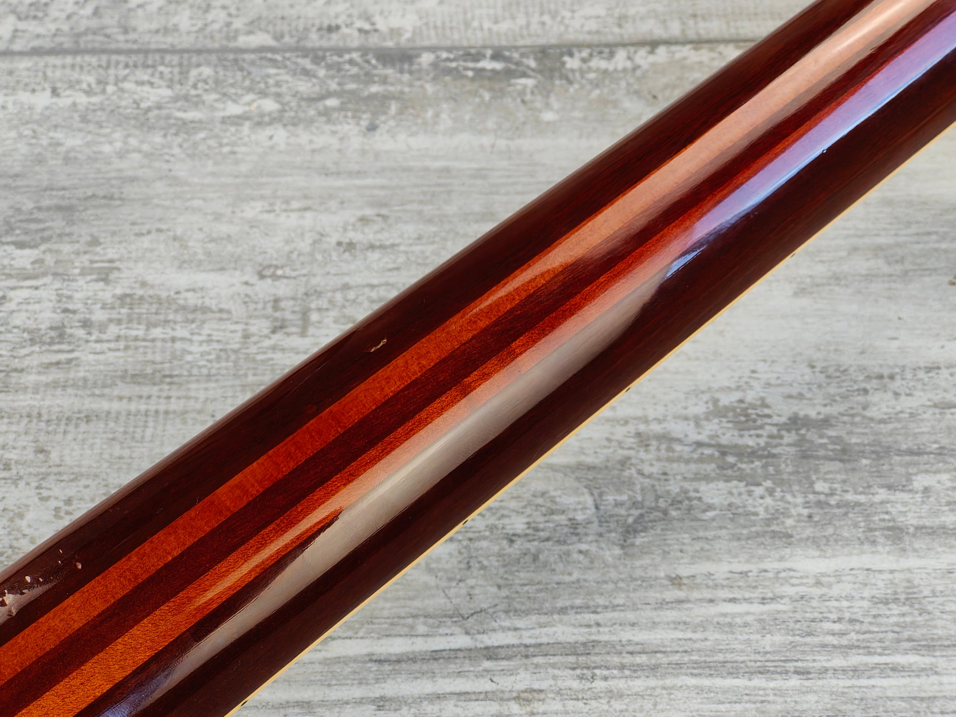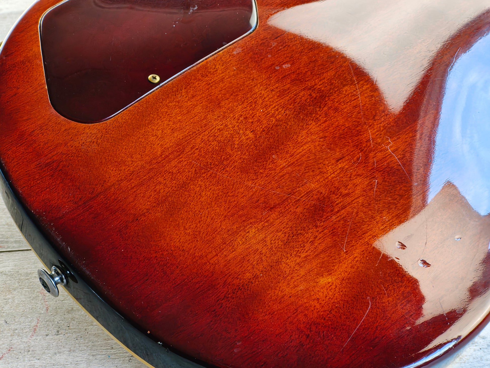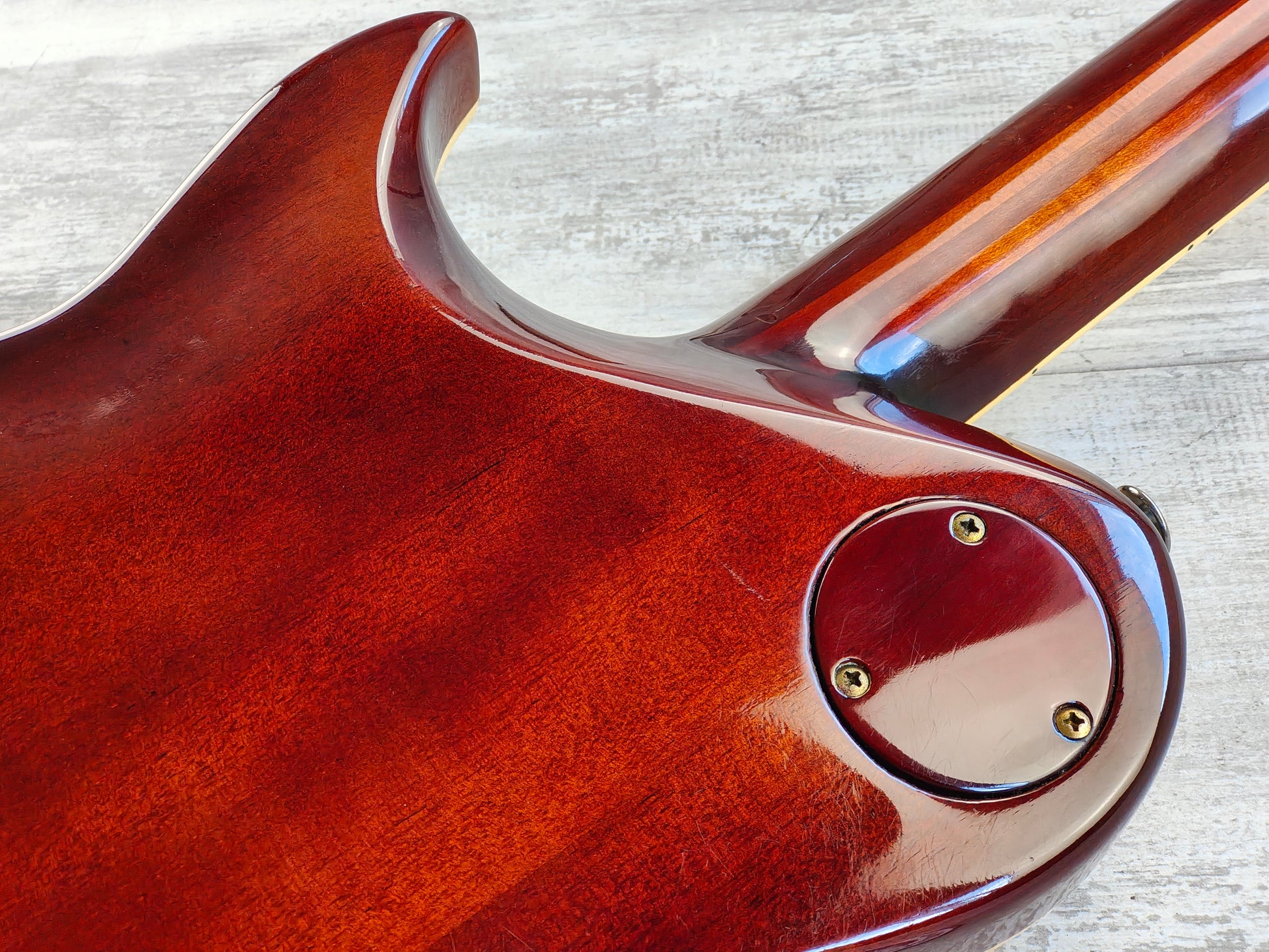 Factory loaded with a Kahler tremolo system (missing the locking nut) and Aria Pro II branded tuners, it's got the original "Classic Power" humbucker in the neck and a Seymour Duncan Alnico II Pro in the bridge.