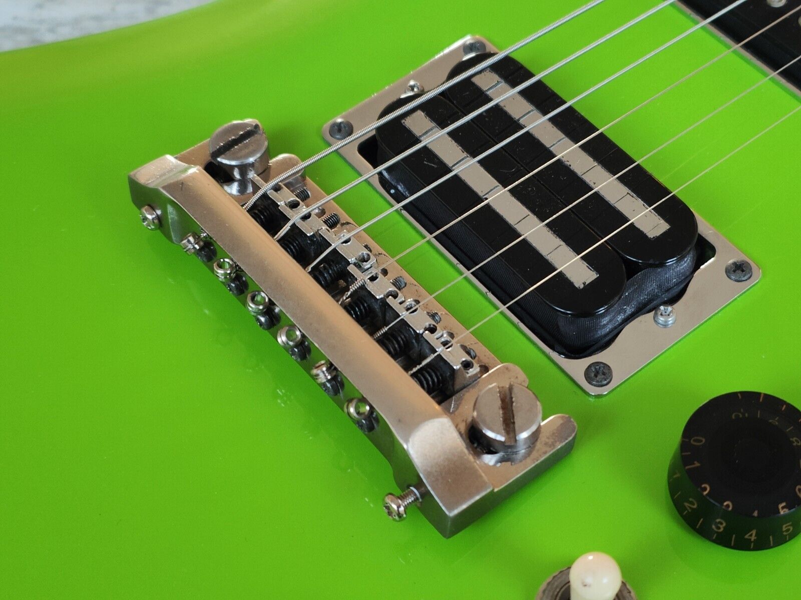From the BC Rich Japan catalog from the mid 1980's, this is the RMG-0 Mockingbird model that we had professionally refinished in what we're calling "Kermit Green". Slim maple body with a maple neck and 24 fret rosewood fingerboard, it weighs 3.2kg's. Loaded with two unbranded aftermarket humbuckers (a Super Distortion style in the neck and a Rail in the bridge) controlled by two volume controls and a master tone knob along with a three-way toggle and the original "Famous BC Rich Quadmatic Bridge".