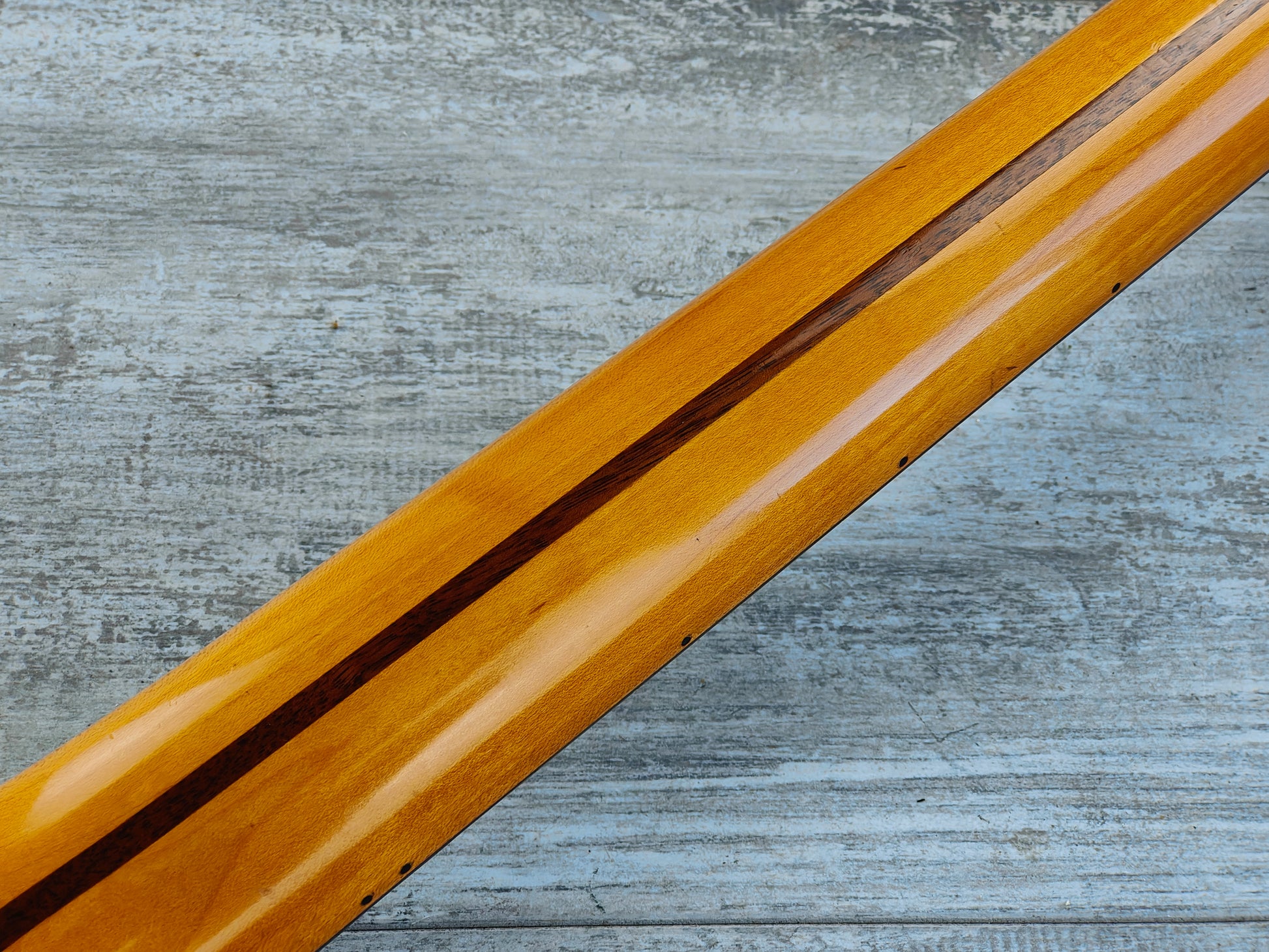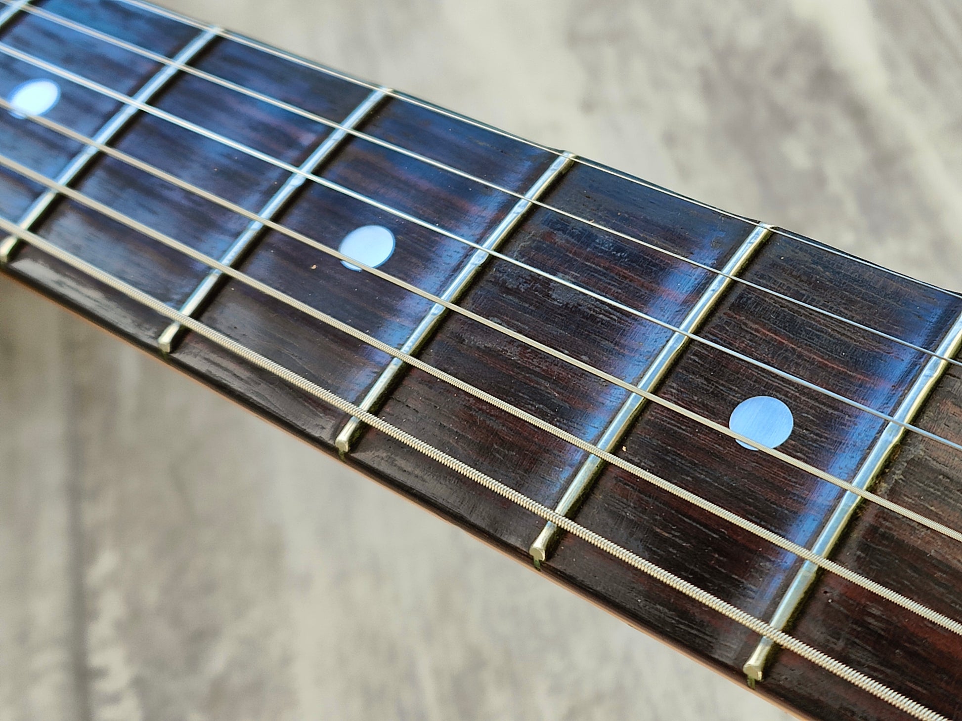 The neck is straight and the truss works as it should, the frets are worn and pitted but were polished and play smoothly, the neck is straight and the truss rod and micro-tilt both work perfectly.