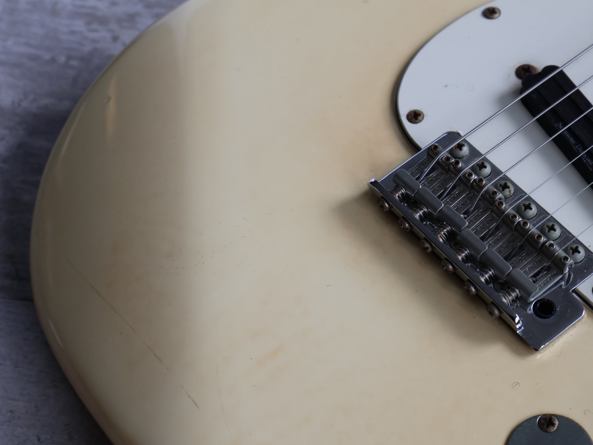Solid basswood body wearing a stained/faded Olympic White finish bolted to a maple neck with a 21 fret rosewood fingerboard, it weighs 3.4kg's. Loaded with the original neck and middle pickups with an aftermarket Seymour Duncan Hot Rail mini humbucker in the bridge with a coil split push/pull on the tone knob. The bridge was also replaced to a Wilkinson system at some stage.