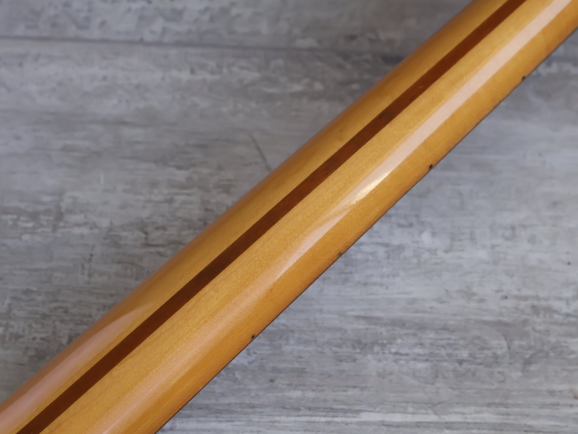 Solid body with a maple neck and 21 fret rosewood fingerboard (medium frets, 9.5" radius, three-bolt neckplate and a bullet truss adjustor), this one weighs 3.5kg's. The original hardtail bridge has the correct "F spaced" saddles and the original Fernandes pickups were modelled after the Duncan/Dimarzio combo found in "Whitey".