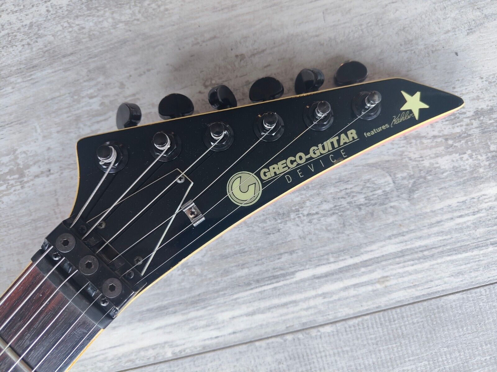 Made in Japan in 1985 to compete with the popular Jackson and Charvel superstrat models of the time, the JJ-1 was Greco's fully loaded HSS shredder. Factory Kahler USA tremolo system and Grover tuners, these were also factory loaded with two Jackson USA single coils and a Maxon DRY humbucker controlled by individual three-way mini toggles. 24 fret rosewood fingerboard with dot inlays, 628mm scale length with nice big frets. Weighs 3.4kg's.