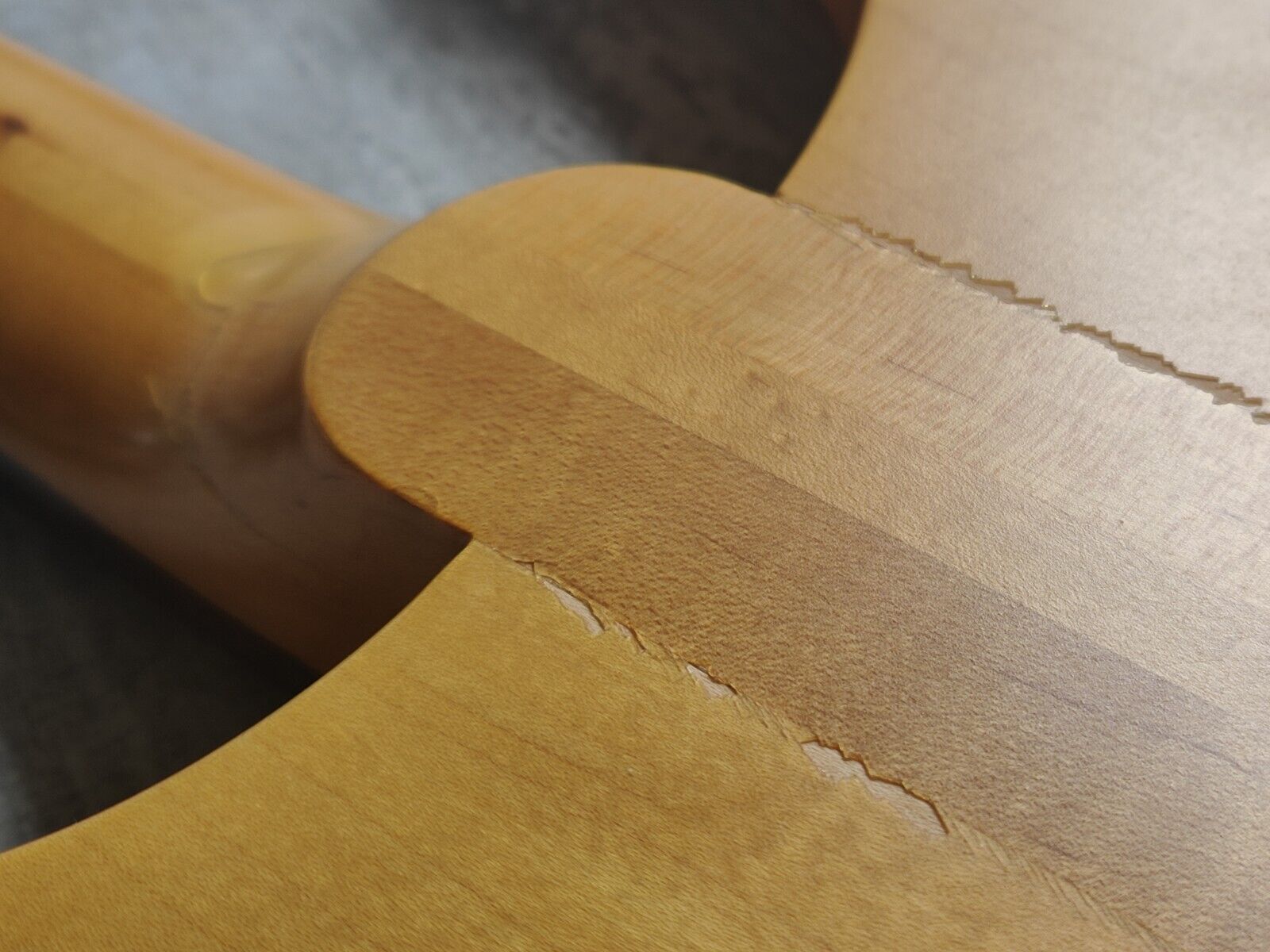 Overall it's a pretty clean bass with the exception of a small neck heel break/repair that occurred on its original journey to us. A small compression crack from pressure on the headstock opened the area up slightly, we had it injected with glue and clamped for an extended period so it's now purely cosmetic. If you had the bass refinished then the crack would be undetectable. It was given a full service and setup prior to listing and seems all original except for the missing bridge pickup cover.